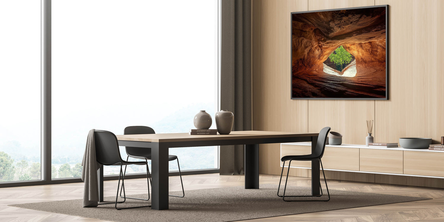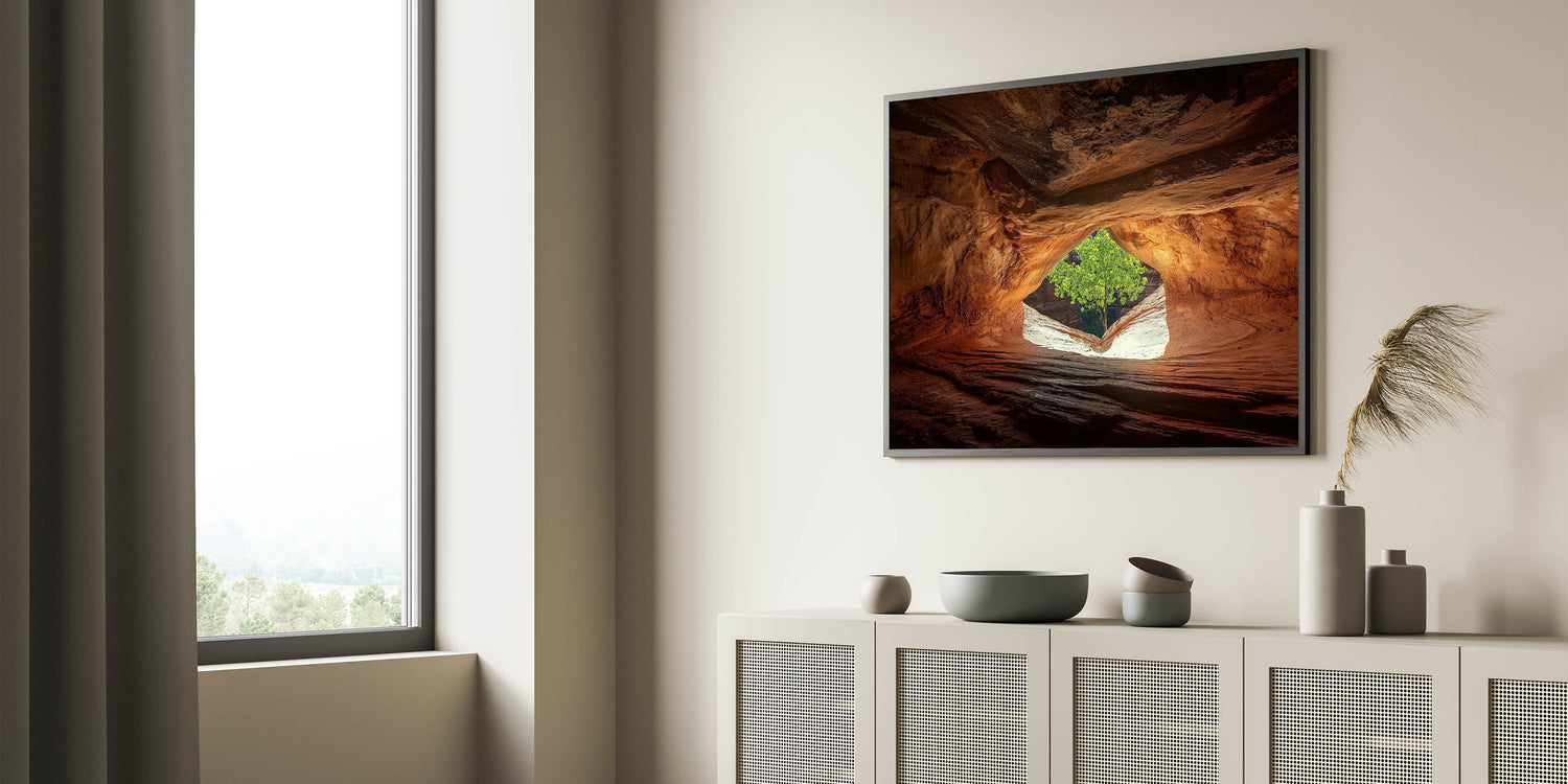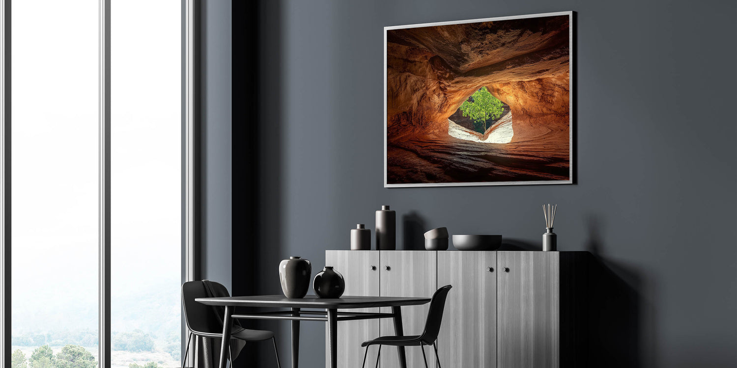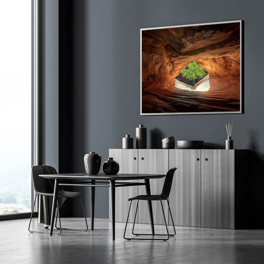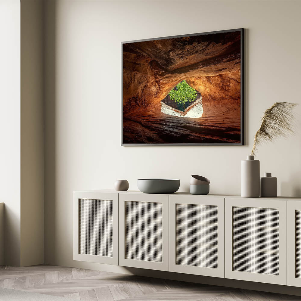 Bring the beauty of nature into your home with this captivating cave view wall art. This high-resolution photograph captures the serene elegance of a vibrant green tree framed perfectly by the natural contours of a cave opening. The rich, warm tones of the cave walls contrast beautifully with the lush greenery outside, creating a harmonious and tranquil scene. Perfect for nature enthusiasts and decor lovers alike, this artwork adds depth and inspiration to any space.
