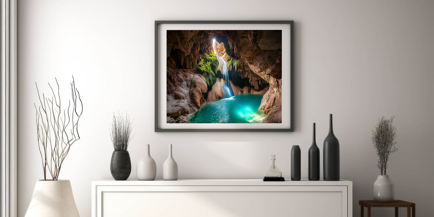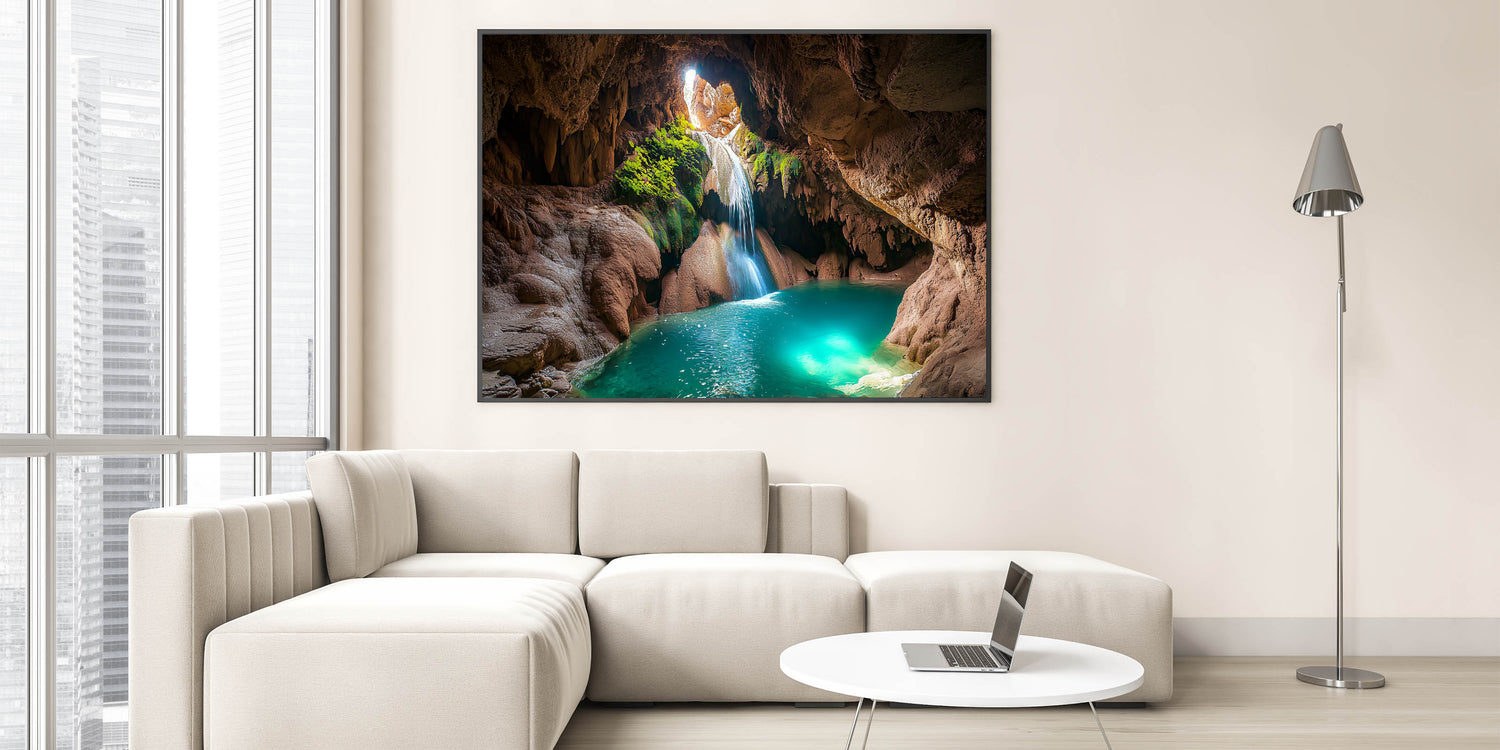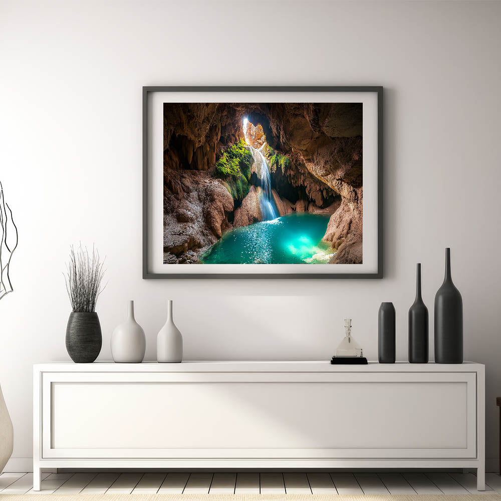 Elevate your decor with this captivating cave wall art featuring a hidden waterfall cascading into a serene turquoise pool. The lush greenery and soft natural light filtering through the cave entrance create a breathtaking scene of tranquility. This artwork beautifully captures the harmony of water, light, and stone, making it a perfect choice for modern, rustic, or nature-inspired interiors.