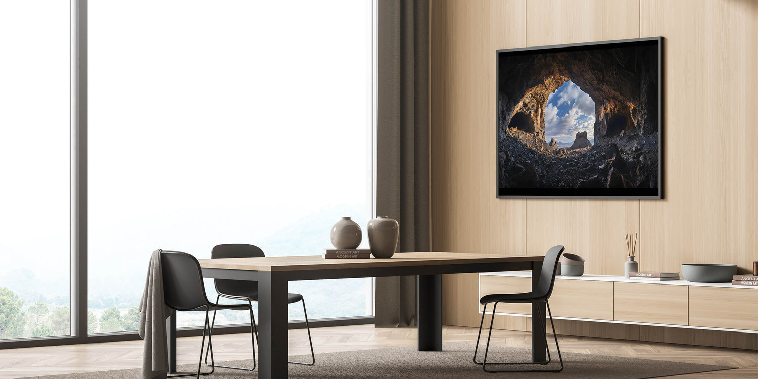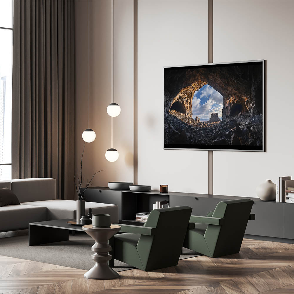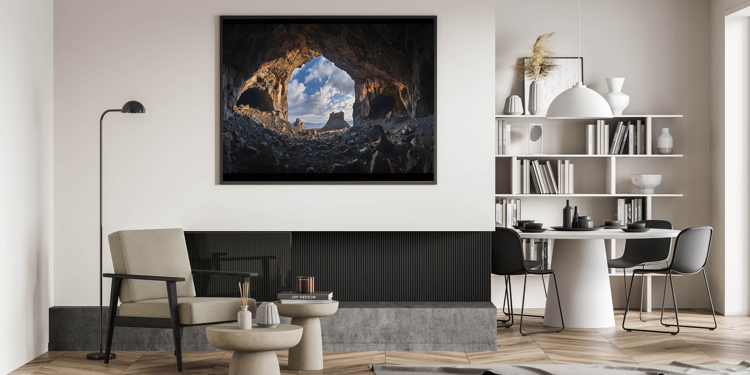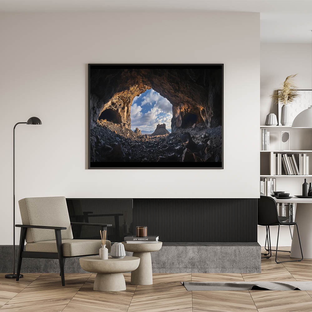 Bring the majestic beauty of nature into your home with this striking cave wall art. Featuring a breathtaking view from inside a cave, the composition captures the rugged textures of the cave walls framing a dramatic sky and distant rock formations. The intricate details and natural lighting make this piece a captivating focal point for any room.