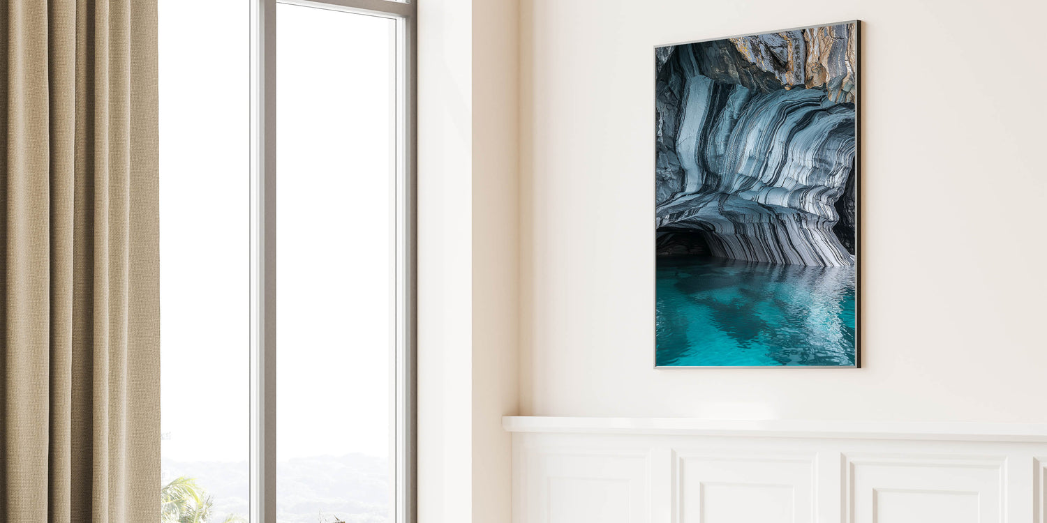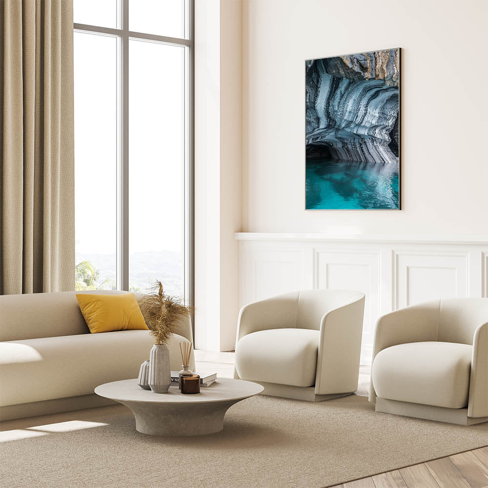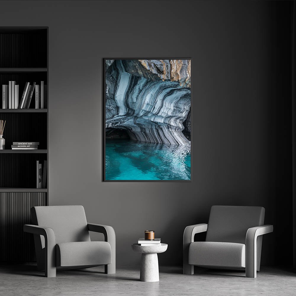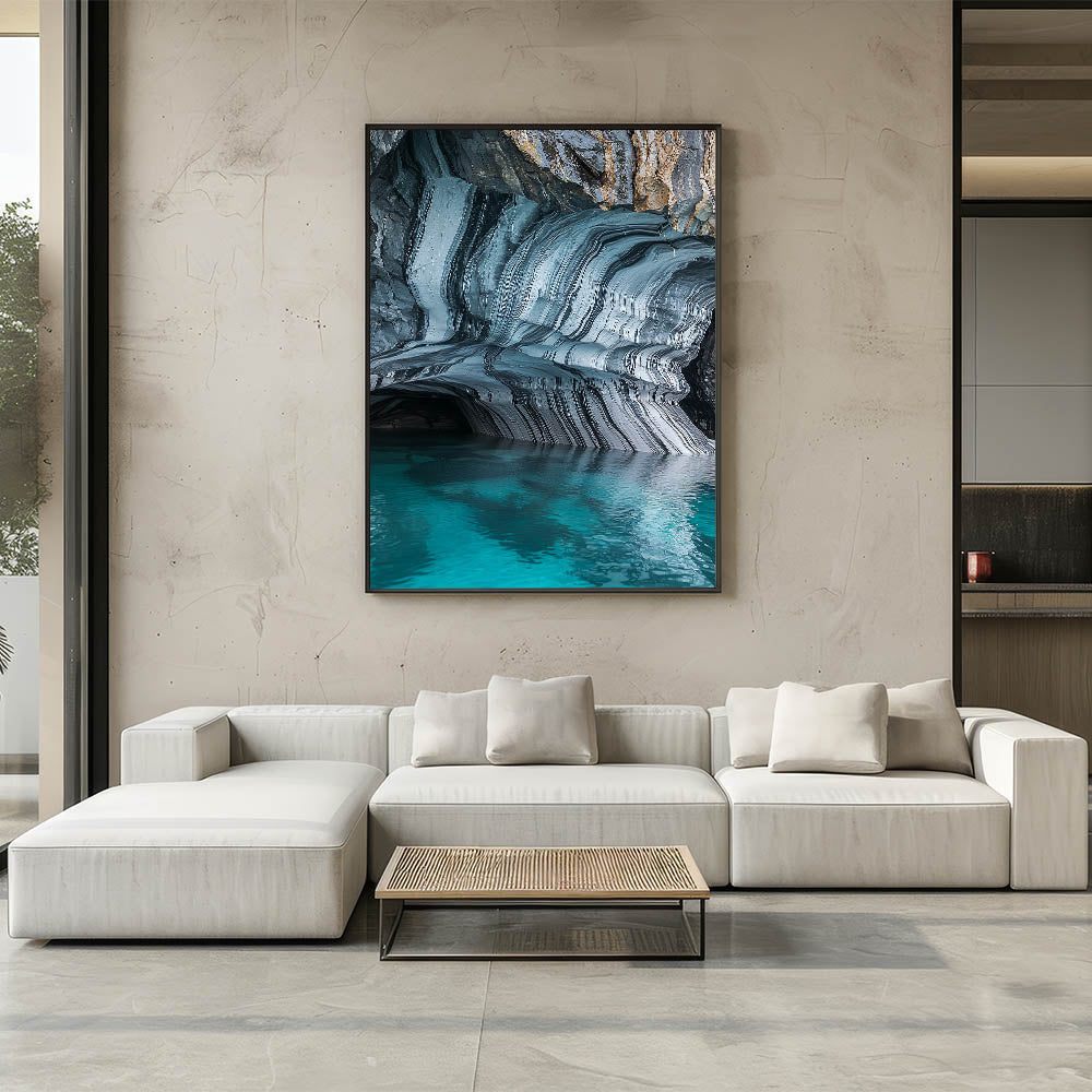 Bring the natural beauty of marble caves into your space with this stunning cave wall art. Featuring mesmerizing striations of gray and white, contrasted by the tranquil turquoise waters, this artwork captures the timeless elegance of natural rock formations. Perfect for modern or coastal interiors, this piece evokes a sense of calm and wonder.