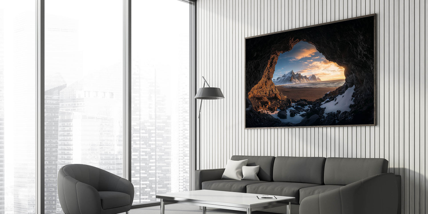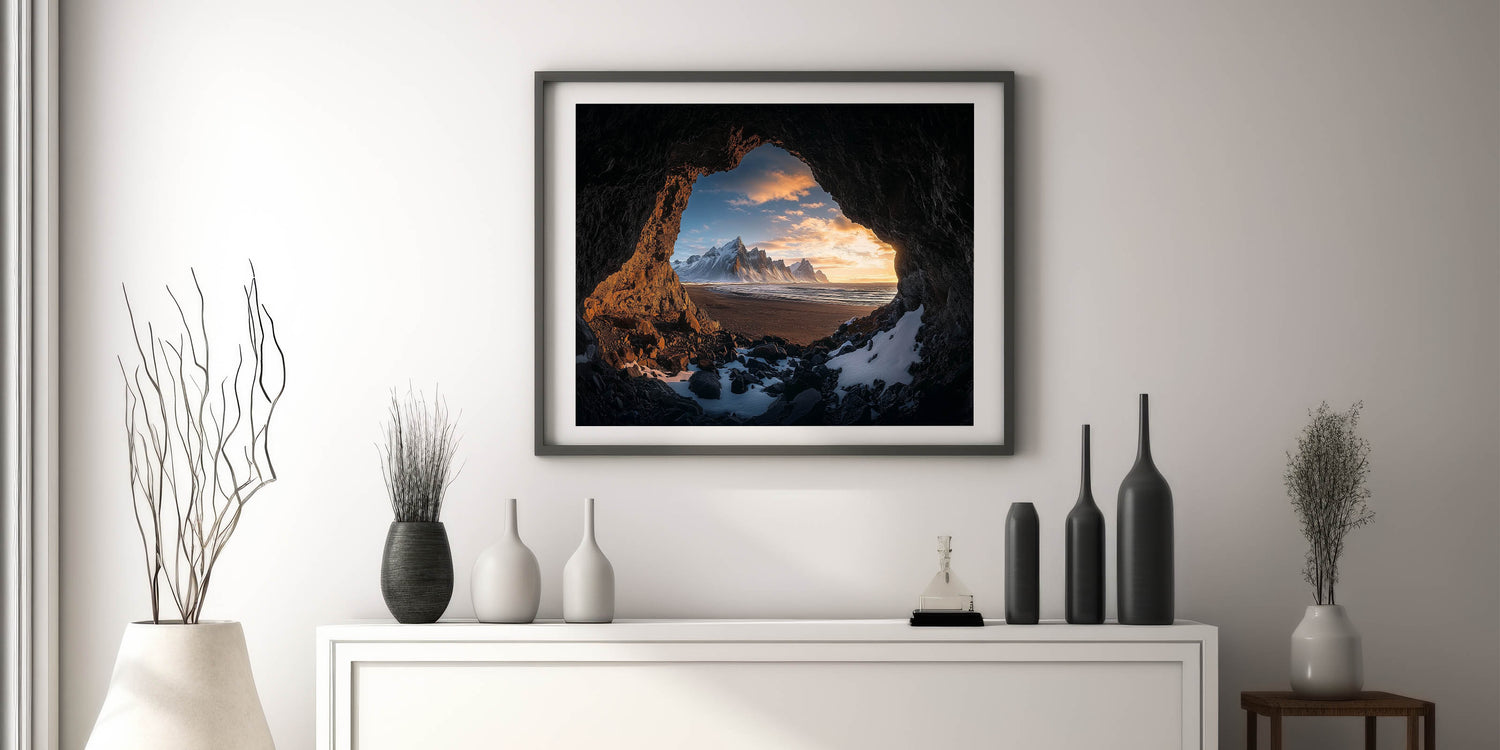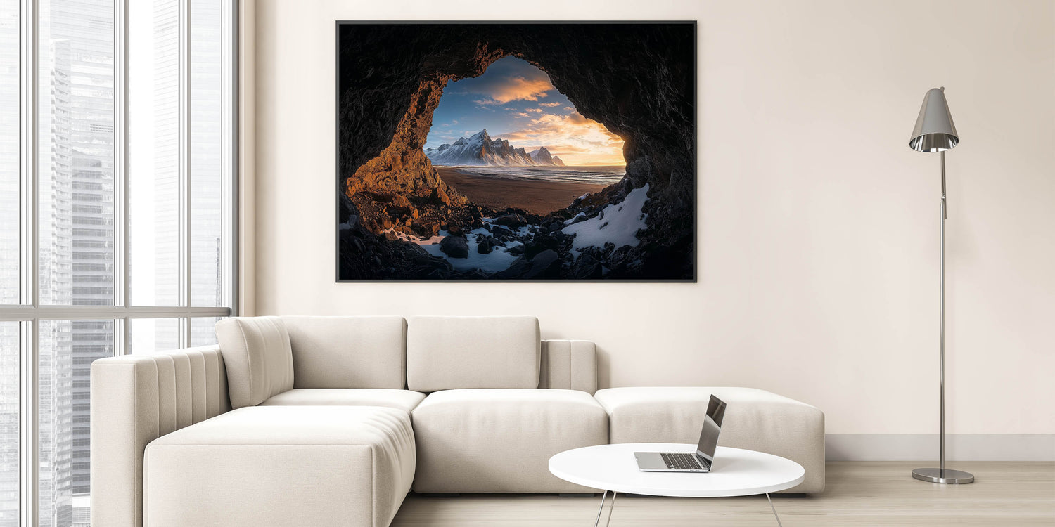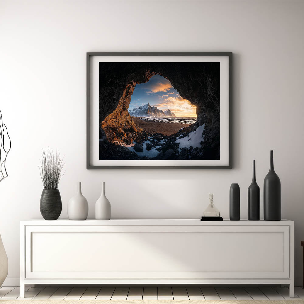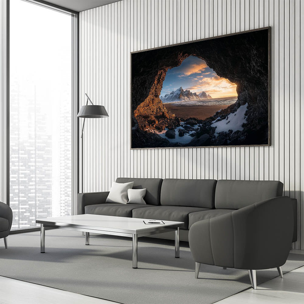 • High-resolution print showcasing a mountain sunrise framed by a coastal cave.
