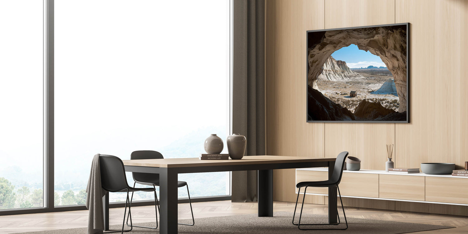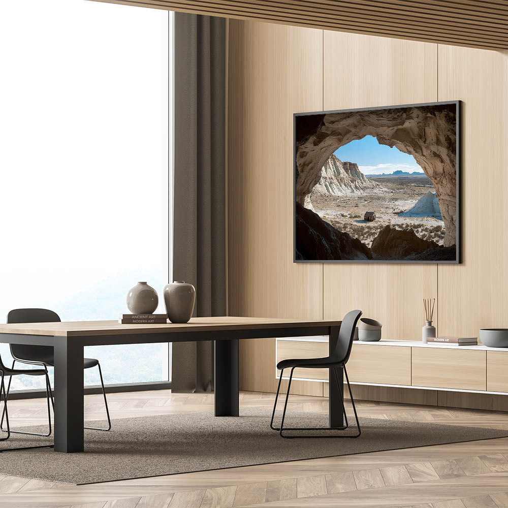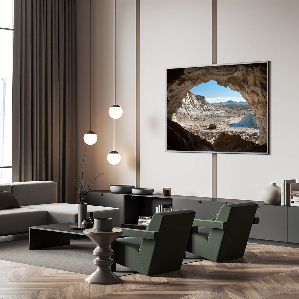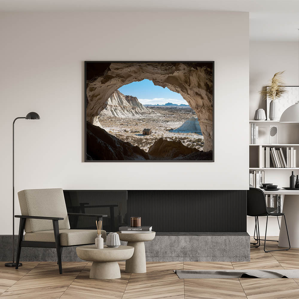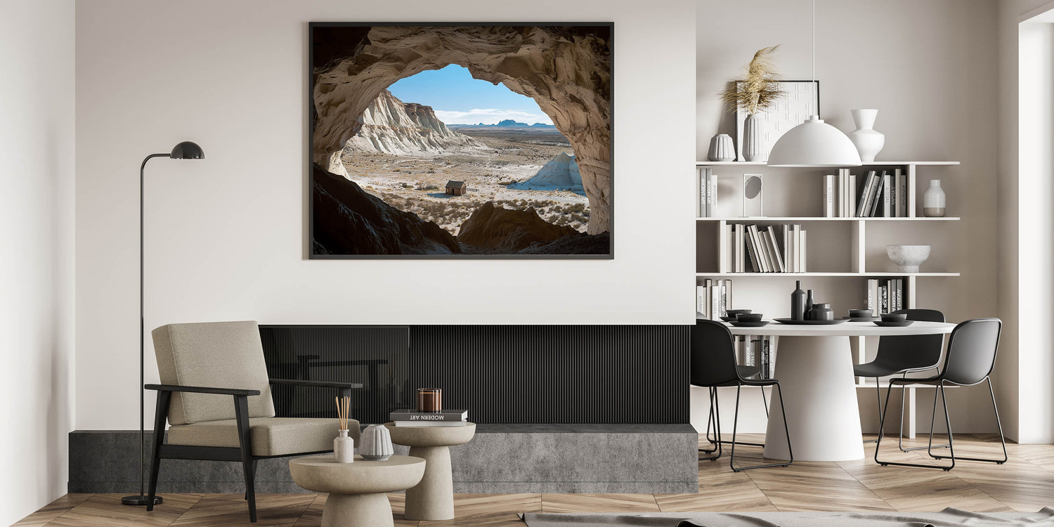 Transform your home with this stunning cave wall art, showcasing a breathtaking view of a rustic landscape framed by the natural beauty of a cave's interior. This piece brings the allure of underground caves and vast open landscapes directly into your space, offering a serene escape into nature.