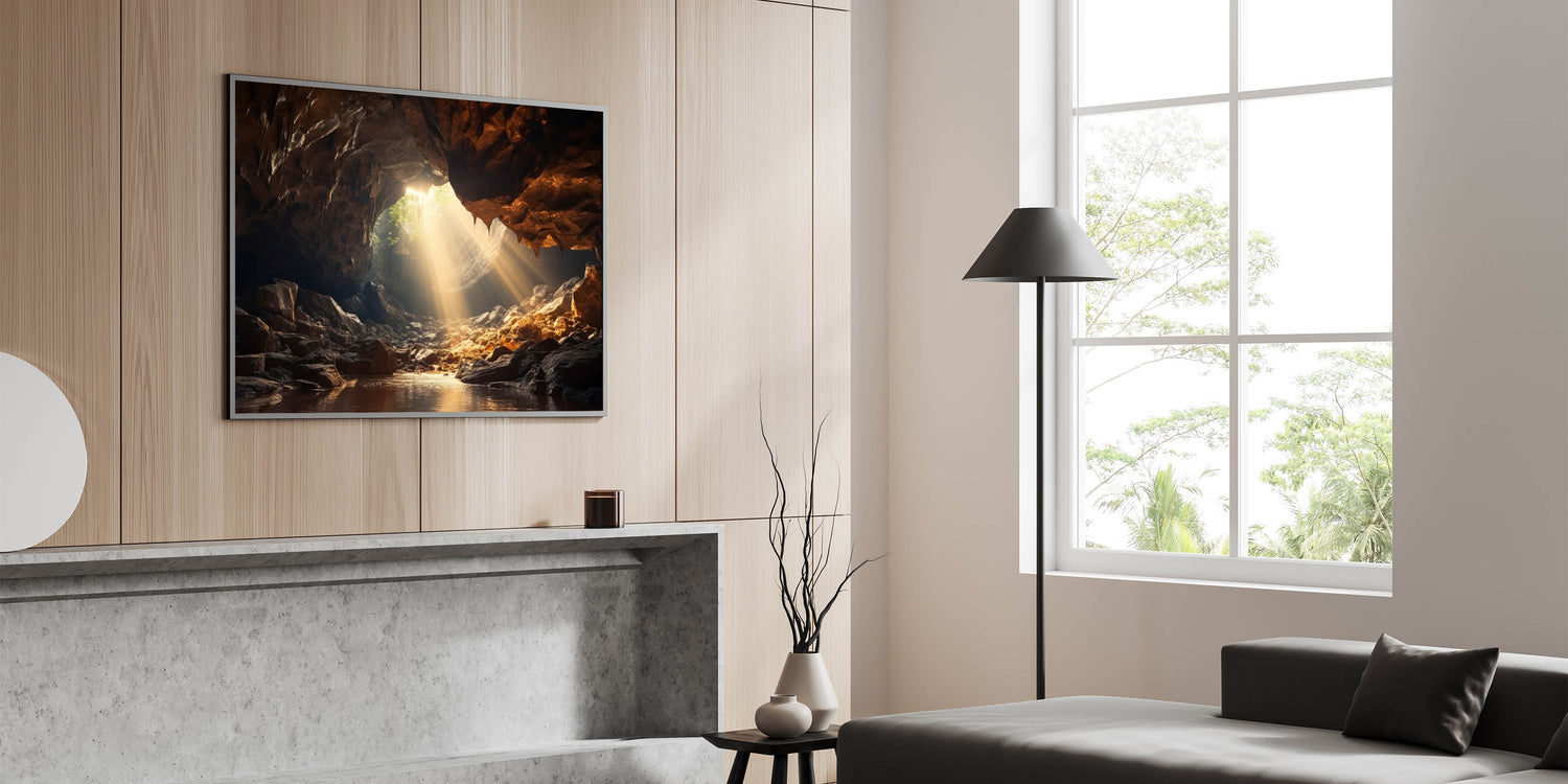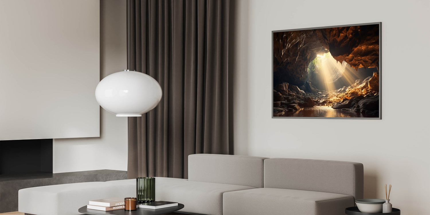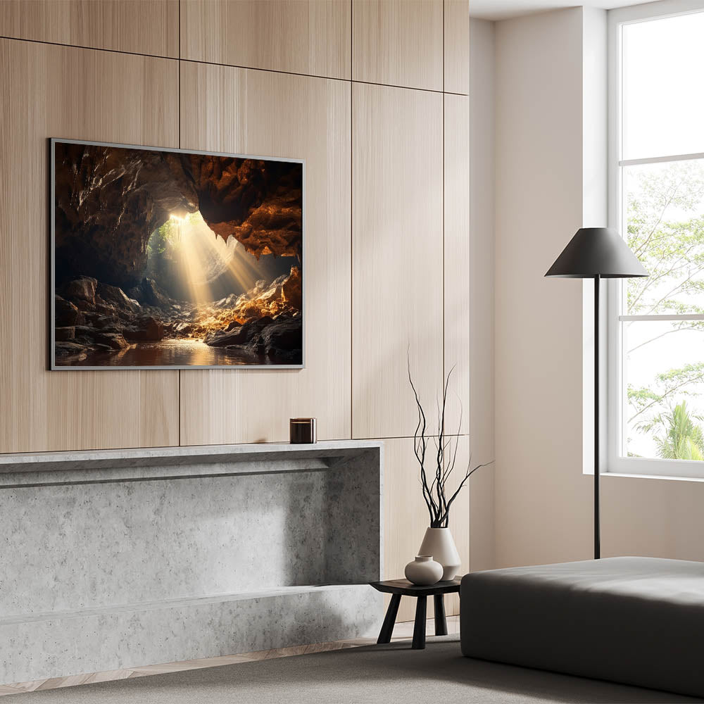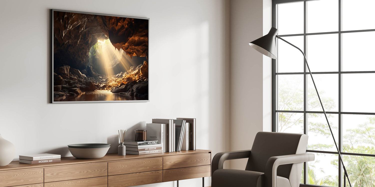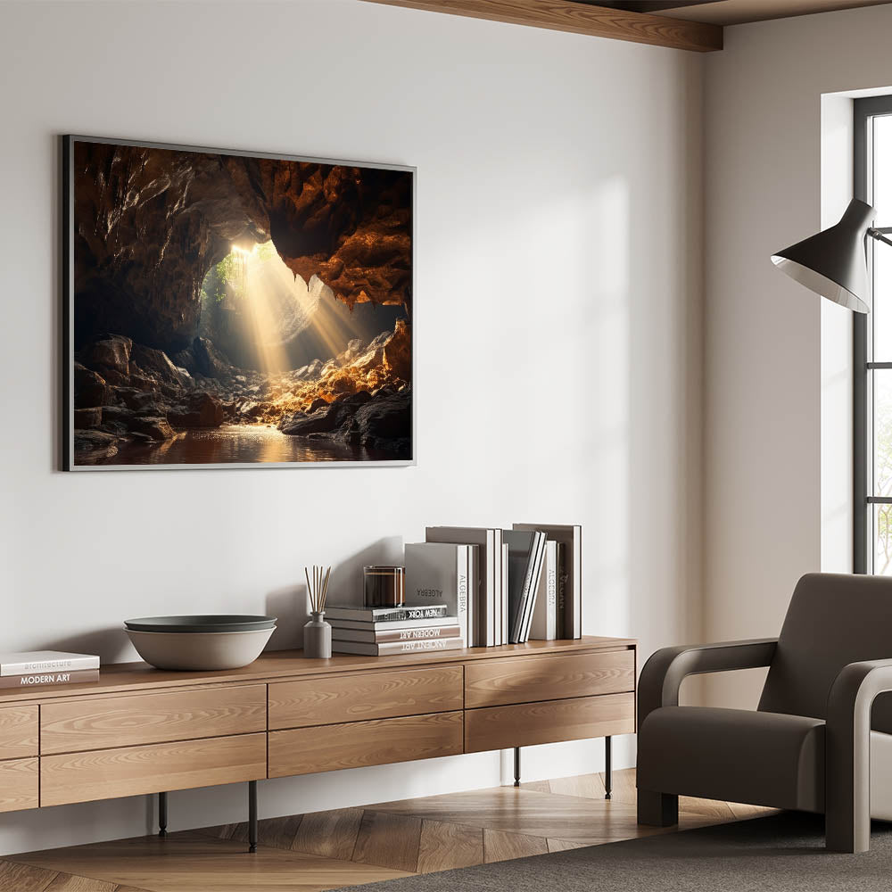 Illuminate your space with the warm and inviting glow of this sunlit cave wall art. This captivating piece captures the serene beauty of sunlight streaming into a hidden cave, casting golden rays across the rocky landscape below. The rich earthy tones and soft light create a harmonious and tranquil atmosphere, making this high-quality print an ideal addition to any room seeking warmth and natural elegance. Available in various formats, including stretched canvas, framed canvas, and acrylic glass, this artwork will bring a touch of nature’s peaceful beauty into your home or office.