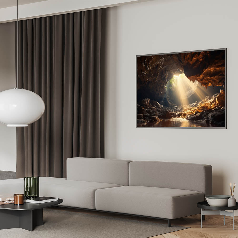 This stunning sunlit cave photography print will transform your living space, offering a window into the peaceful and timeless beauty of nature. Whether displayed in a living room, bedroom, or office, this piece will bring a sense of calm and elegance to your decor.