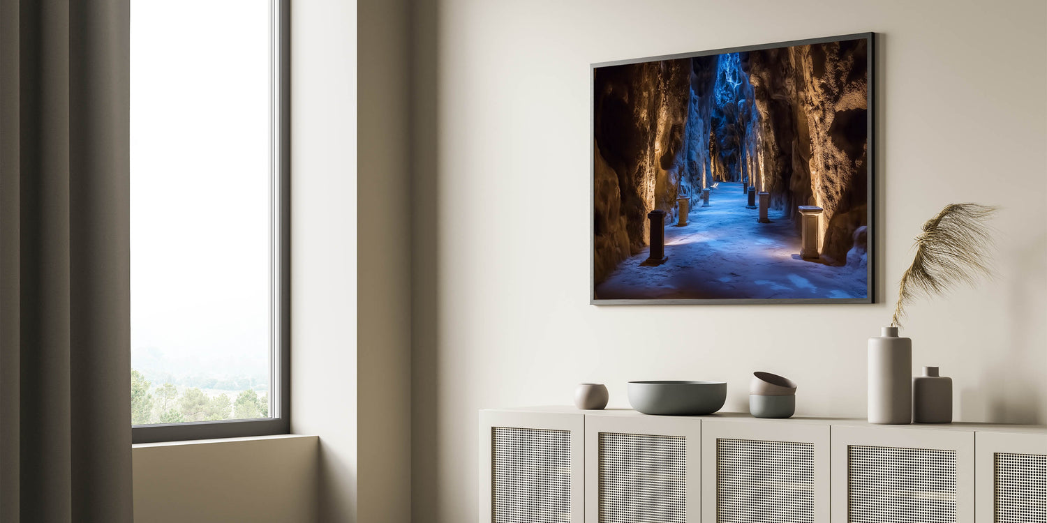 • High-quality prints of illuminated ancient walkways in underground caves.