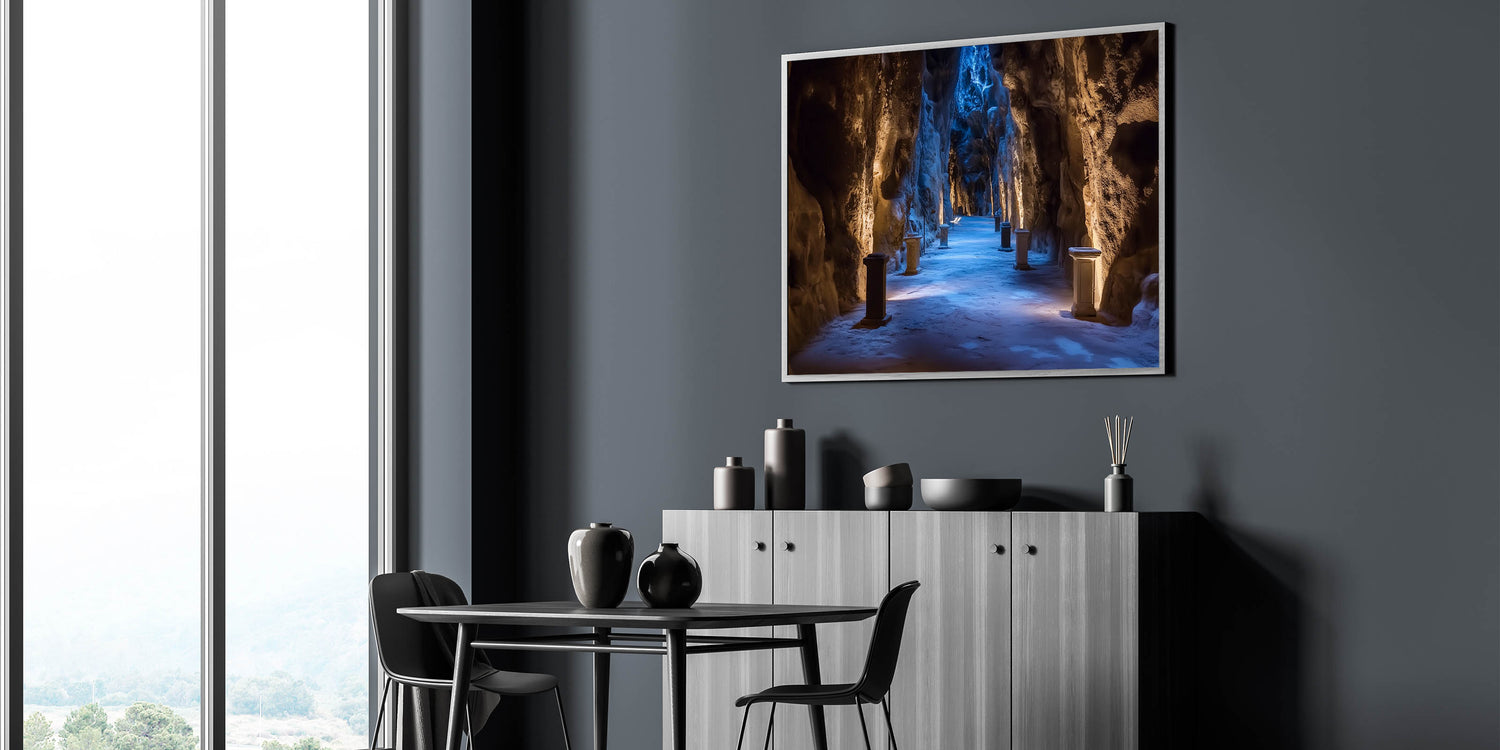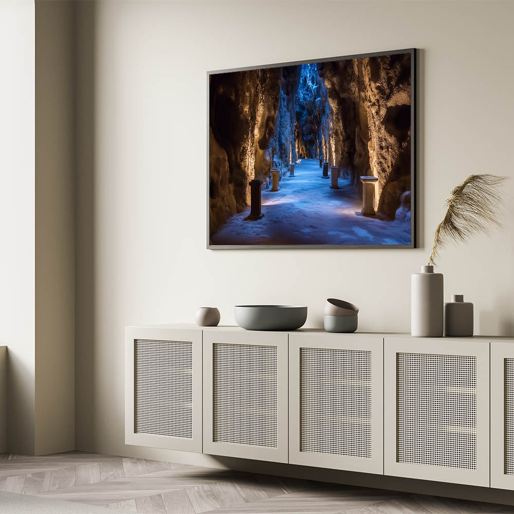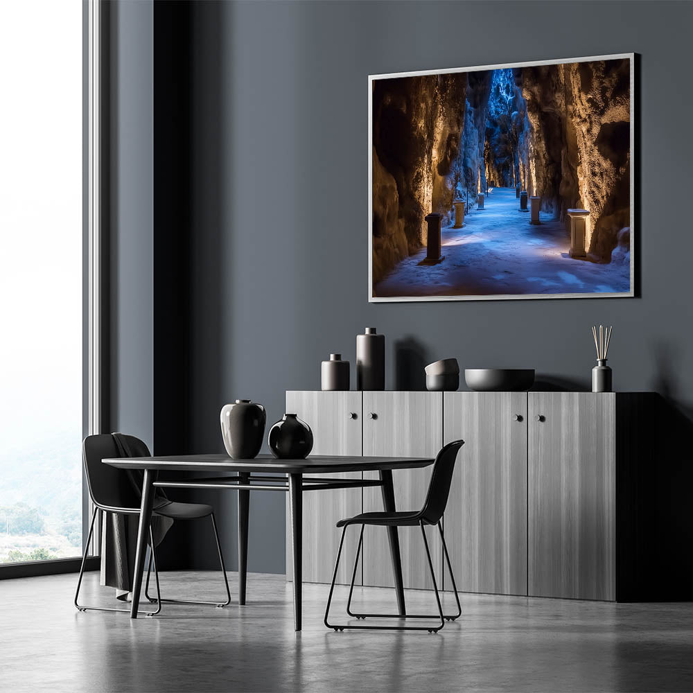 Discover the mystique of an illuminated ancient walkway with this striking cave wall art. Featuring a pathway lit by soft amber lighting and cool blue accents, this artwork beautifully captures the textured cave walls and their mysterious allure. The juxtaposition of warm and cool tones creates a captivating ambiance, making it a perfect centerpiece for any room.
