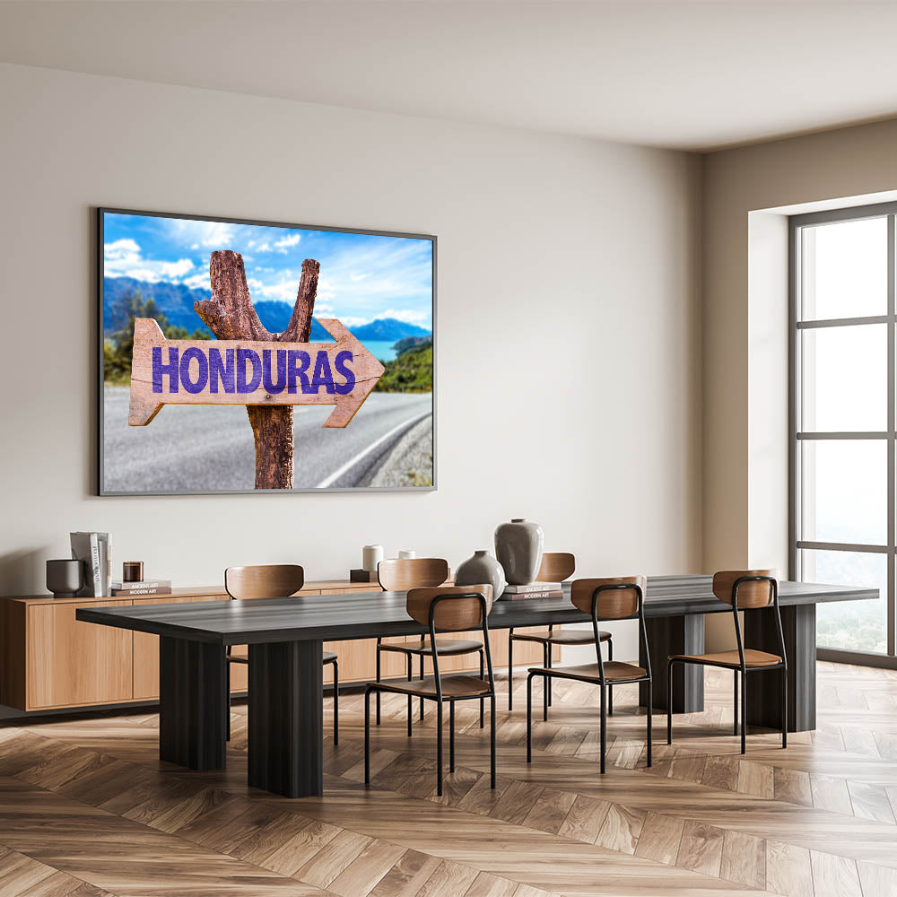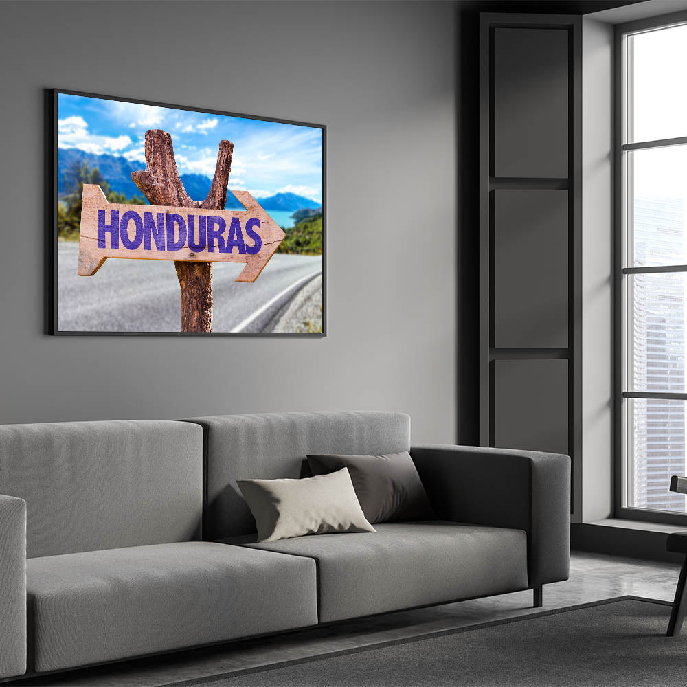 Discover the path to Central America with our Honduras Directional Signpost Wall Art. This captivating piece features a rustic wooden signpost with "HONDURAS" boldly inscribed, set against a scenic backdrop of lush landscapes and blue skies. It's the perfect piece for travelers and adventurers alike, looking to bring a sense of exploration and wanderlust into their homes.