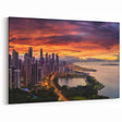 Sunset Metropolis" captures the stunning vibrancy of Panama City as day turns to night, featuring the skyline bathed in the fiery hues of sunset. This wall art highlights the architectural diversity and modernity of the city, set against the dramatic backdrop of a colorful sky and the calm ocean waters.