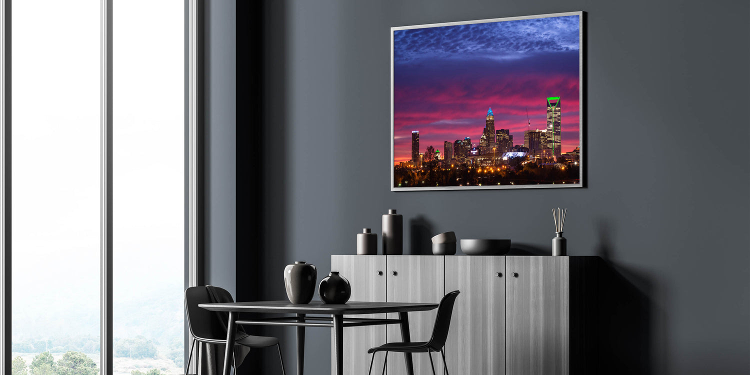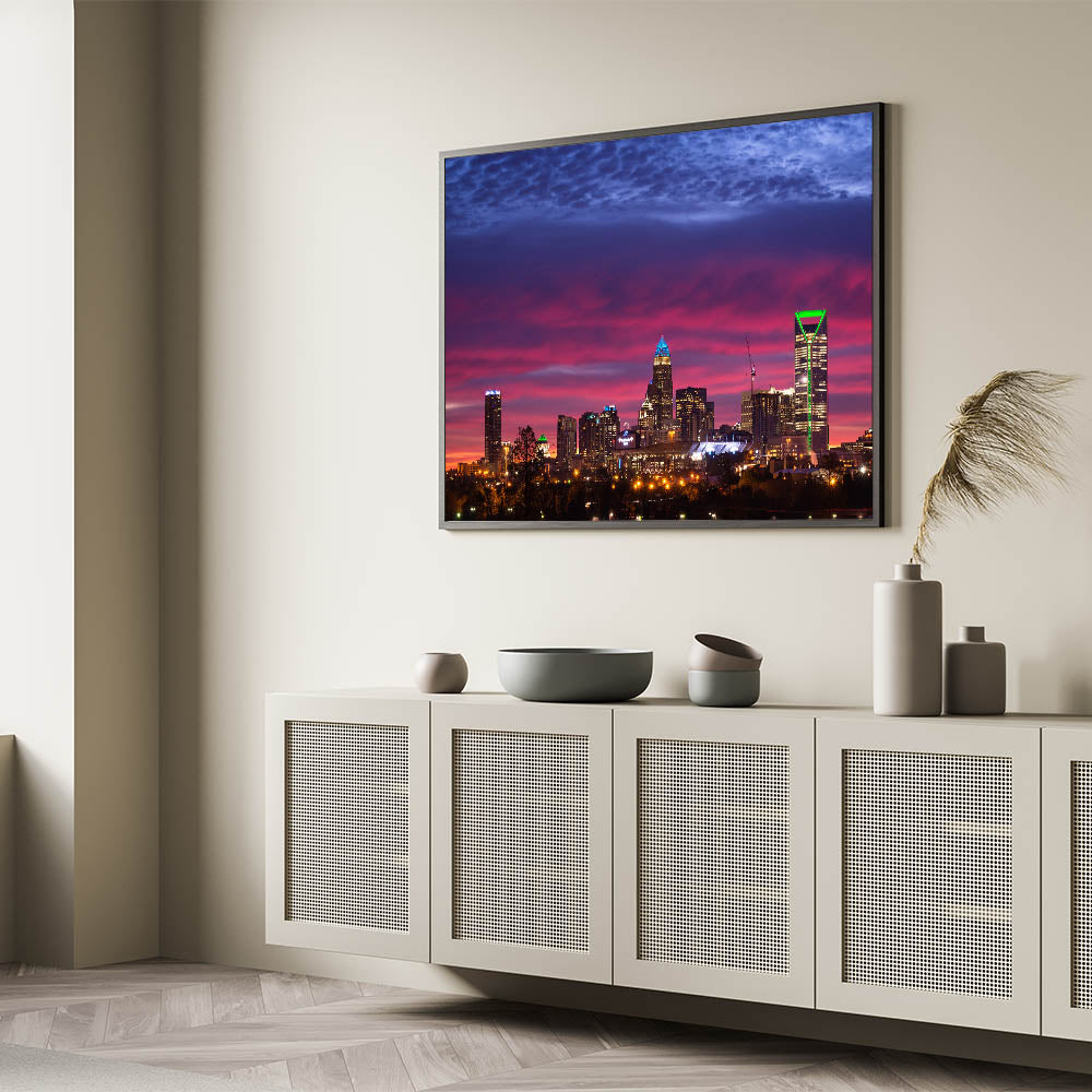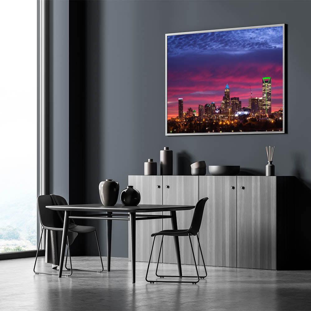 Whether you're looking to elevate your living space or office decor, this Charlotte sunset cityscape will bring a touch of urban sophistication and dramatic flair to any environment.