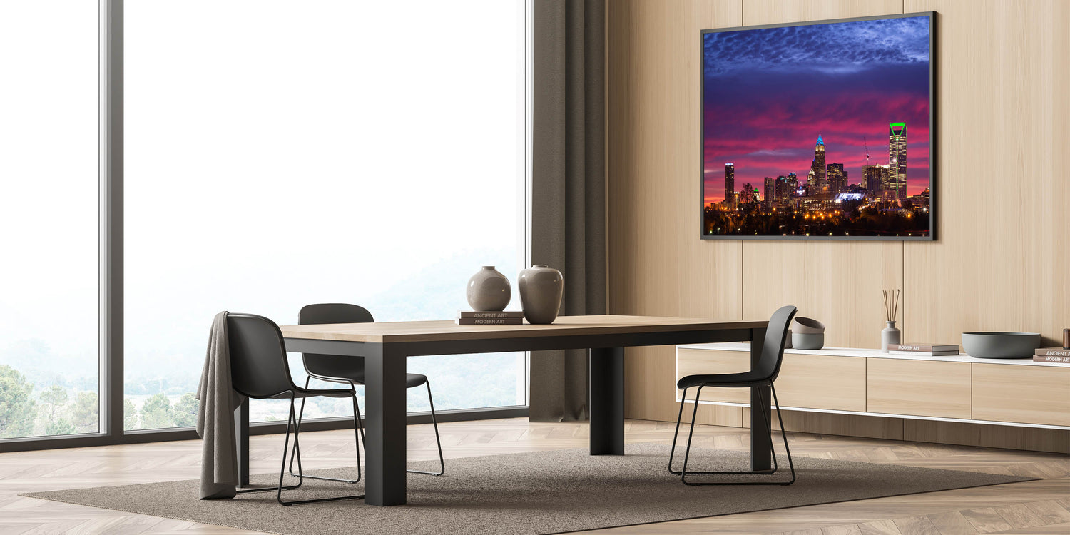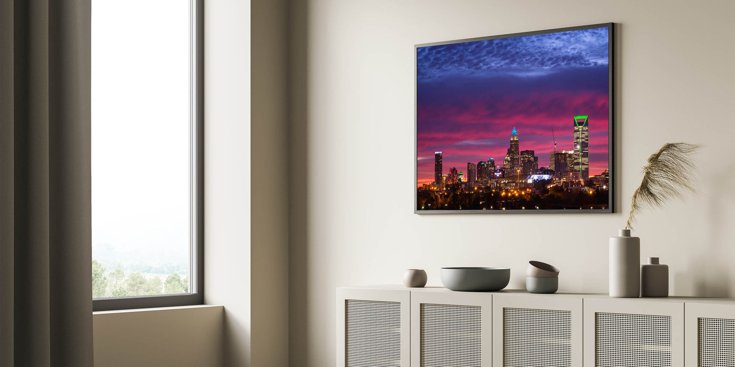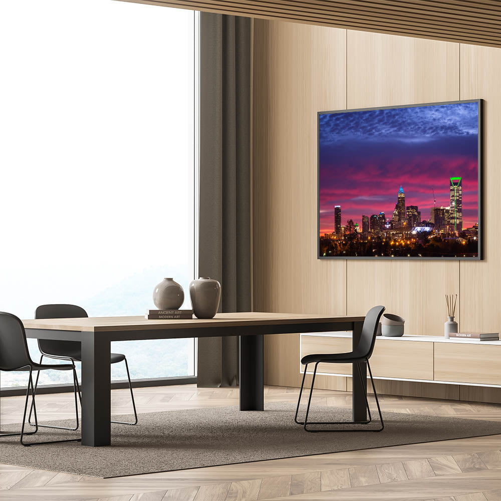 Whether you're looking to elevate your living space or office decor, this Charlotte sunset cityscape will bring a touch of urban sophistication and dramatic flair to any environment.