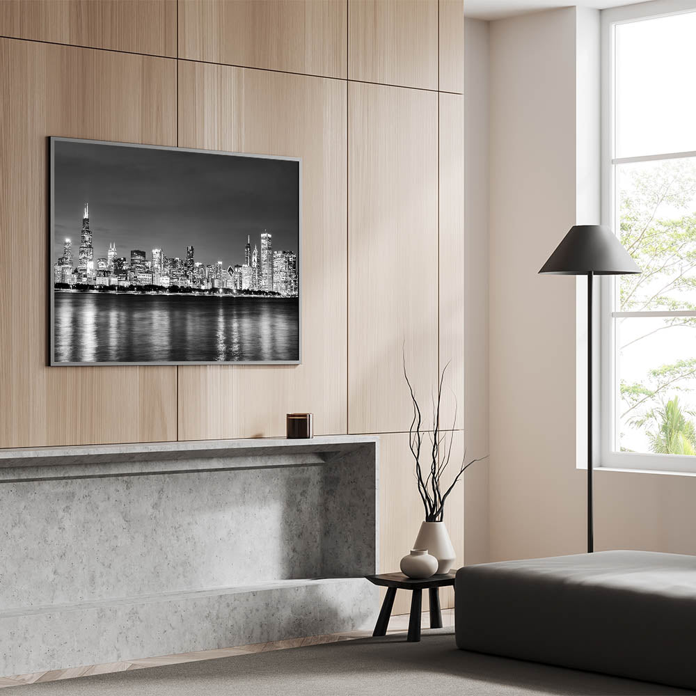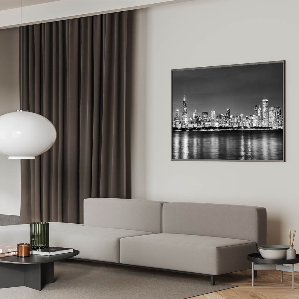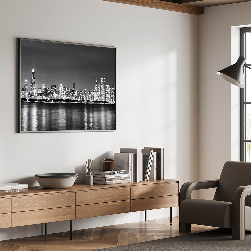 Enhance your decor with this stunning Chicago photography print. This captivating black-and-white view of the Chicago skyline captures the city’s majestic buildings illuminated at night, with their reflections shimmering on the calm waters of Lake Michigan. The detailed silhouettes of iconic skyscrapers create a timeless look, perfect for adding a touch of elegance to any space.