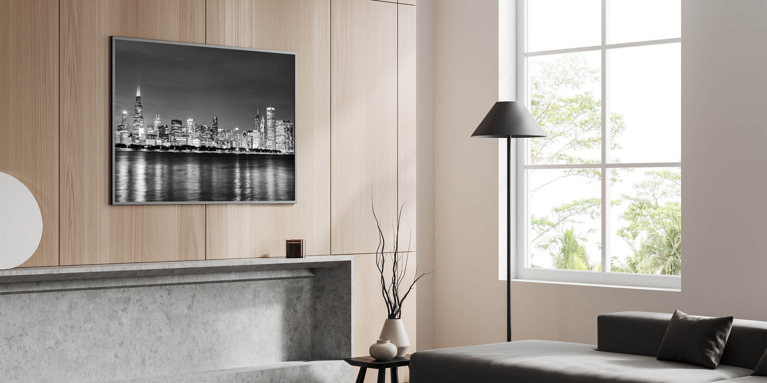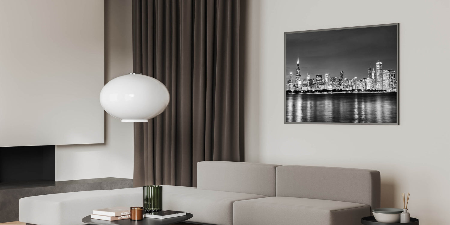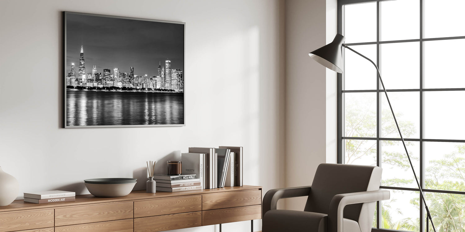 - High-quality Chicago skyline prints in a classic black-and-white design