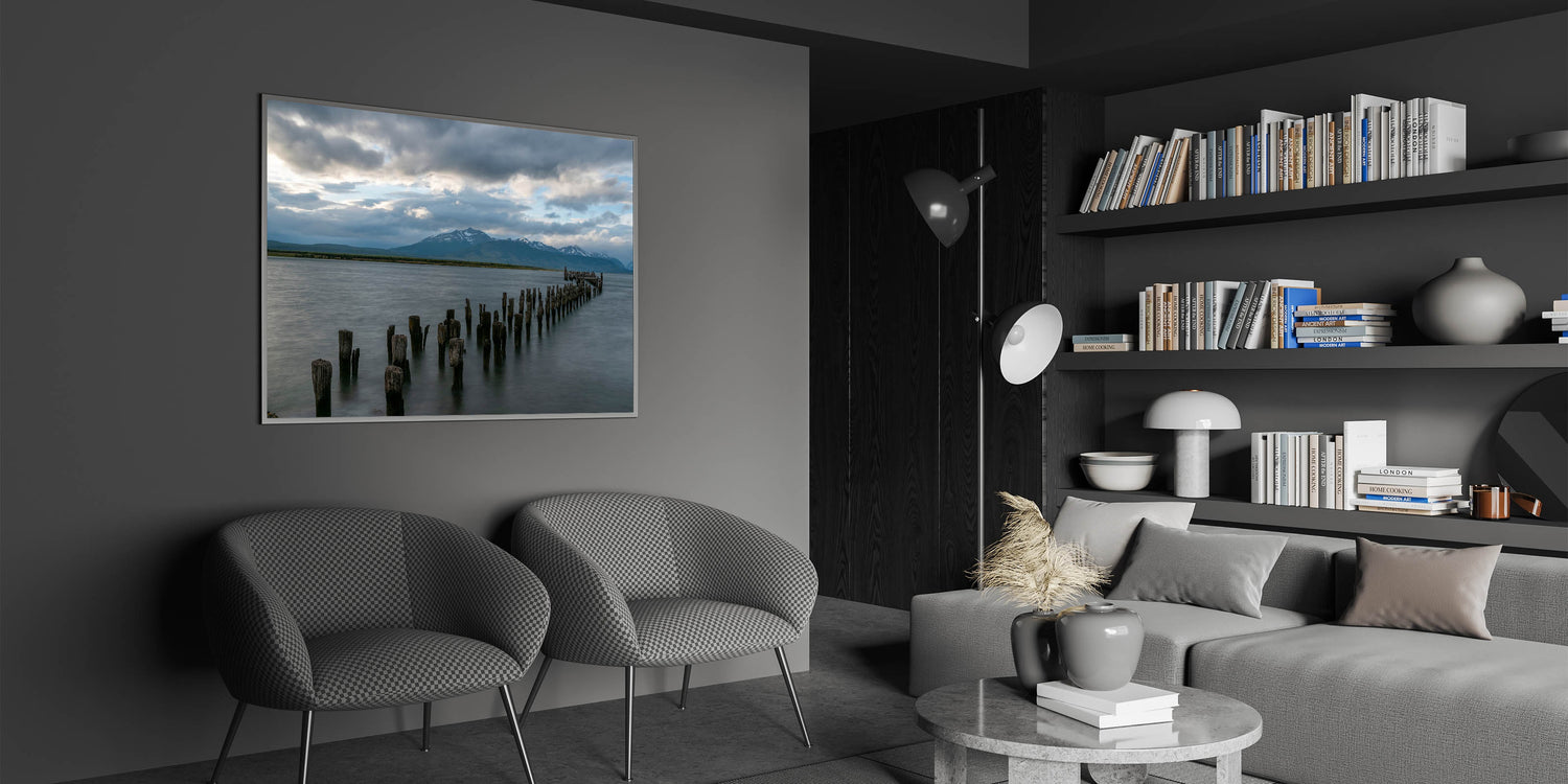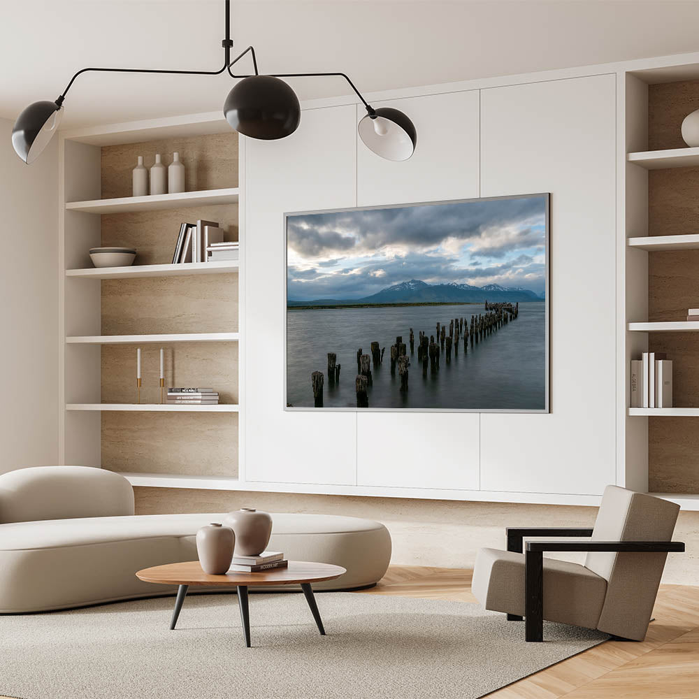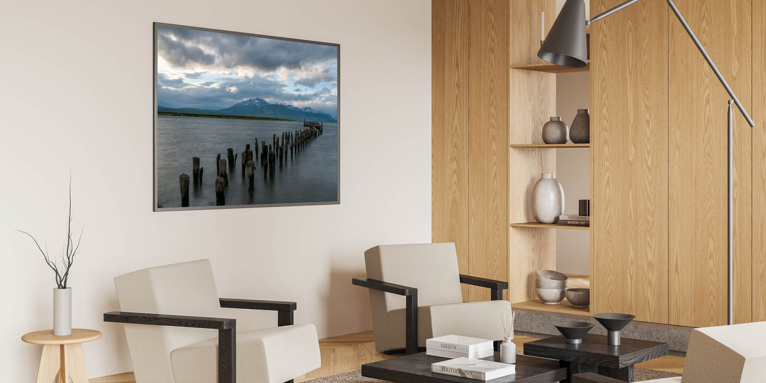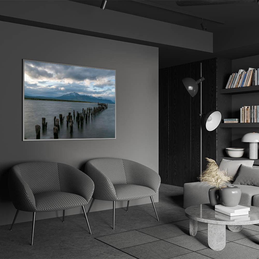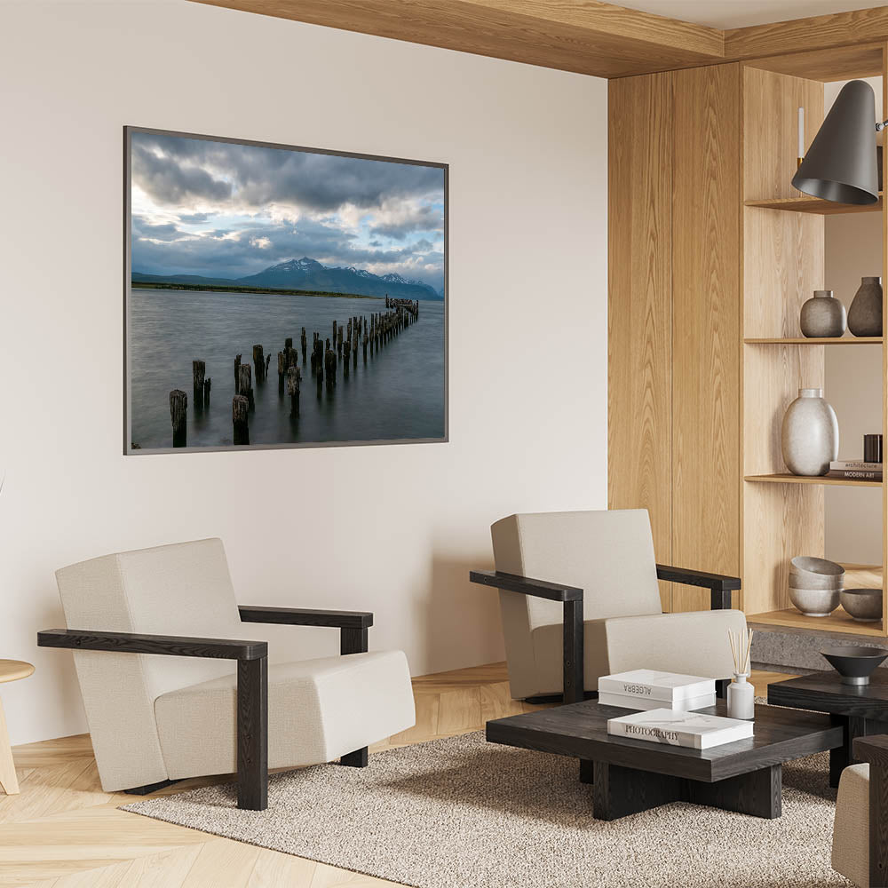 Bring a sense of calm and serenity into your space with this stunning Chile landscape painting. Featuring an expansive lake with remnants of a wooden pier stretching out toward the horizon, this artwork captures the quiet beauty of nature. Snow-capped mountains loom in the background under a moody sky, offering a perfect balance of tranquility and grandeur. This peaceful scene is ideal for those who appreciate nature’s raw beauty and scenic vistas.