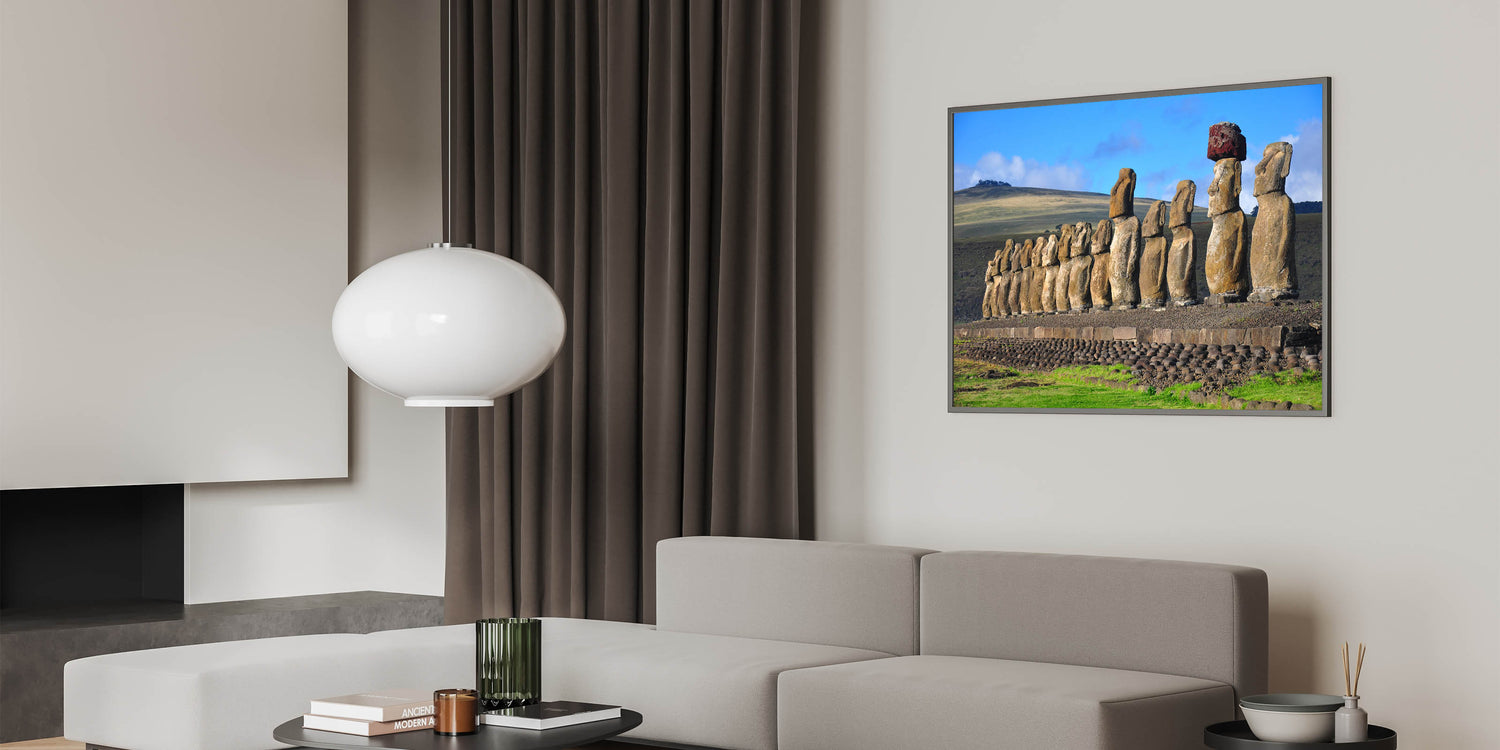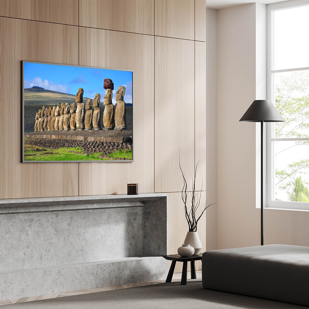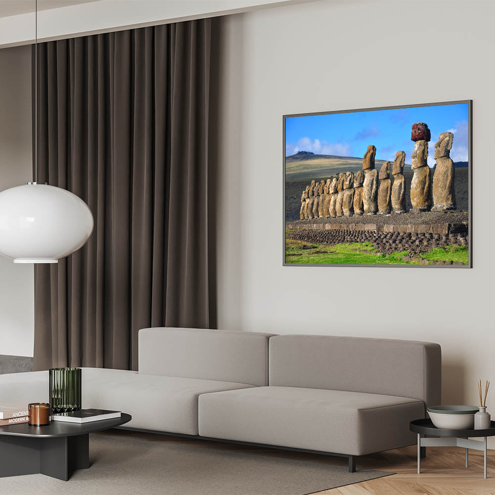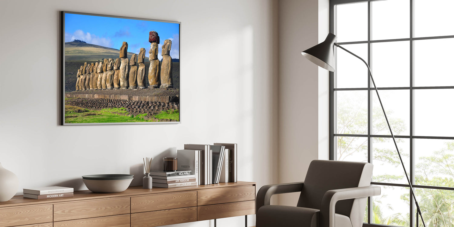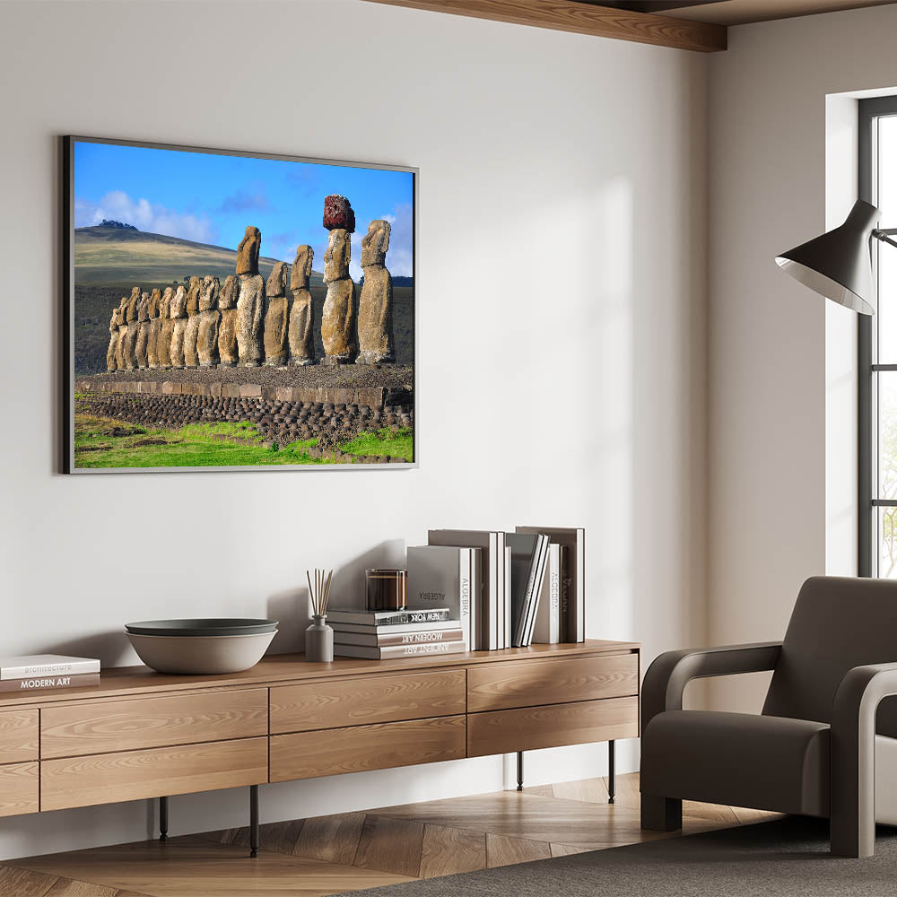- High-quality print showcasing the historic Moai statues of Easter Island.