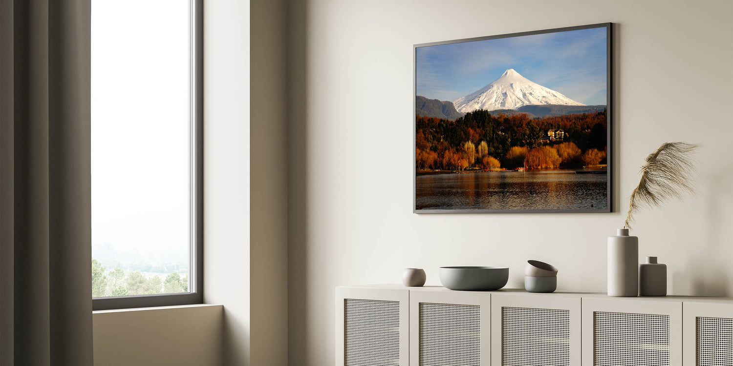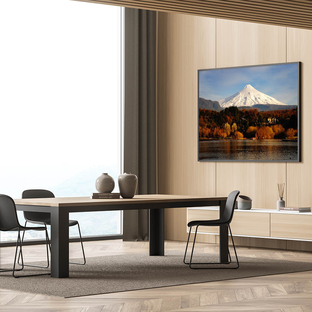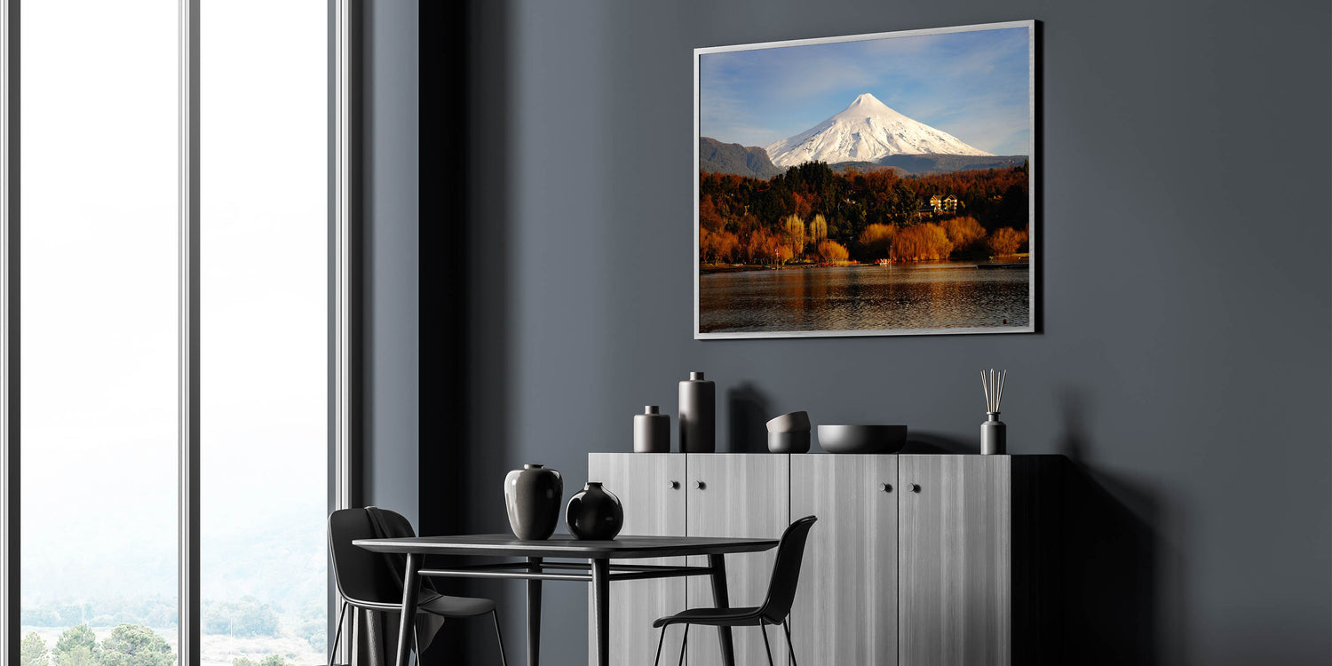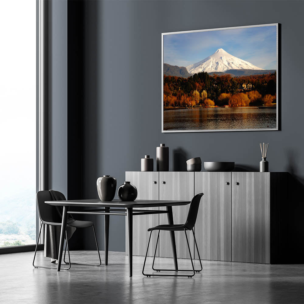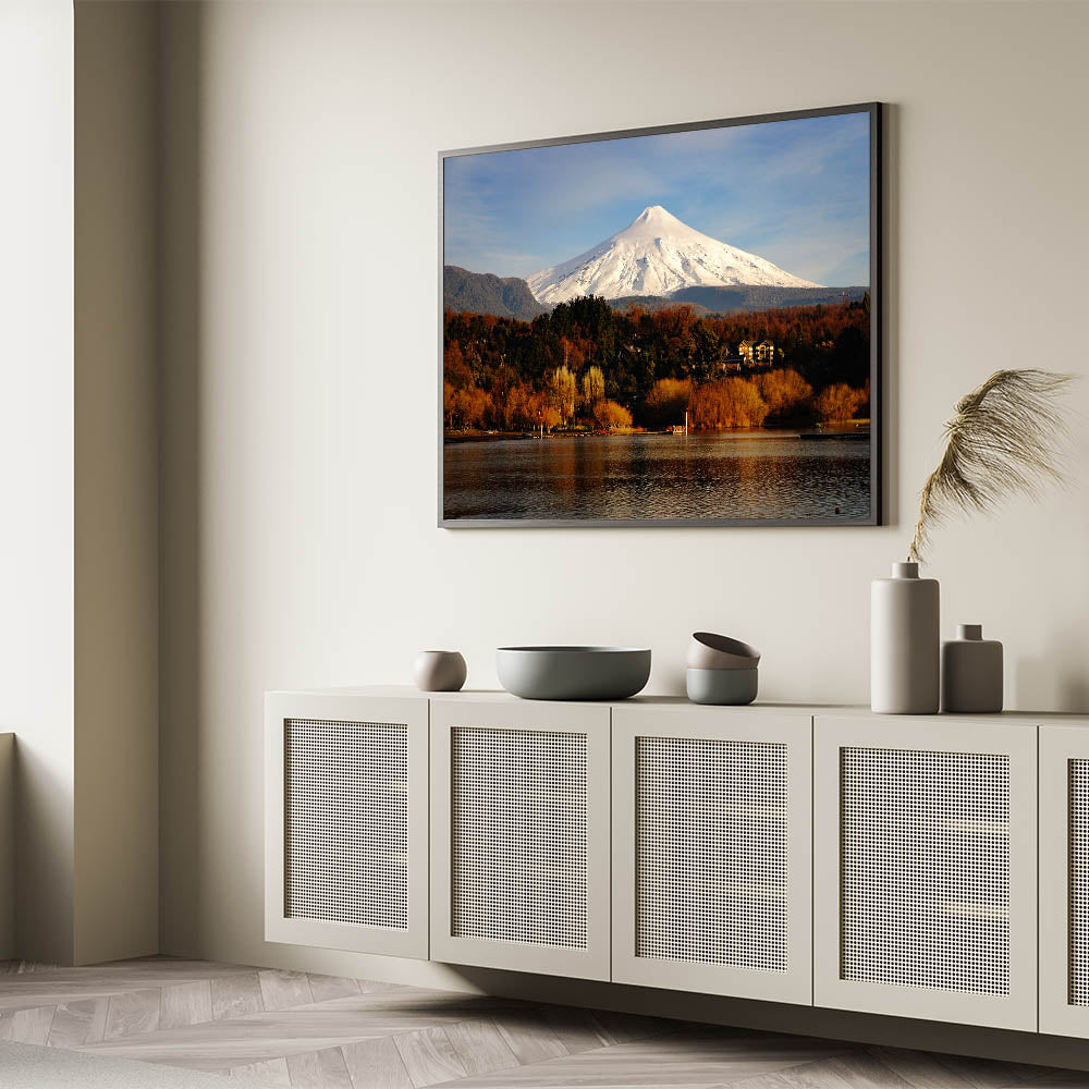 Immerse yourself in the natural grandeur of Chile’s landscapes with this stunning framed Chile photography. Featuring a snow-capped volcano rising above lush forests and calm waters, this breathtaking scene captures the beauty and serenity of South American wall decor. Perfect for nature lovers or anyone looking to bring a sense of calm and adventure into their space, this Chile landscape print is sure to impress.