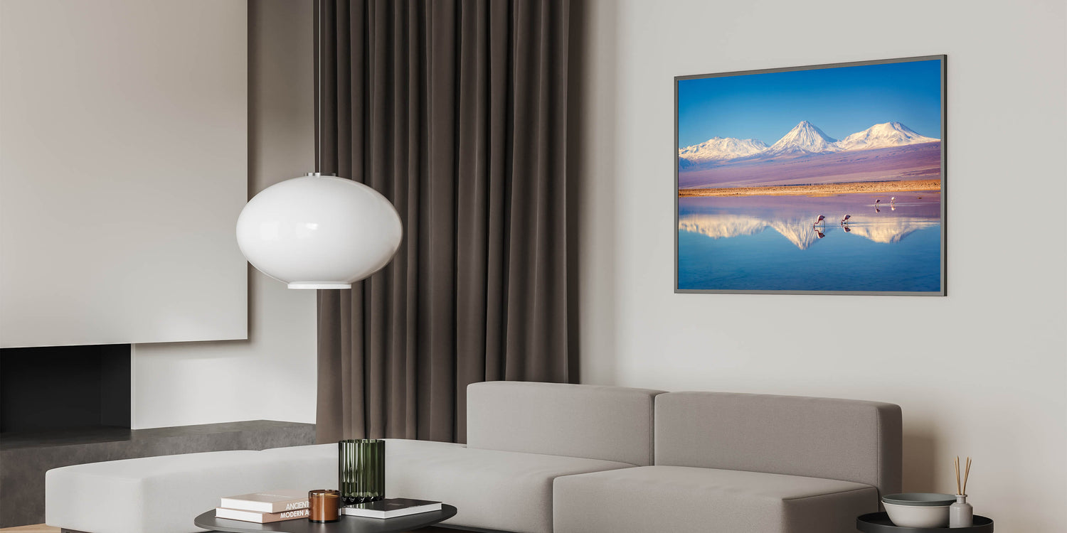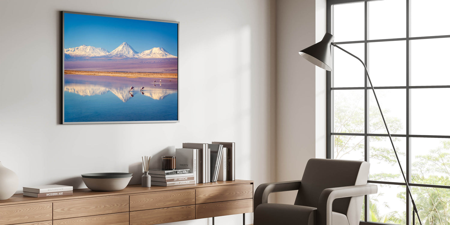 Capture the breathtaking beauty of Chile’s iconic Patagonia landscape with this stunning wall art print. Featuring graceful flamingos standing in still waters, with the reflection of snowcapped mountains in the background, this piece perfectly encapsulates the serene and majestic nature of Chilean landscape decor. Whether you’re looking to bring a touch of South American scenery art into your home or want to celebrate the beauty of nature, this artwork is an ideal choice.