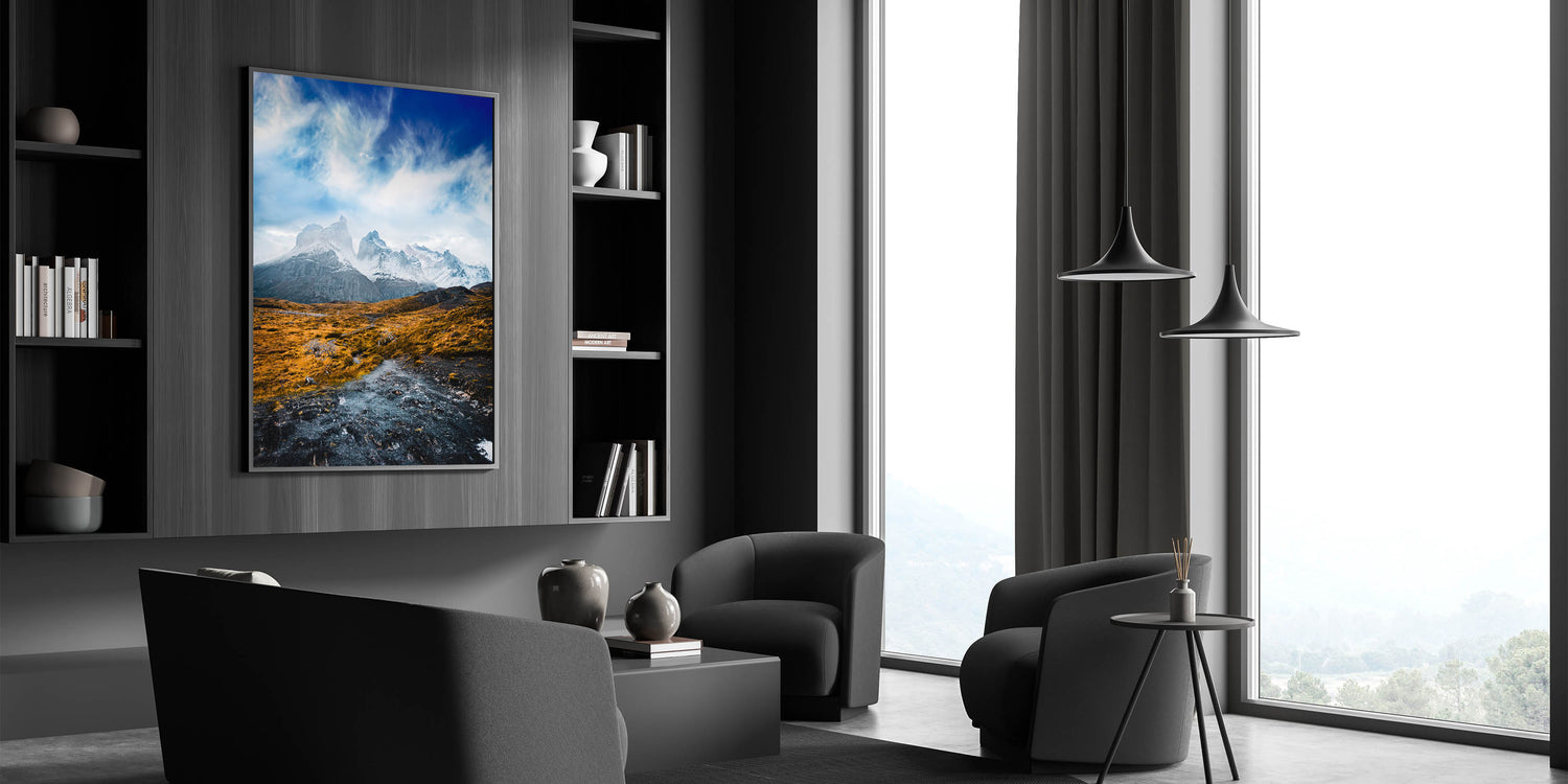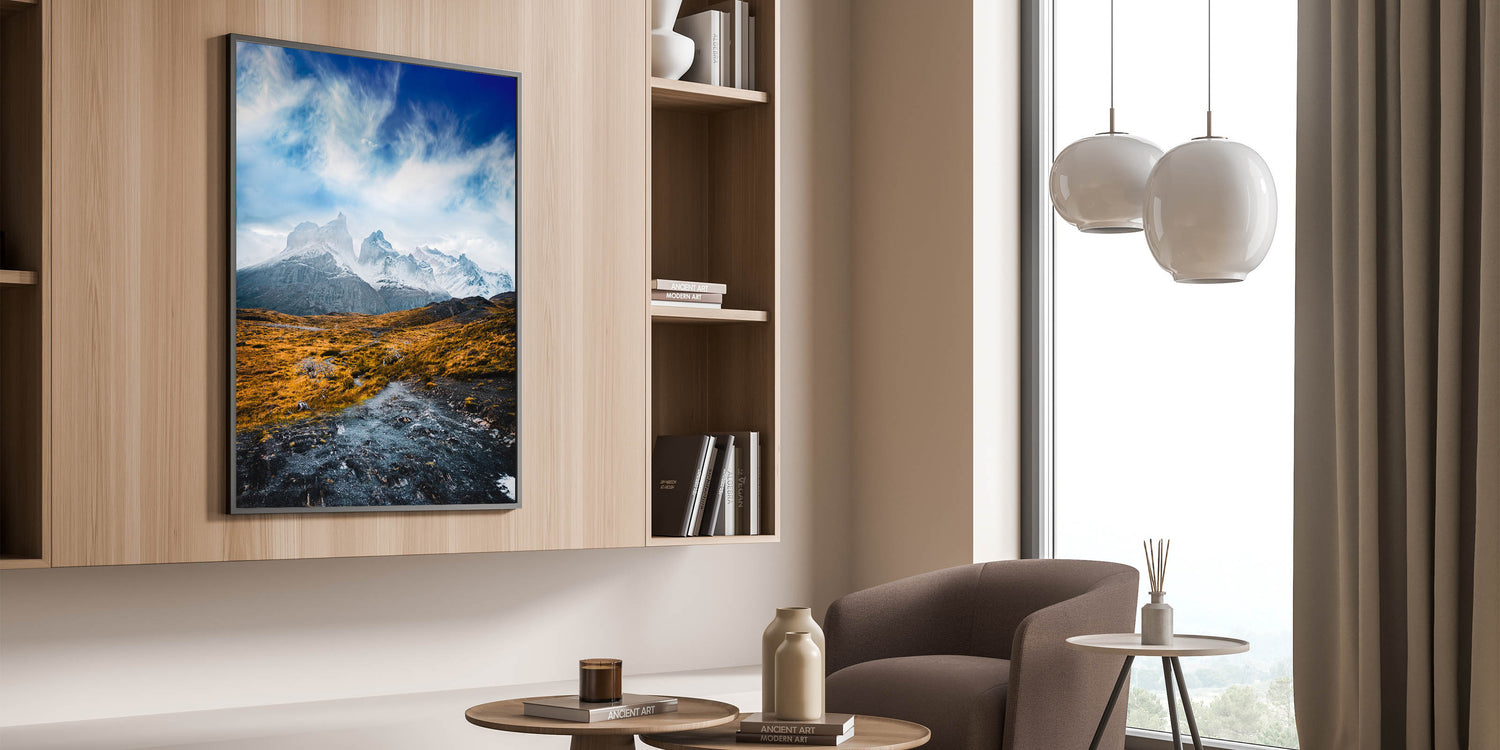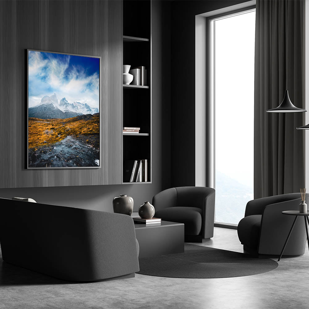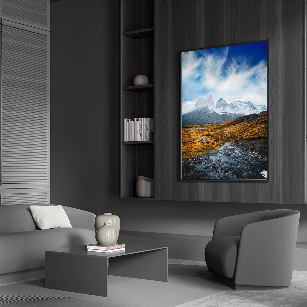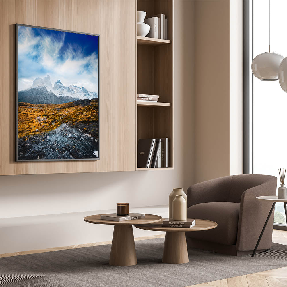 Bring the breathtaking beauty of Torres del Paine into your home with this stunning Chile wall art. The majestic snowcapped peaks rise above a golden, rugged landscape, capturing the serene yet powerful essence of Chilean landscape decor. Perfect for adventurers and nature lovers, this artwork beautifully showcases the unique contrast between the bold mountains and the vibrant foreground, adding a touch of South American scenery art to any room.
