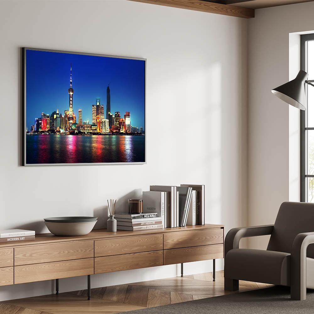 Brighten up your space with this breathtaking Shanghai wall art, showcasing the city’s stunning skyline at night. The vibrant colors and reflections of the Oriental Pearl Tower and surrounding skyscrapers create a striking contrast against the dark blue sky, capturing the dynamic spirit of Shanghai. This artwork is perfect for anyone looking to bring a touch of modernity and elegance into their home or office decor.