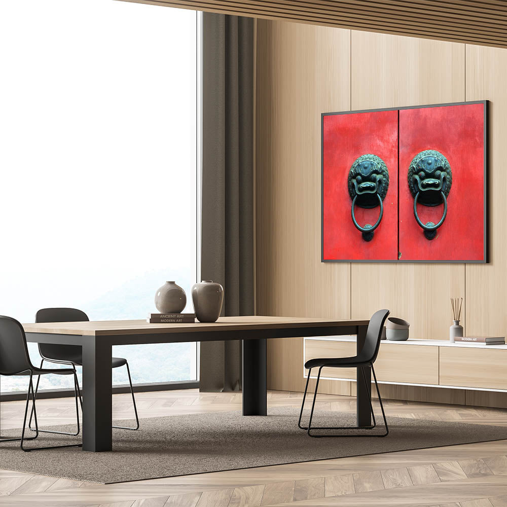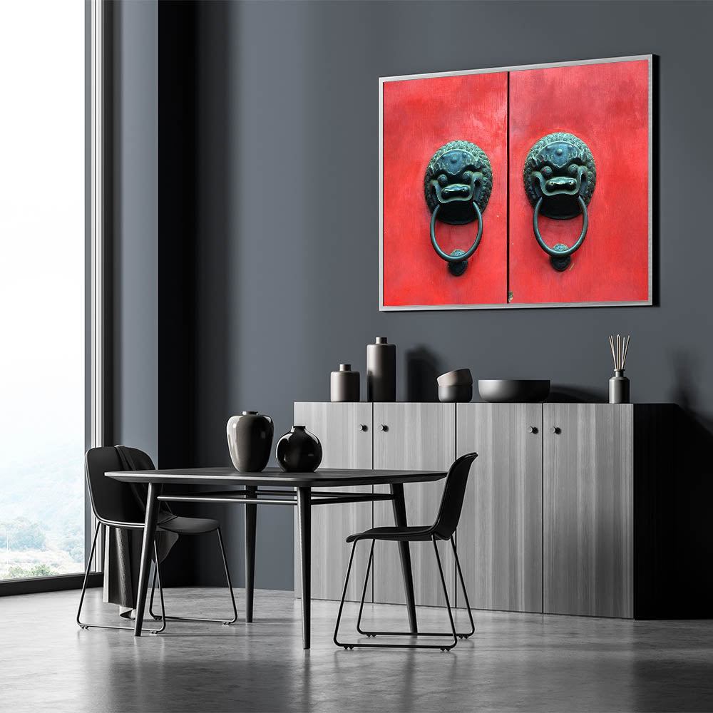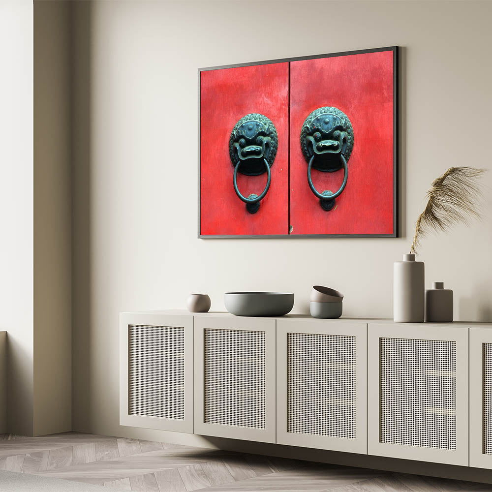 Add a touch of authentic Chinese culture to your space with this stunning Shanghai wall art. Featuring intricate bronze door knockers on a vibrant red door, this piece beautifully captures the essence of traditional Chinese architecture. Whether displayed in your living room, office, or hallway, it brings a sense of elegance and cultural depth to any environment.