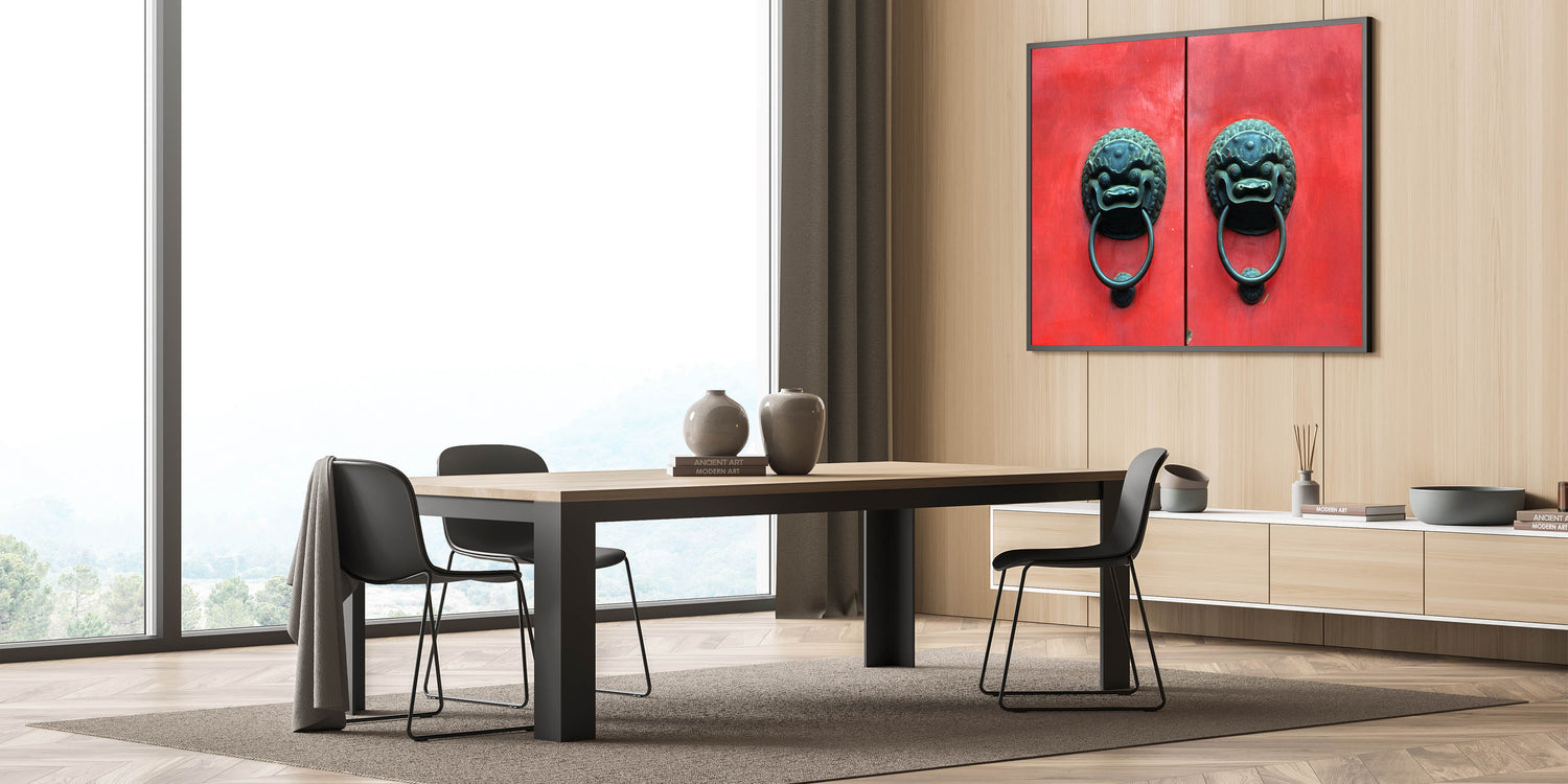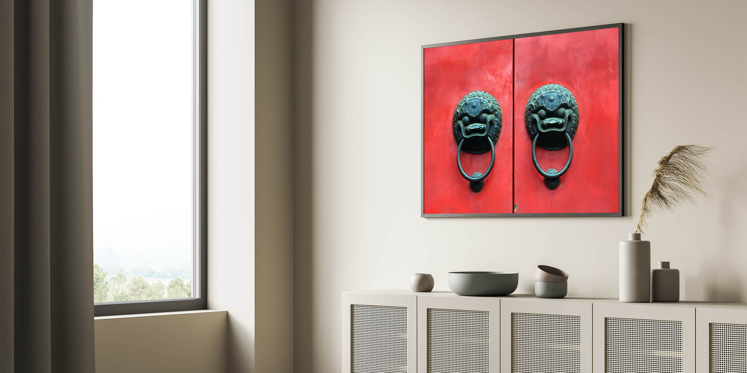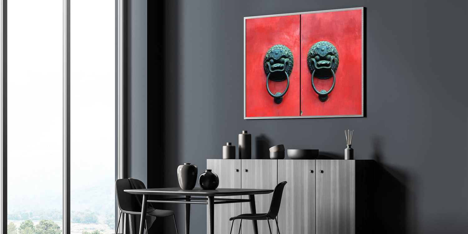 Add a touch of authentic Chinese culture to your space with this stunning Shanghai wall art. Featuring intricate bronze door knockers on a vibrant red door, this piece beautifully captures the essence of traditional Chinese architecture. Whether displayed in your living room, office, or hallway, it brings a sense of elegance and cultural depth to any environment.
