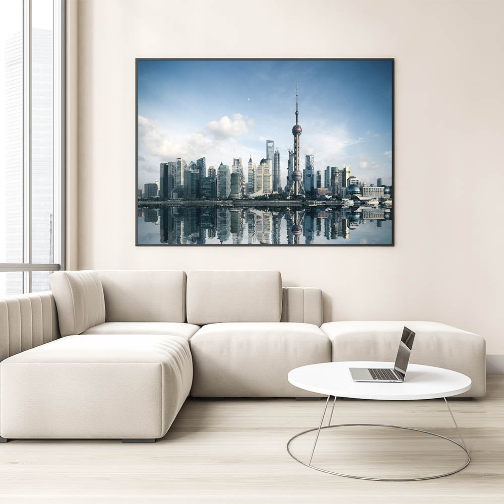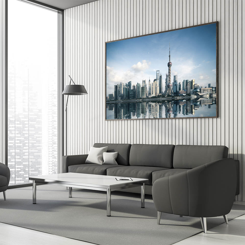 Capture the beauty and modernity of Shanghai with this striking skyline wall art. Featuring the iconic Oriental Pearl Tower and the city's sleek skyscrapers, this artwork showcases the vibrant and futuristic spirit of Shanghai. The skyline is reflected beautifully on the calm water, making this piece perfect for enhancing any living or office space with a touch of sophistication and contemporary style.