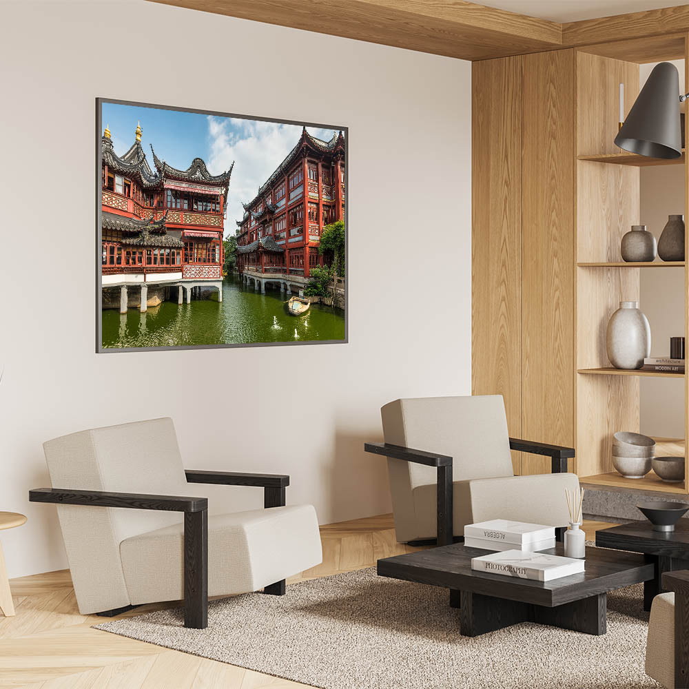 Immerse yourself in the beauty of Shanghai’s traditional Chinese architecture with this exquisite wall art. The artwork showcases a stunning view of historic buildings resting over serene water, reflecting the timeless charm of ancient Chinese design. This art piece captures the intricate details of red wooden structures with curved rooftops, framed by a peaceful, natural setting. Perfect for adding cultural depth to any room, this canvas brings the tranquility of Shanghai’s historic sites into your home or office.