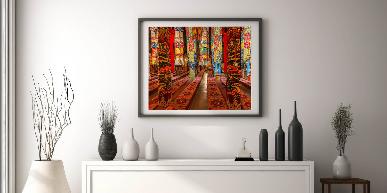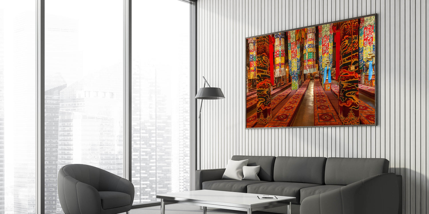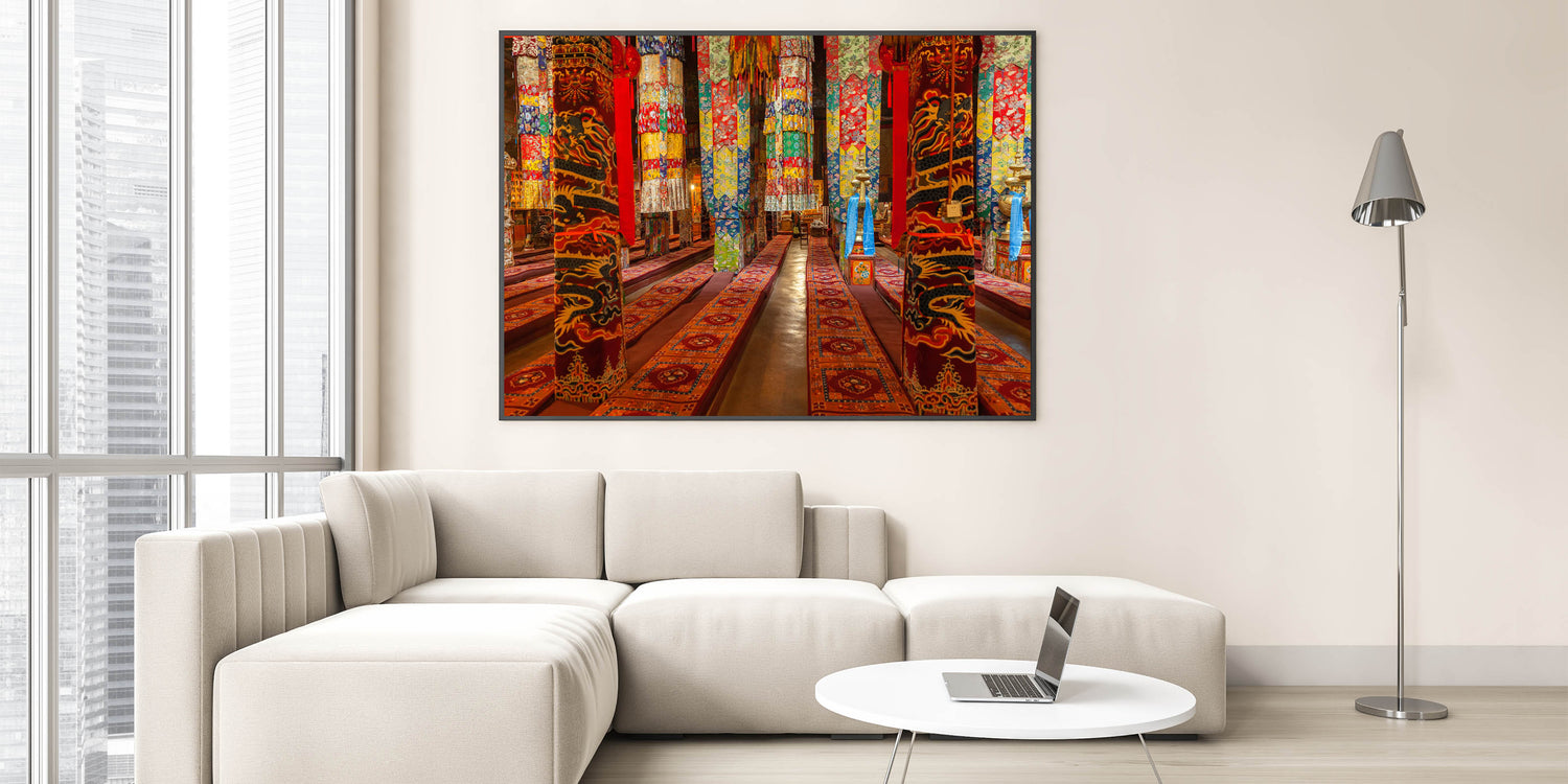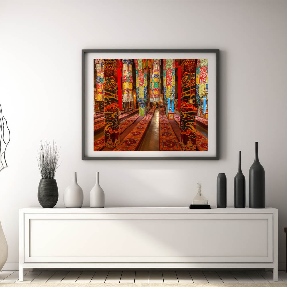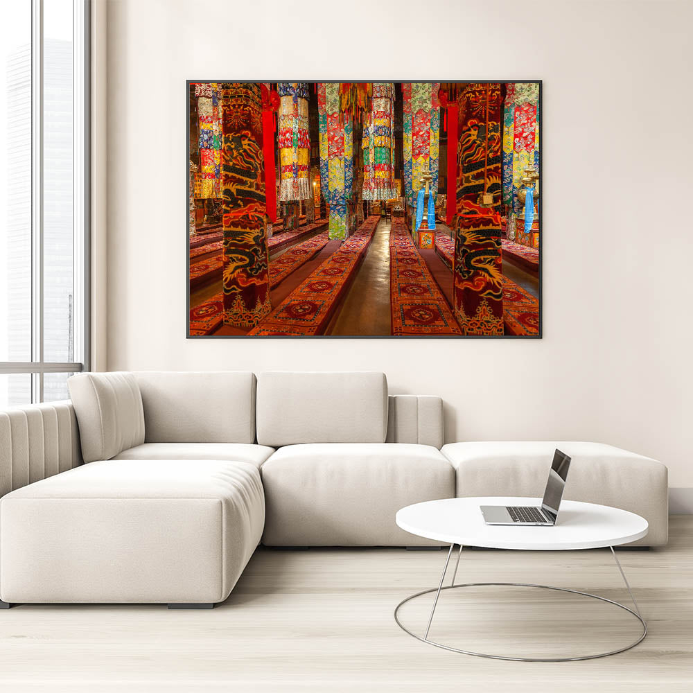 Experience the rich cultural beauty of Tibet with this vibrant wall art showcasing the intricate interiors of a traditional Tibetan monastery. The detailed patterns and vivid colors of ceremonial fabrics and decor bring a lively touch of Tibetan heritage to any space. Ideal for adding warmth and cultural depth to your decor, this artwork captures the artistic spirit of Tibetan traditions.