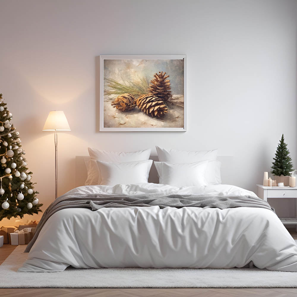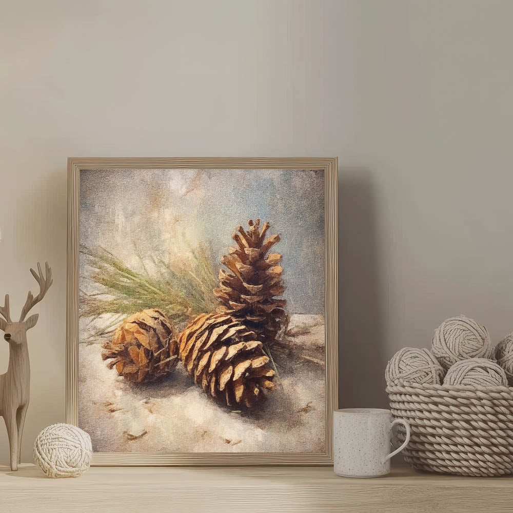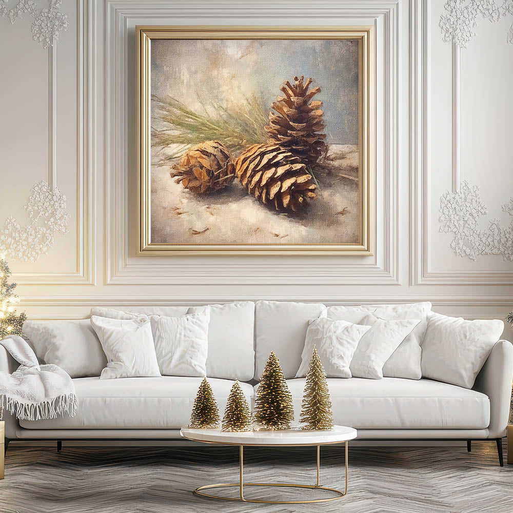 Celebrate the beauty of the winter season with this stunning festive canvas art featuring a rustic arrangement of pinecones on a snowy background. This artwork perfectly captures the essence of nature during the holidays, bringing warmth and rustic charm to any space. The natural tones and earthy textures make this piece a versatile addition to your seasonal decor.