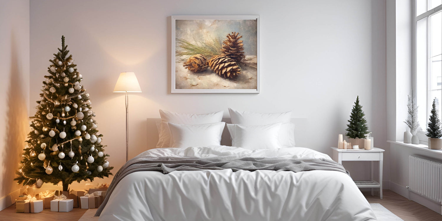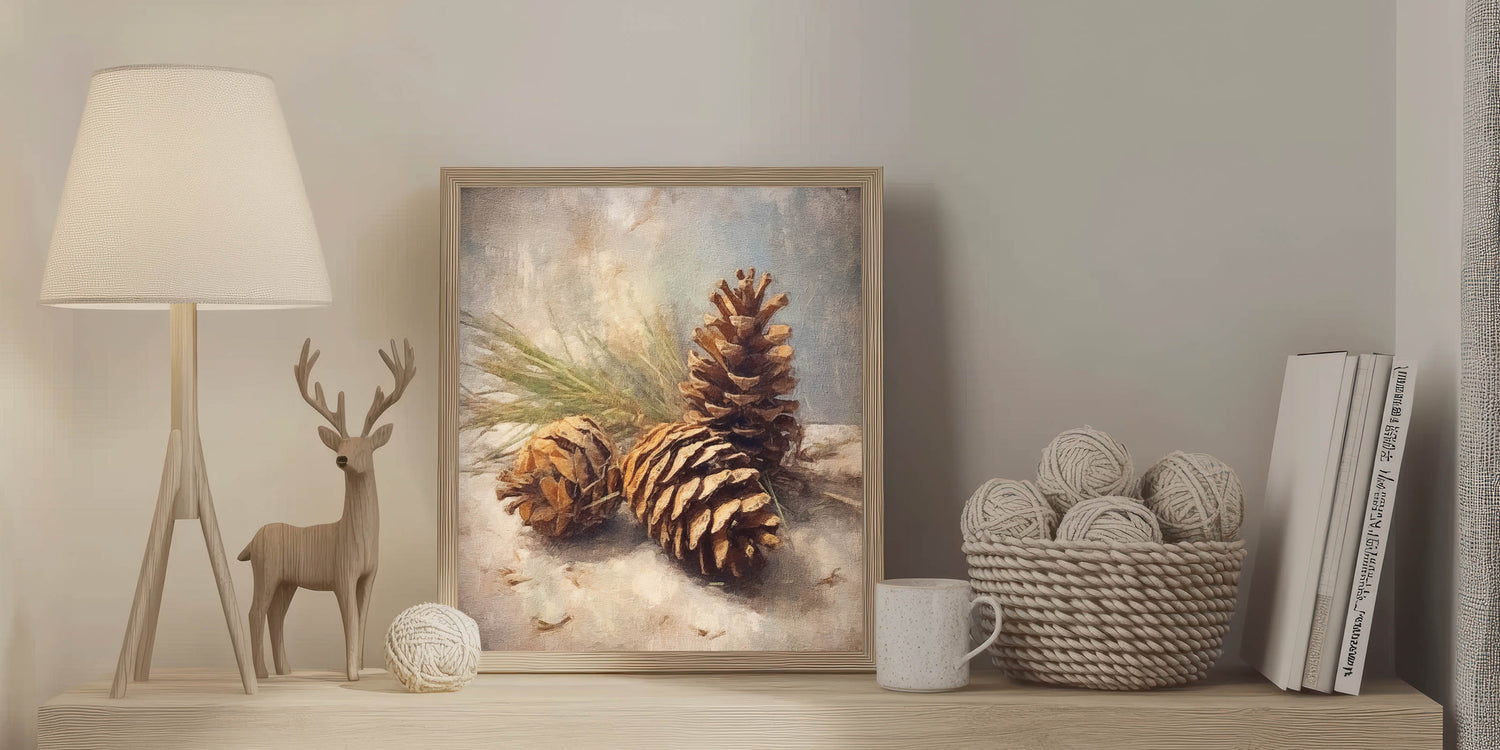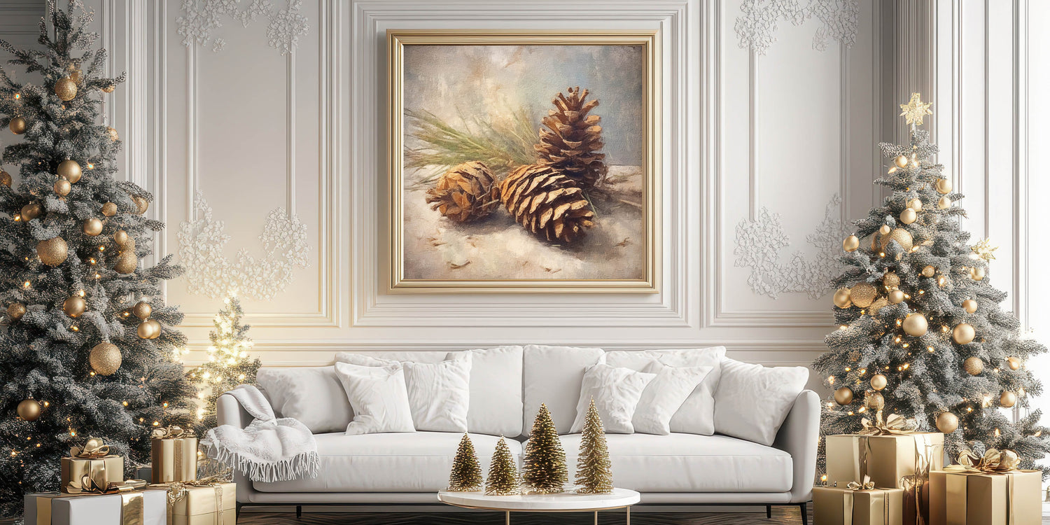 Celebrate the beauty of the winter season with this stunning festive canvas art featuring a rustic arrangement of pinecones on a snowy background. This artwork perfectly captures the essence of nature during the holidays, bringing warmth and rustic charm to any space. The natural tones and earthy textures make this piece a versatile addition to your seasonal decor.