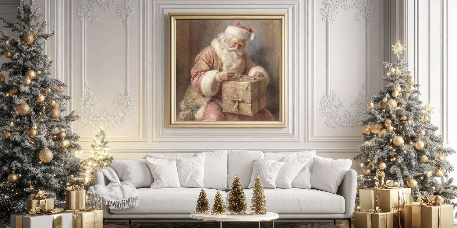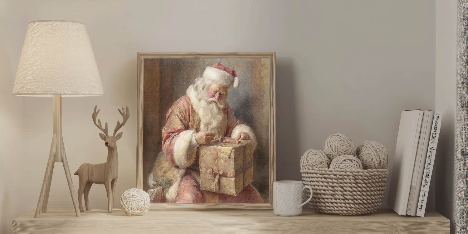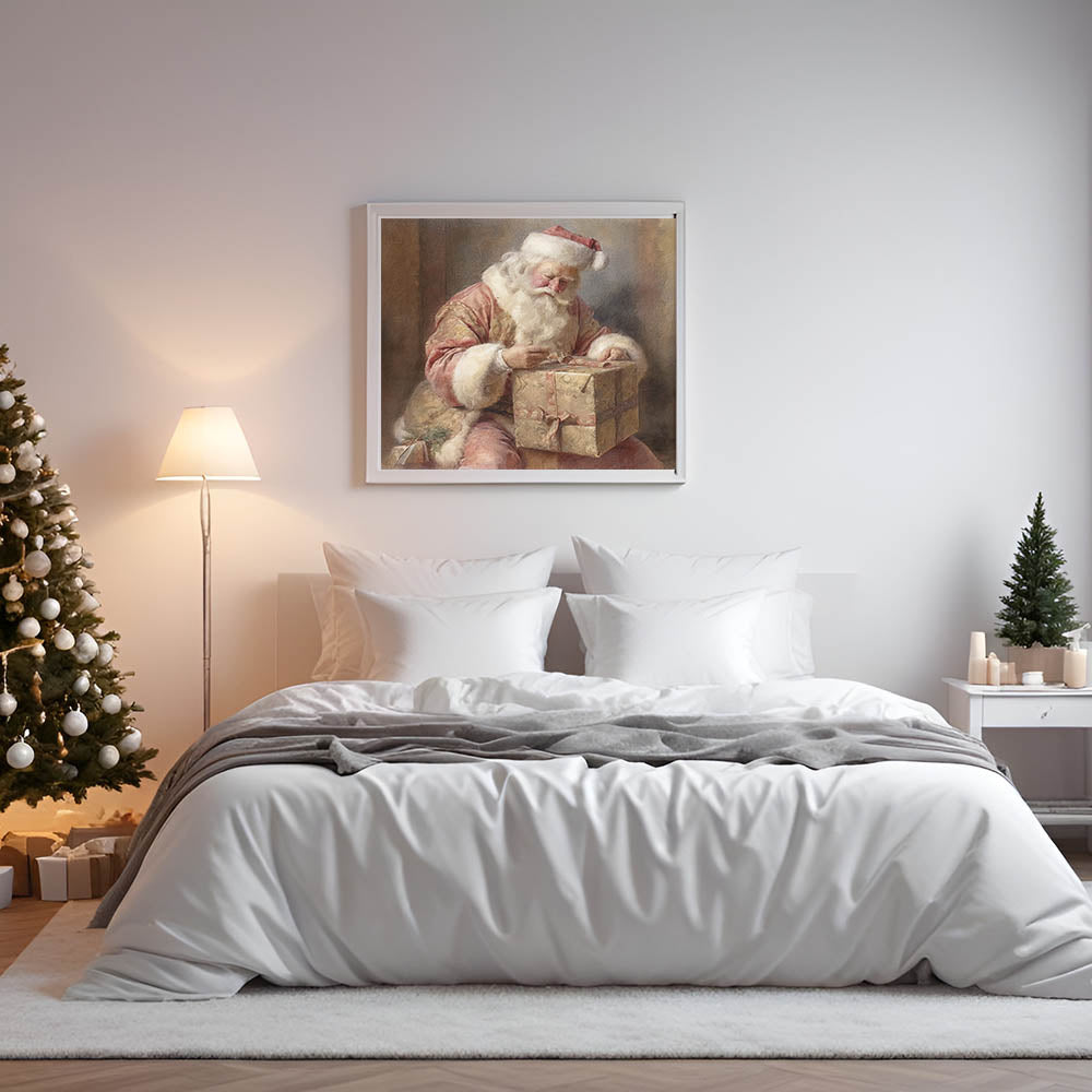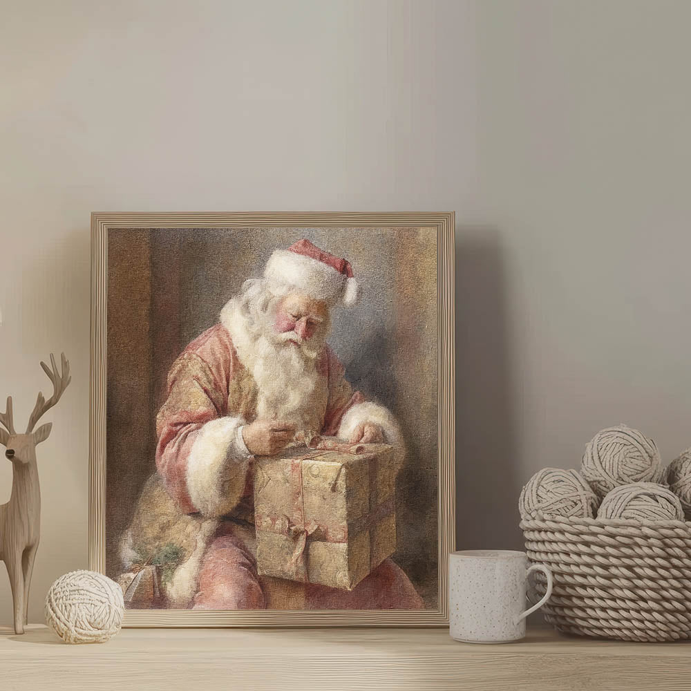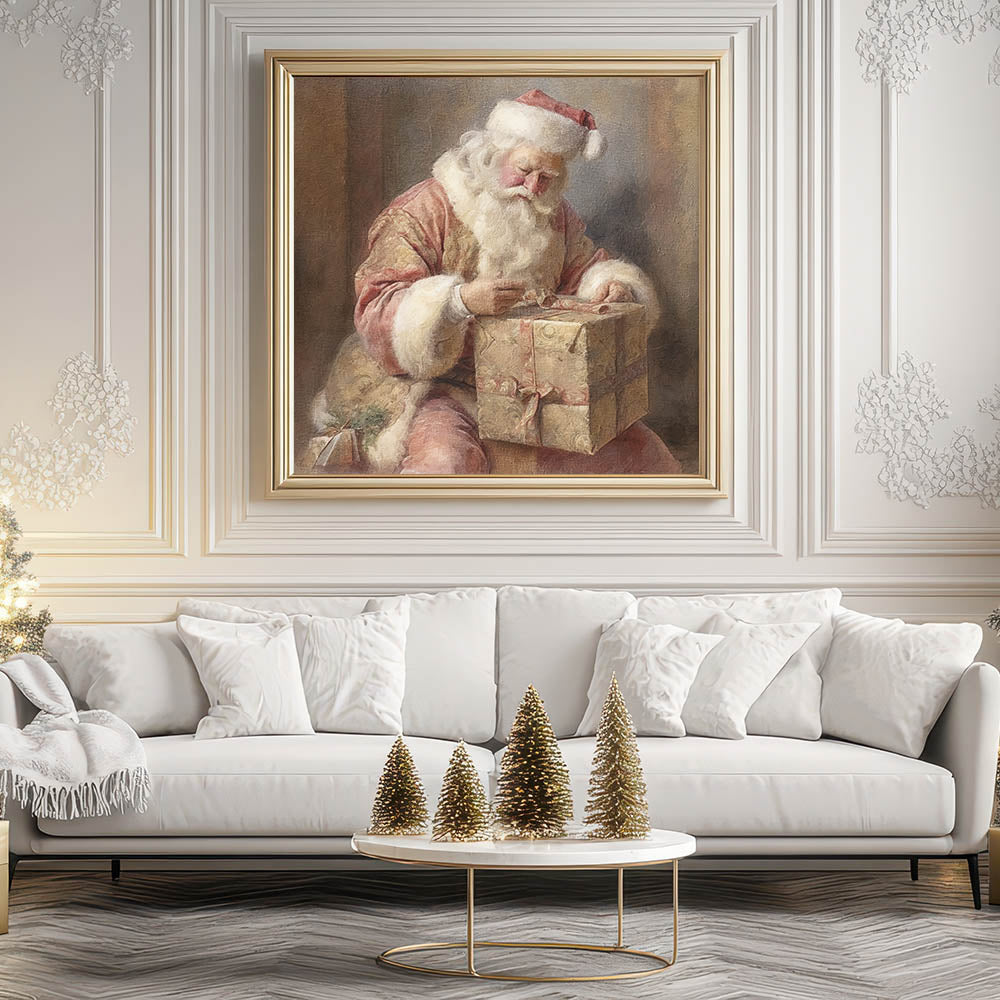 Add a nostalgic touch to your holiday decor with this heartwarming Christmas wall art, featuring Santa Claus wrapping a beautifully decorated gift. This festive canvas art captures the essence of Christmas traditions, bringing warmth and joy to any room. Available in high-quality formats such as stretched canvas, framed print, and acrylic glass, this artwork is designed to become a treasured part of your holiday collection.