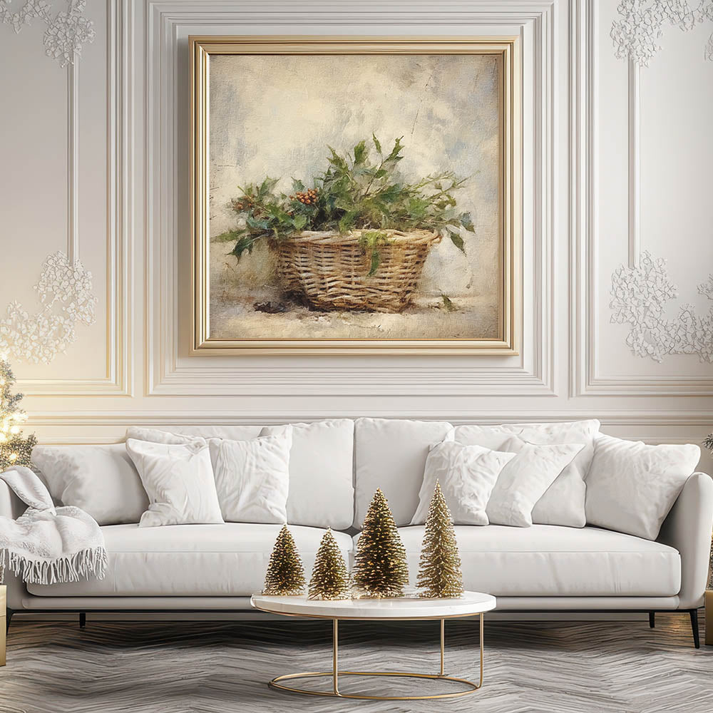 Bring a touch of rustic charm to your home this holiday season with this beautiful festive canvas art featuring a wicker basket filled with holly and berries. The vintage texture and natural design elements evoke a nostalgic and warm feeling, perfect for your Christmas and holiday decor. Whether you’re decorating your living room, dining room, or hallway, this artwork adds a cozy, traditional touch to any space.