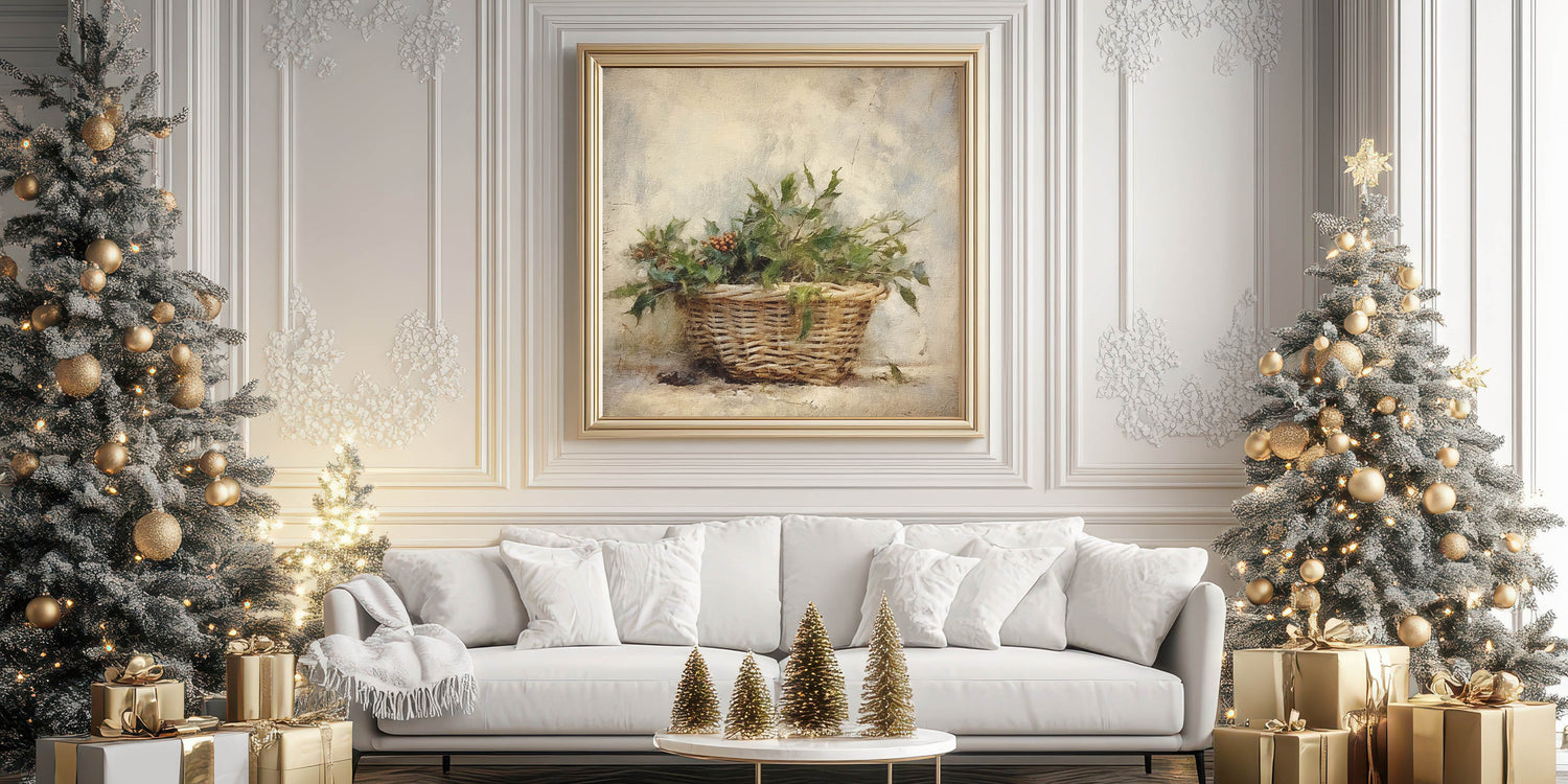 Festive Canvas Art - Rustic Holly Basket Christmas Wall Decorations