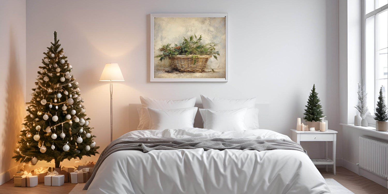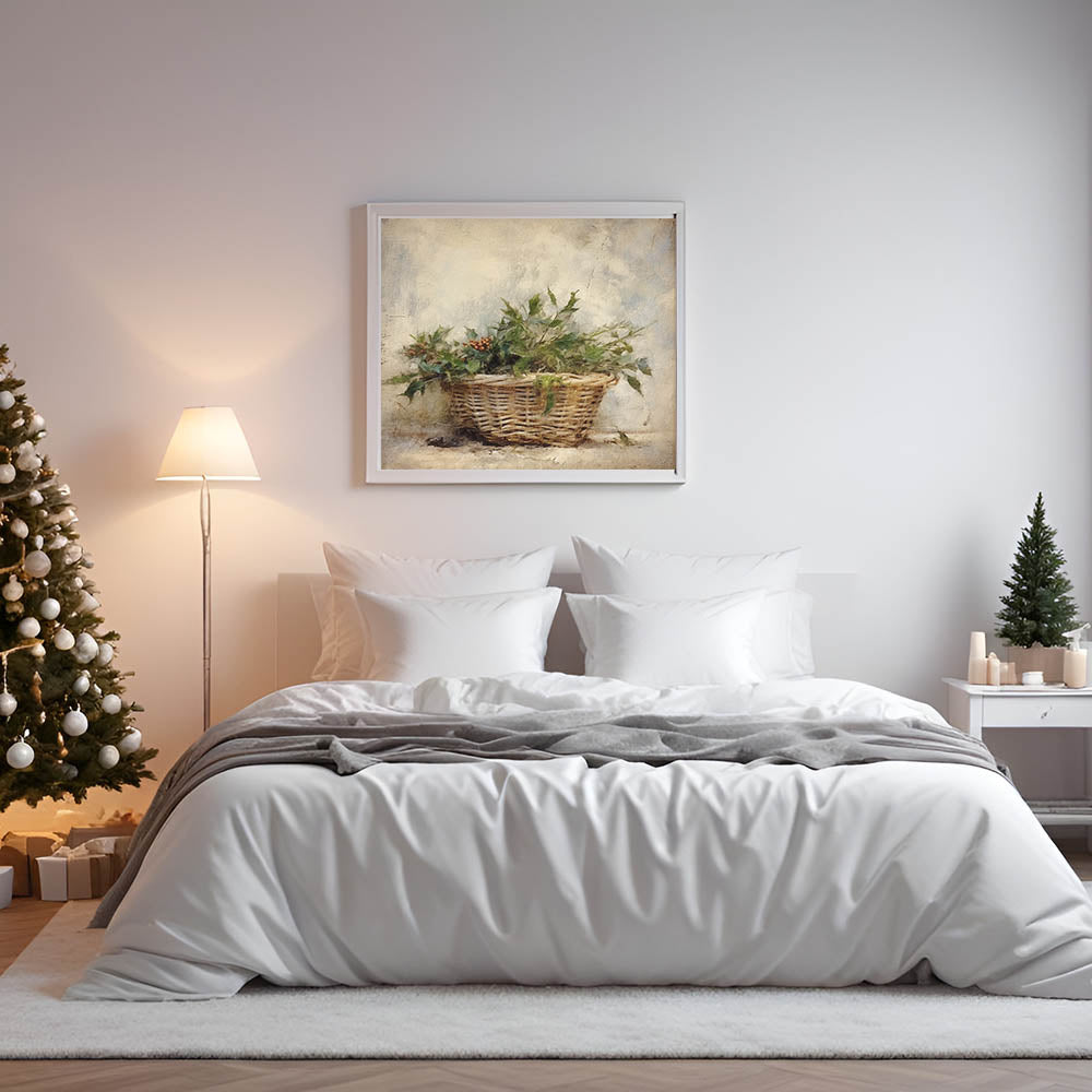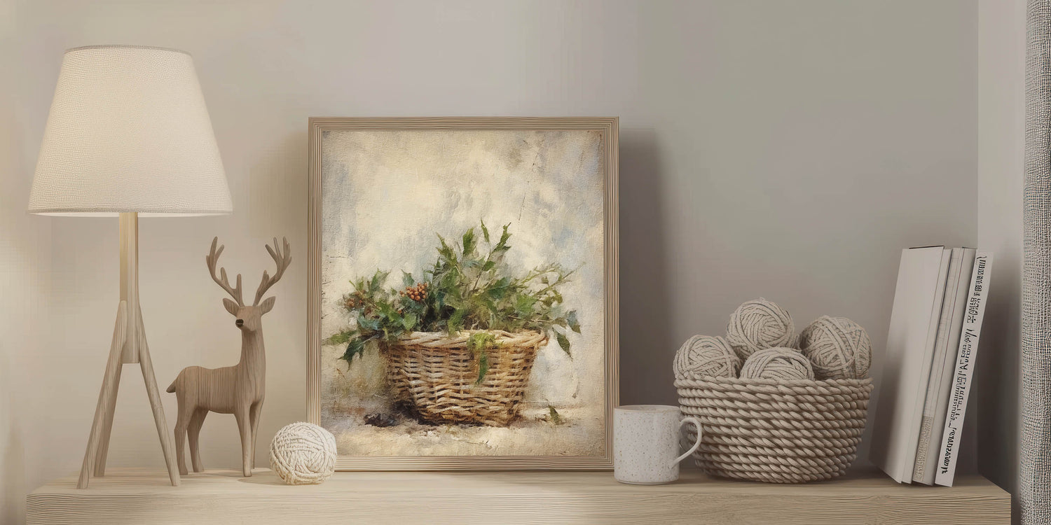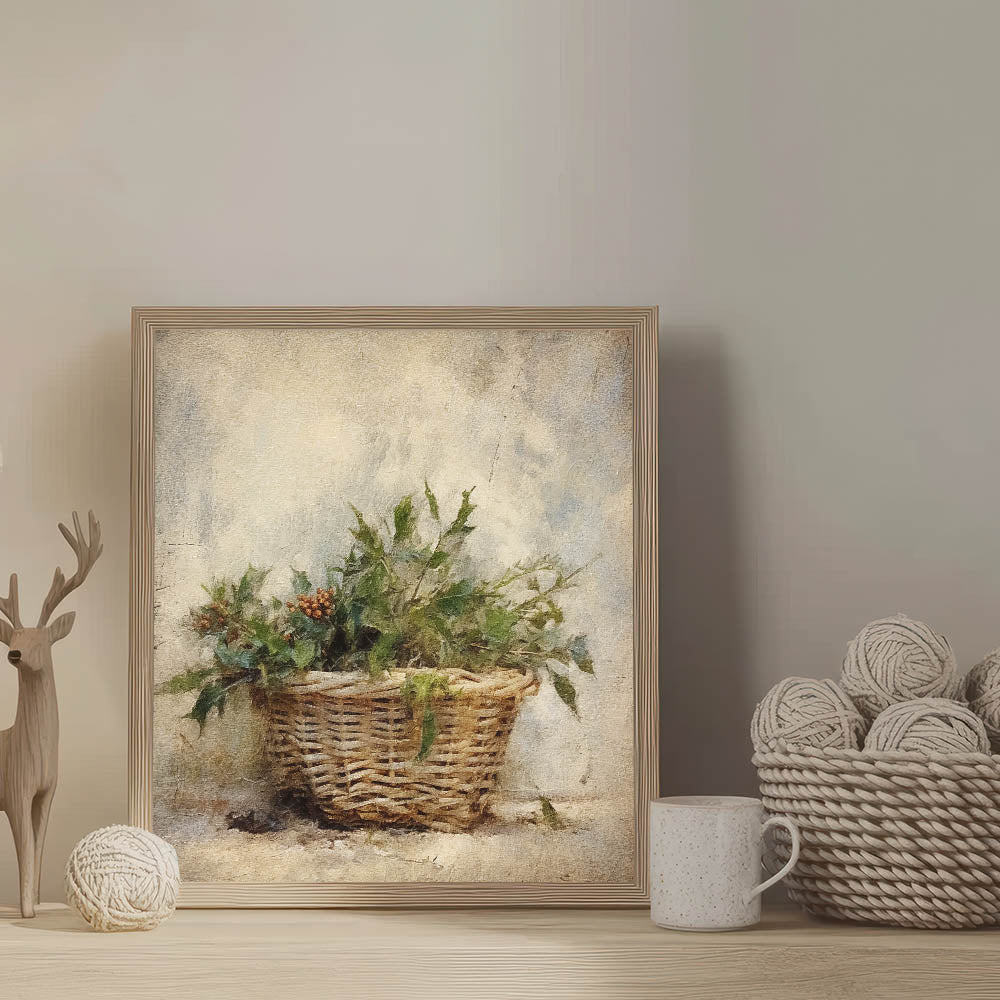 This unique Christmas wall art is a beautiful addition to your seasonal decorations, offering a timeless design that complements your festive home. Enhance your holiday decor with this rustic holly basket artwork, capturing the magic of Christmas.