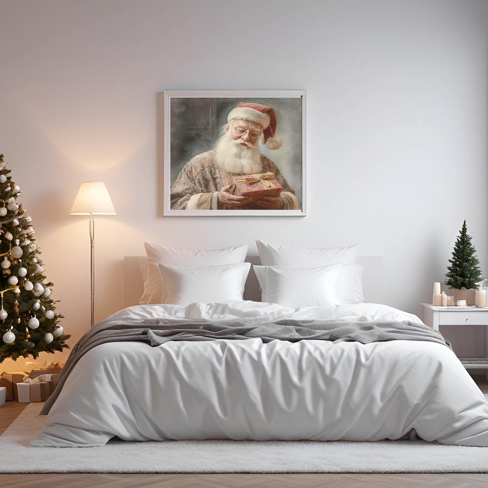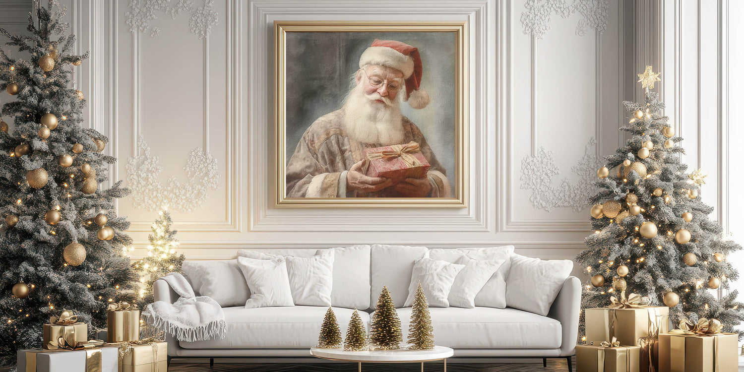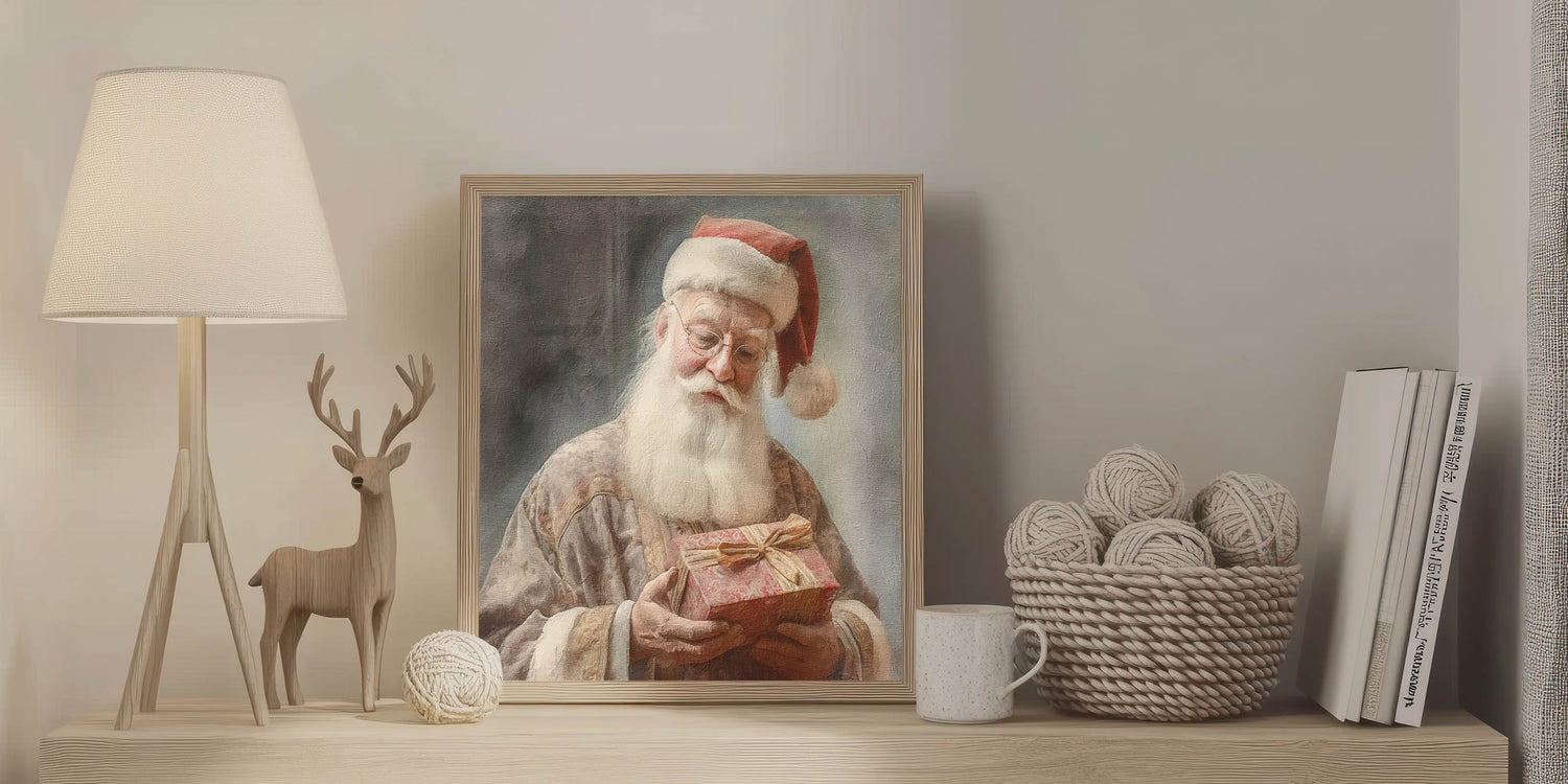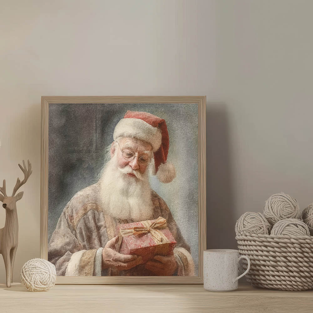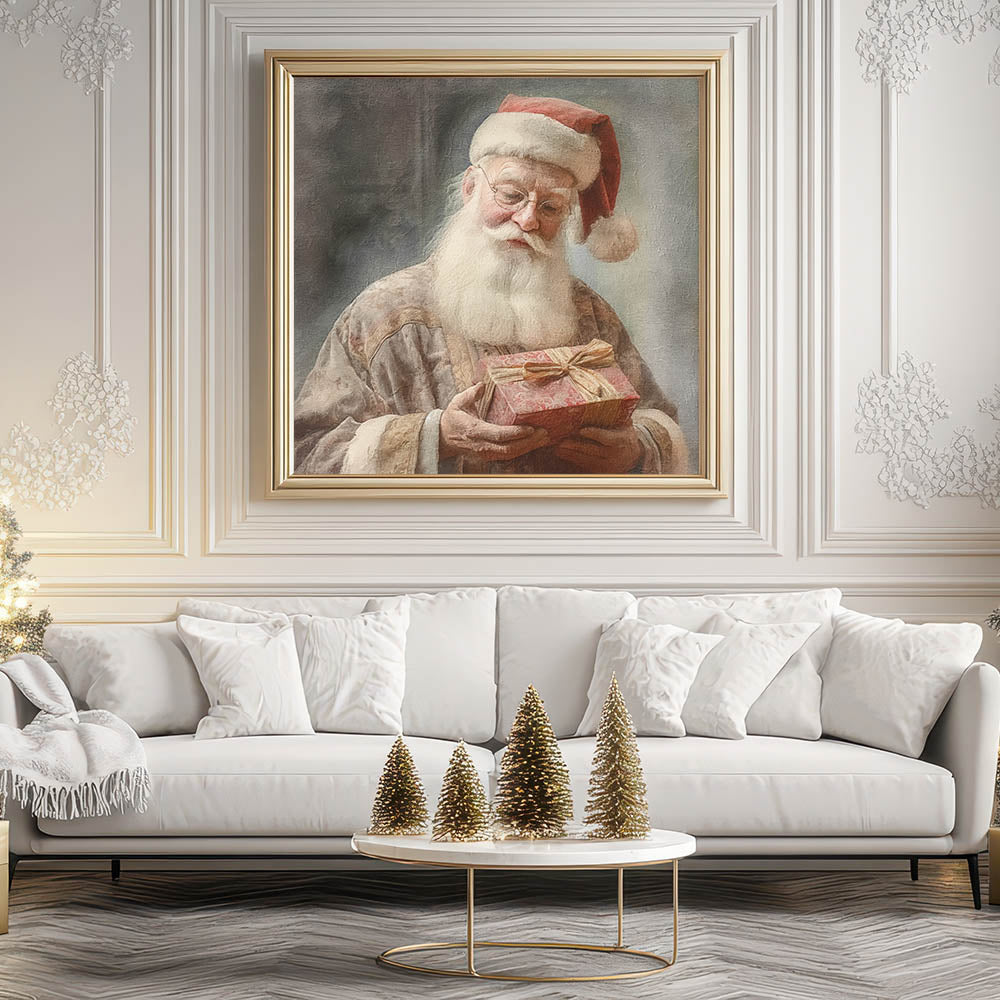 Add a touch of holiday charm to your home with this beautiful Christmas wall art featuring Santa Claus holding a lovingly wrapped gift. This festive artwork captures the magic and warmth of the season, making it a perfect addition to any holiday decor. Available in premium formats, including stretched canvas, framed canvas, and acrylic glass, this piece is crafted to bring the joy of Christmas to your home for years to come.