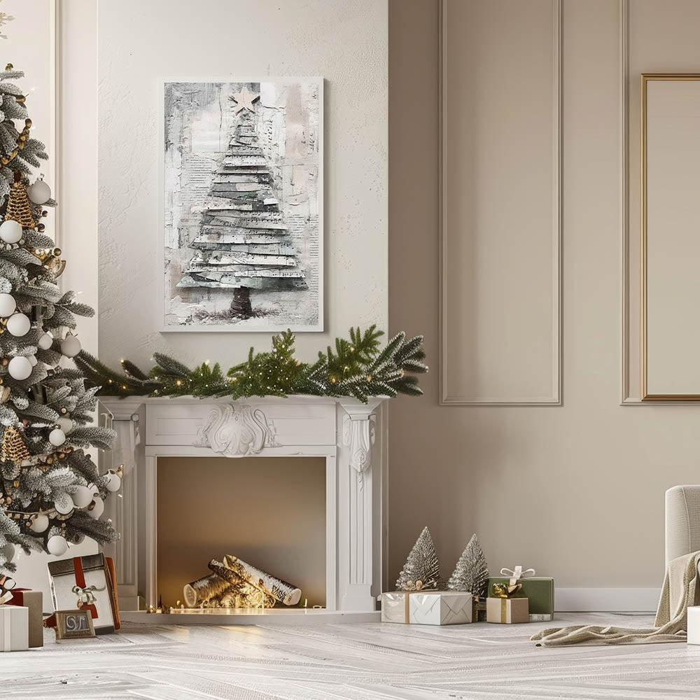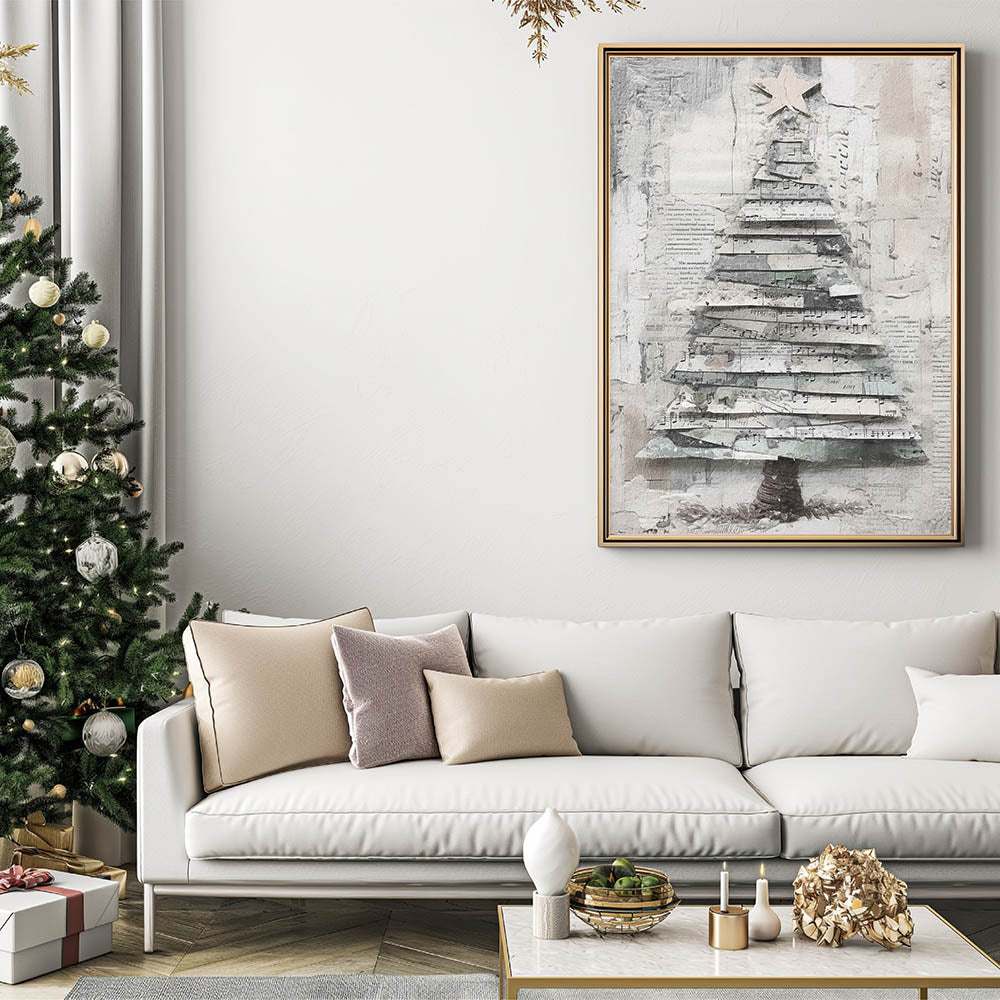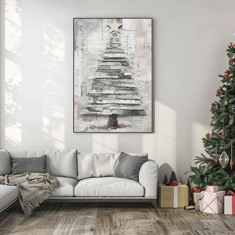 Add a harmonious touch to your holiday decor with this musical Christmas tree art print. Featuring a layered tree adorned with sheet music, this piece combines art and melody in soft gray and pale blue tones. Topped with a rustic star, it captures the festive spirit with a unique, vintage-inspired aesthetic that’s perfect for any room.