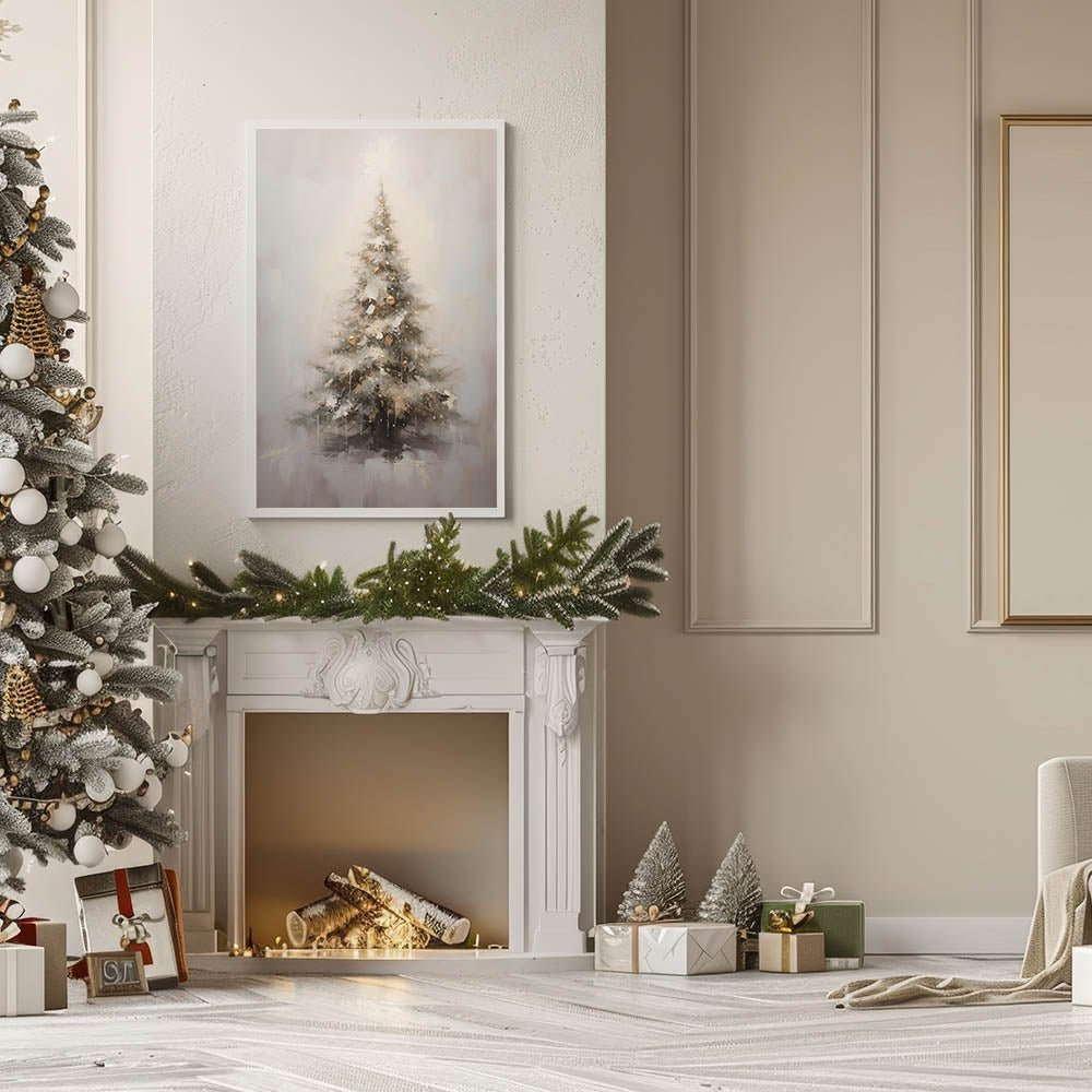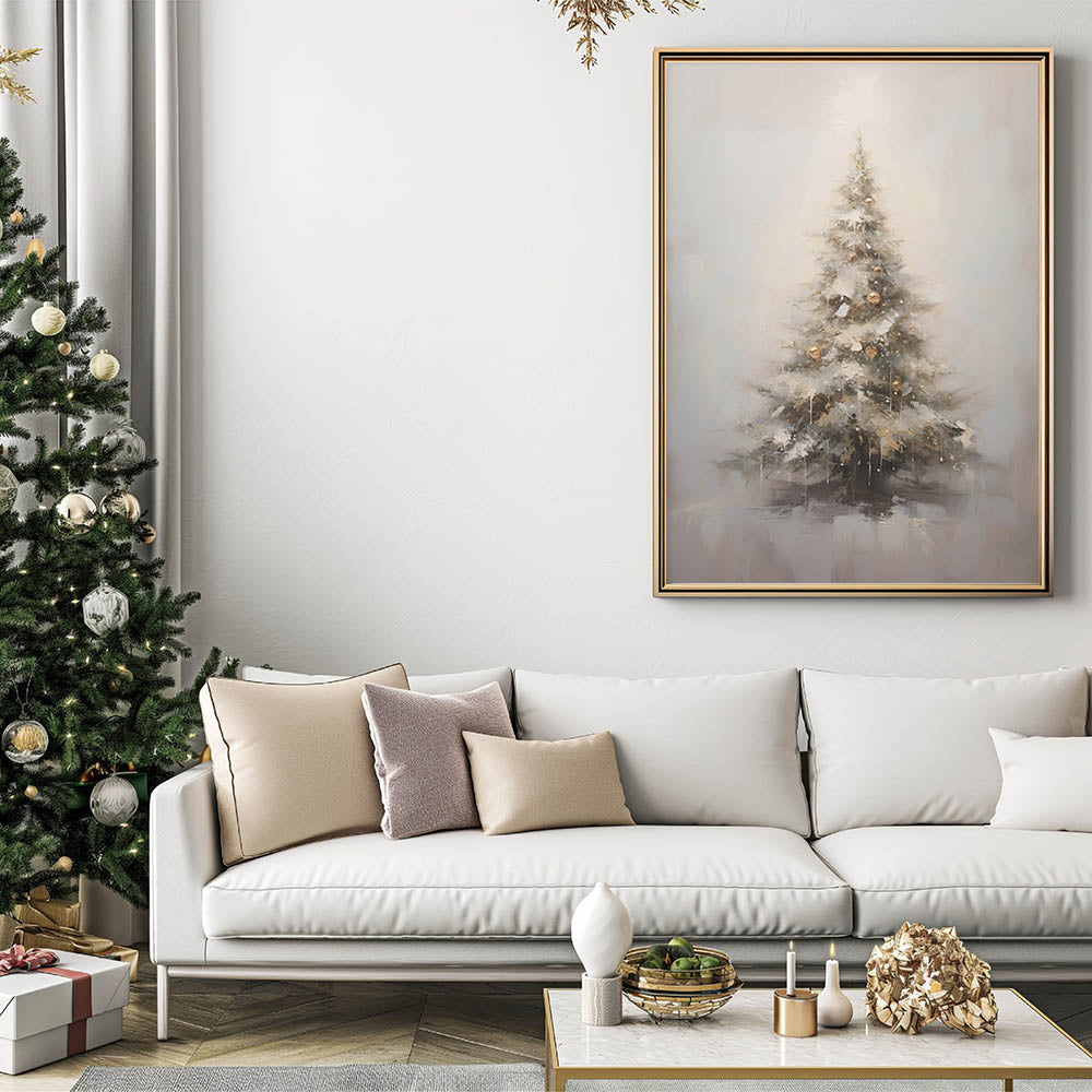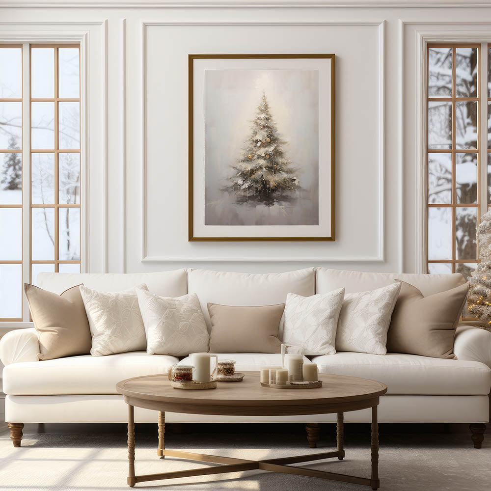 Capture the beauty of a wintery holiday scene with this stunning Christmas Wall Art, featuring a beautifully adorned Christmas tree covered in soft snow and golden ornaments. The muted tones of white, gold, and gray create a dreamy, serene atmosphere, making it the perfect addition to your seasonal decor. Whether placed in your living room, bedroom, or entryway, this Christmas Canvas Art adds a touch of winter wonder to any space.