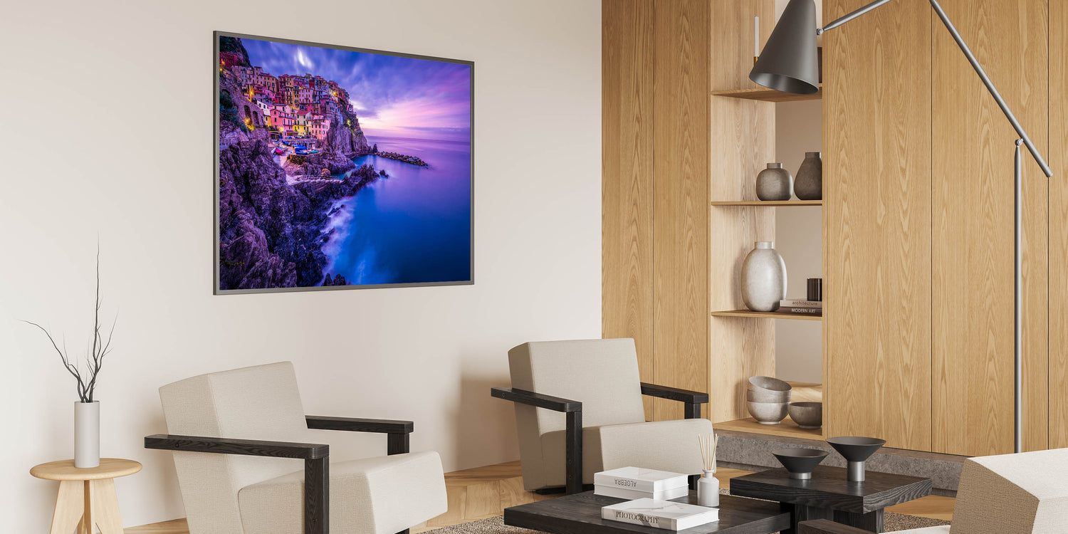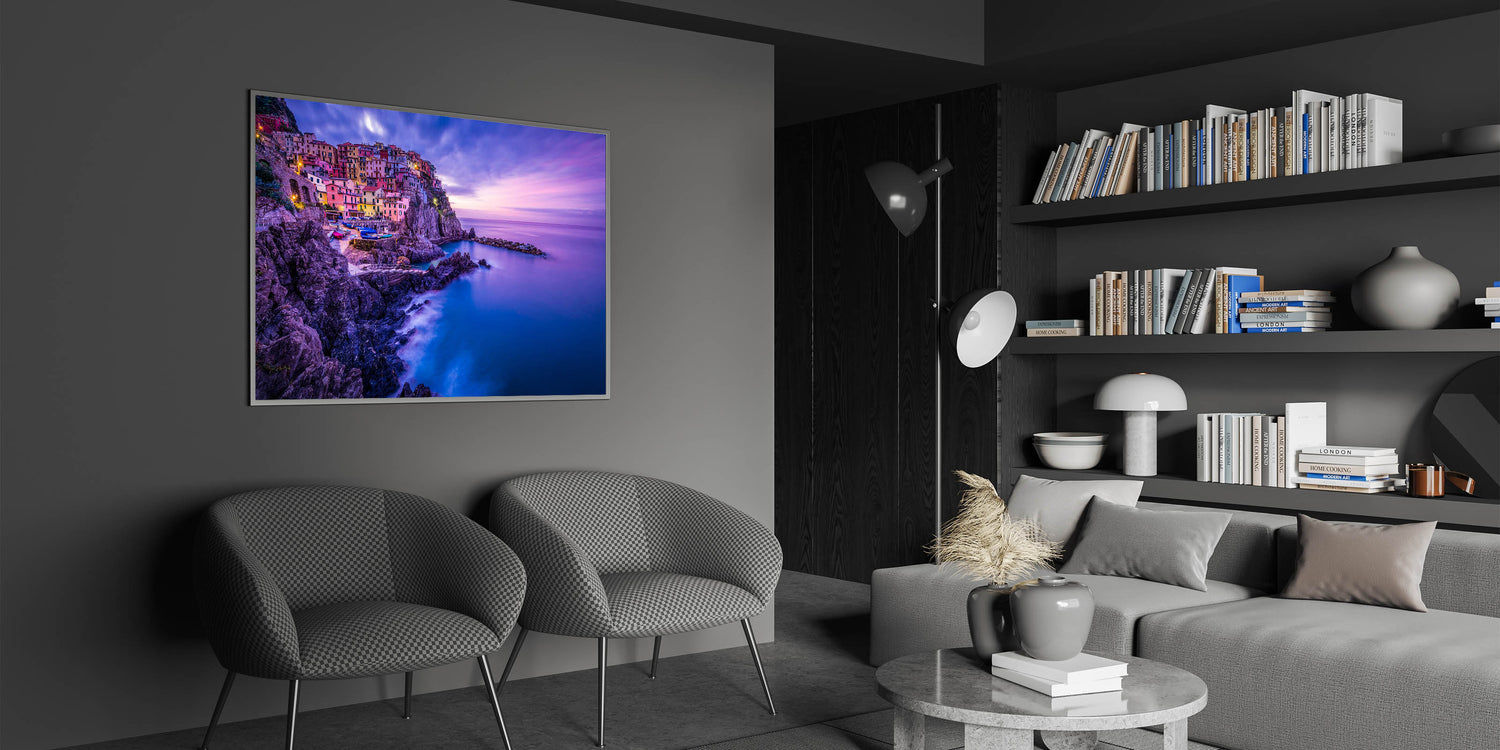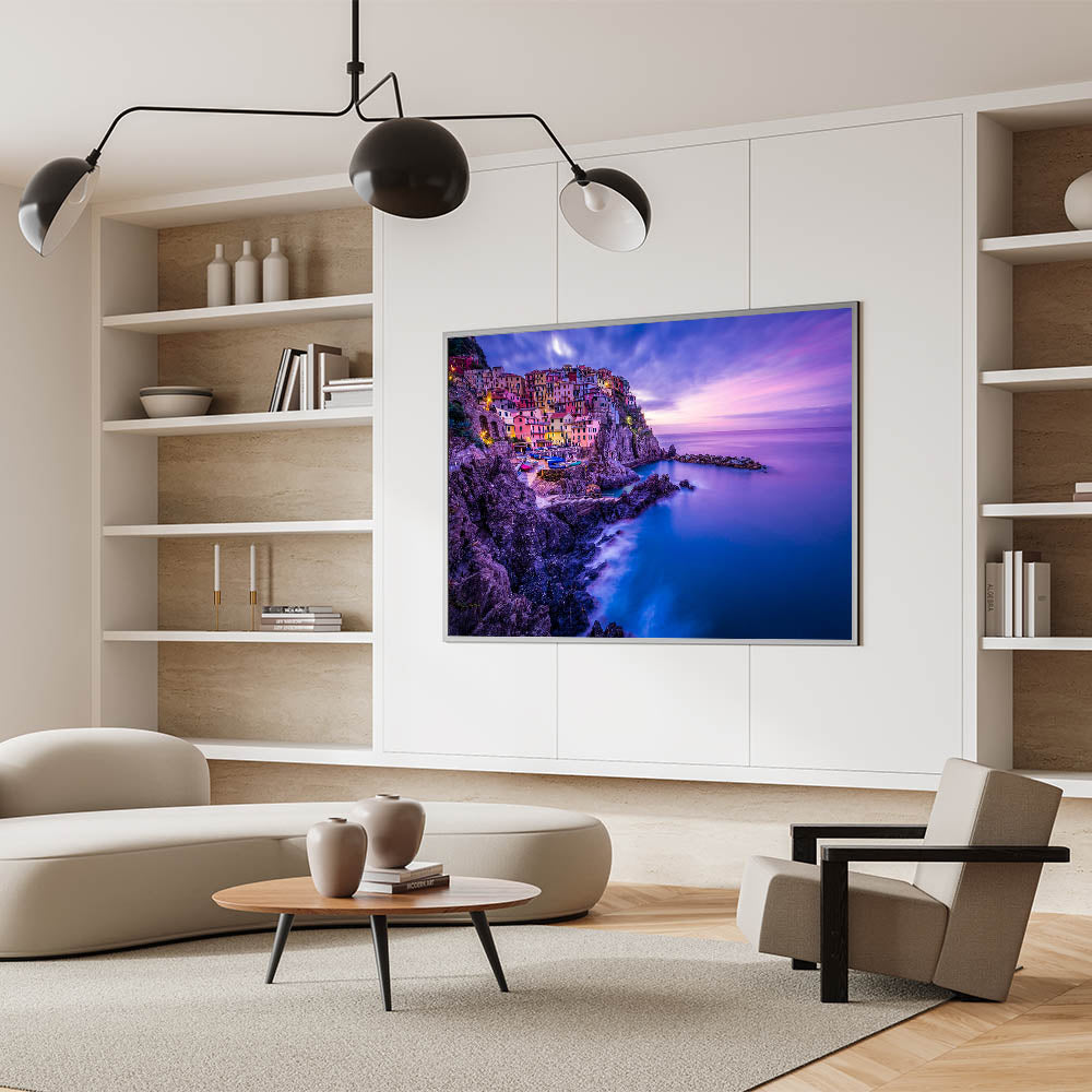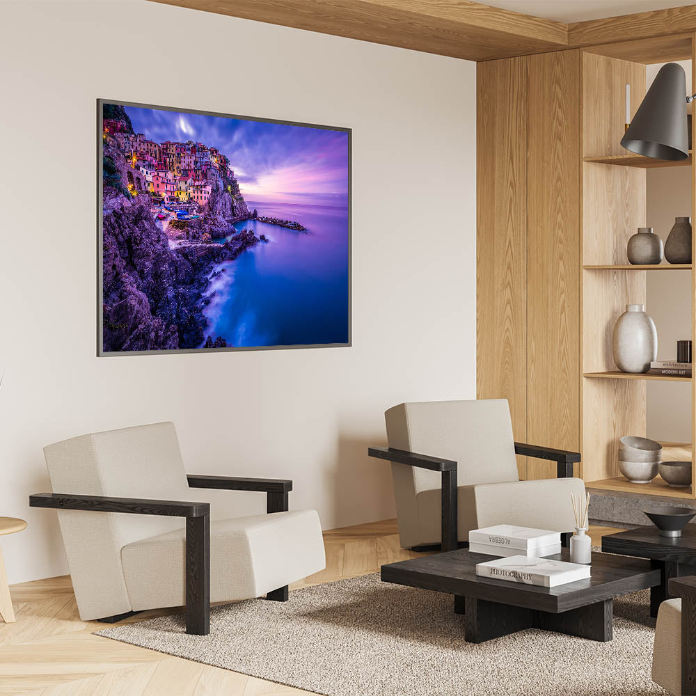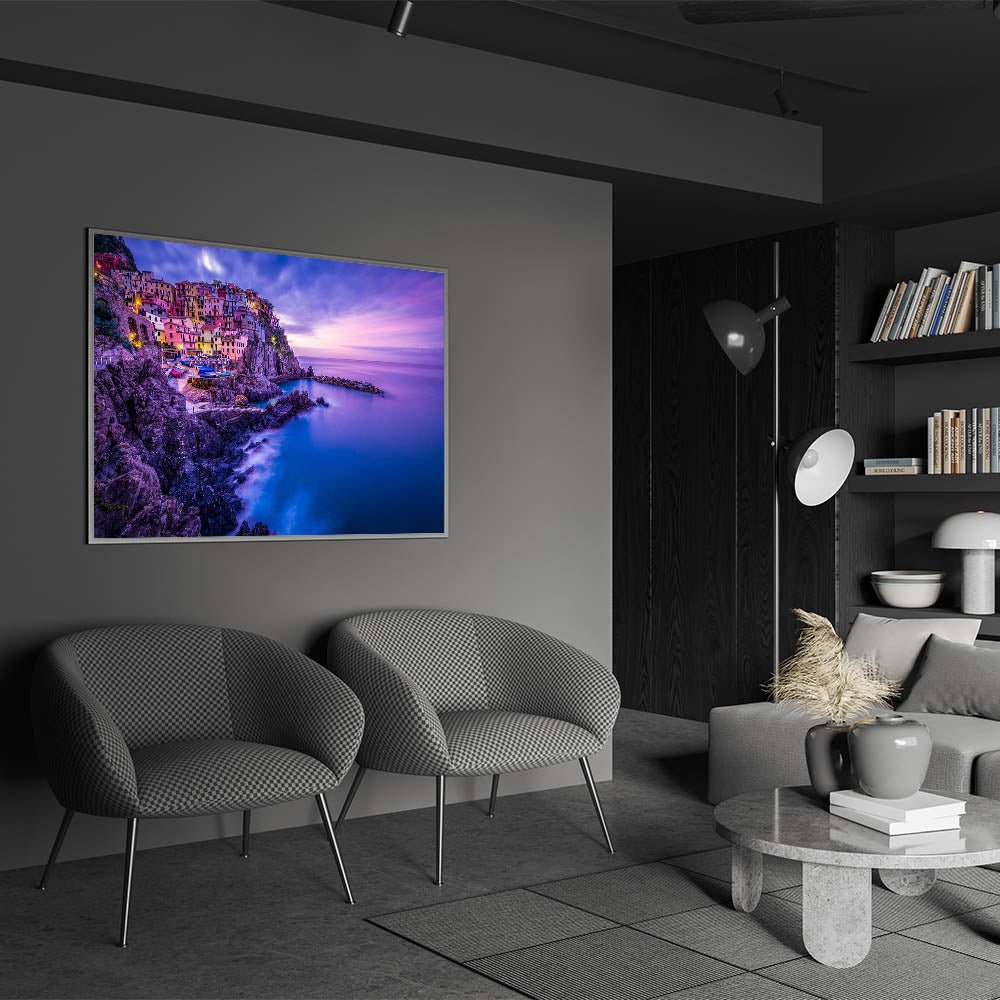 Transform your space with this stunning piece of Cinque Terre photography, showcasing the enchanting Italian village bathed in twilight hues of purple and blue. This vibrant coastal decor captures the essence of Cinque Terre’s unique charm, where colorful houses blend seamlessly into the rugged cliffs, overlooking the calm Mediterranean waters. Perfect for adding a touch of tranquility and elegance to any room.