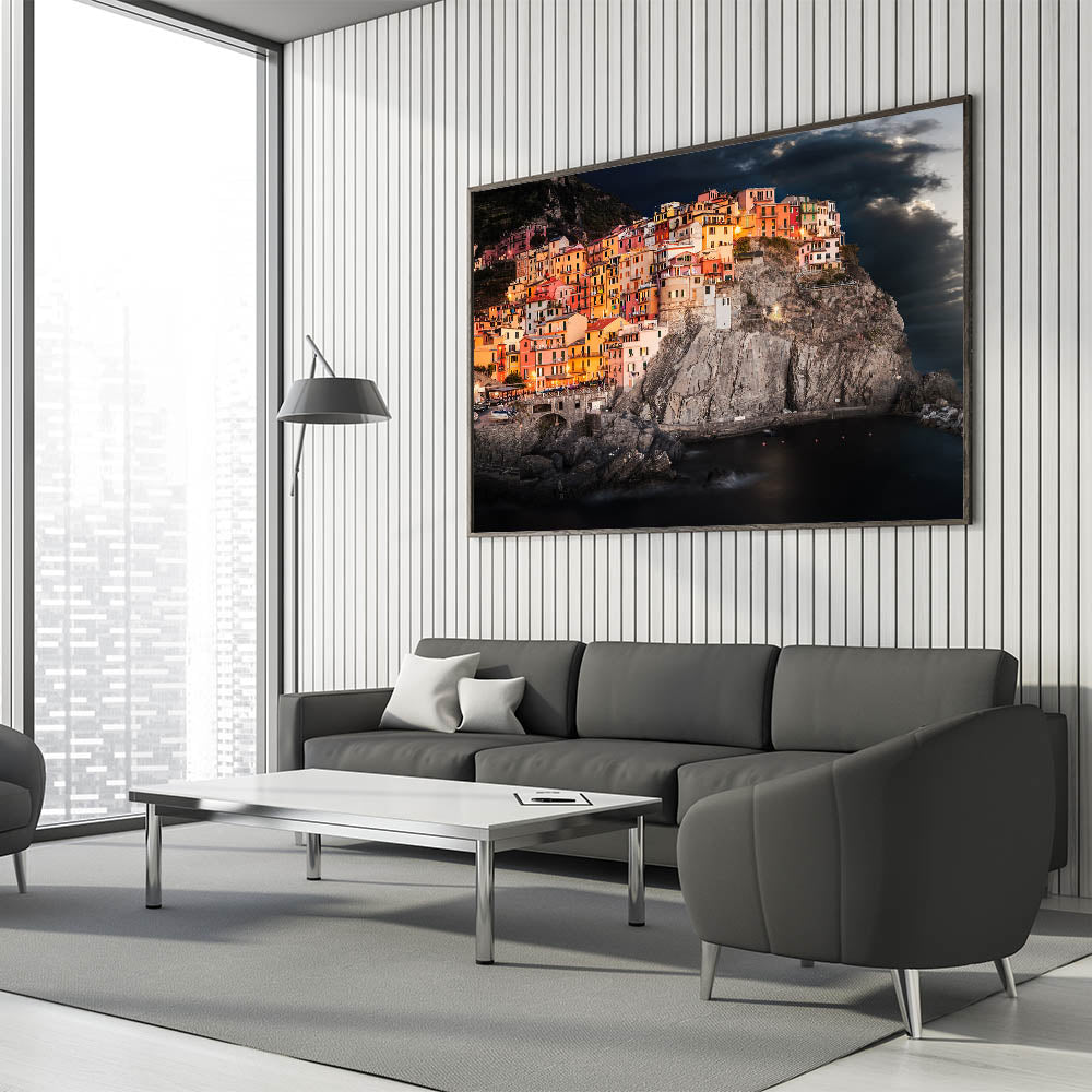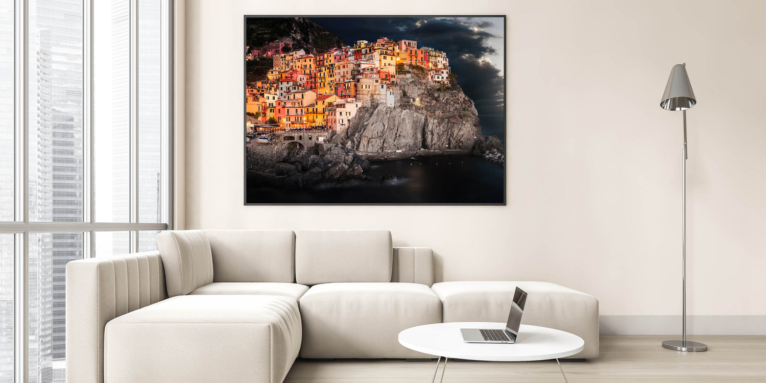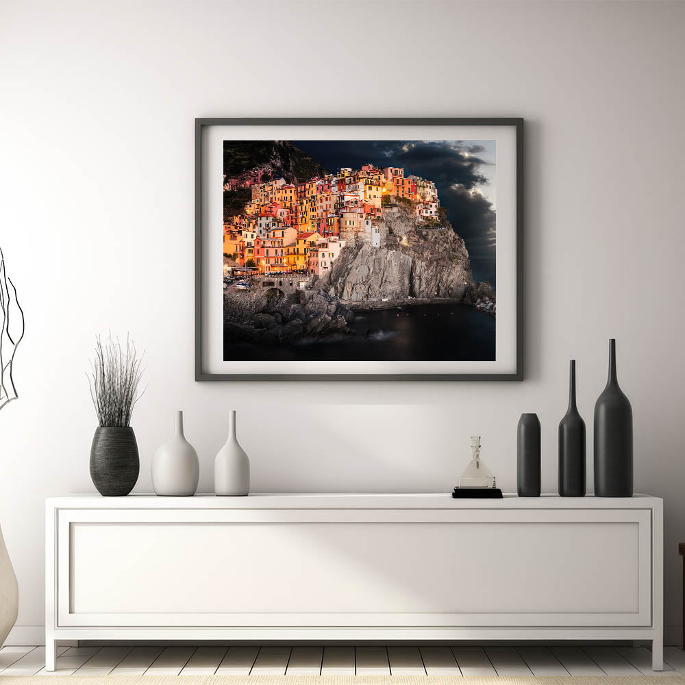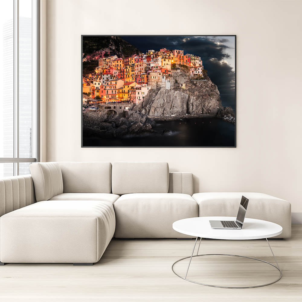 Bring the enchanting beauty of the Italian Riviera into your home with this stunning Cinque Terre Wall Art. This vibrant artwork captures the iconic coastal village of Cinque Terre, with its colorful buildings illuminated by the soft glow of evening lights. Perfect for adding a touch of Italian coastal decor to any room, this piece exudes warmth and Mediterranean charm.