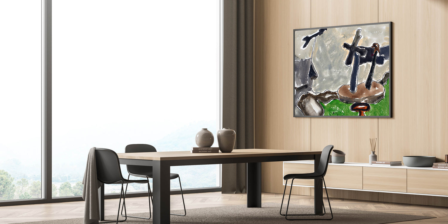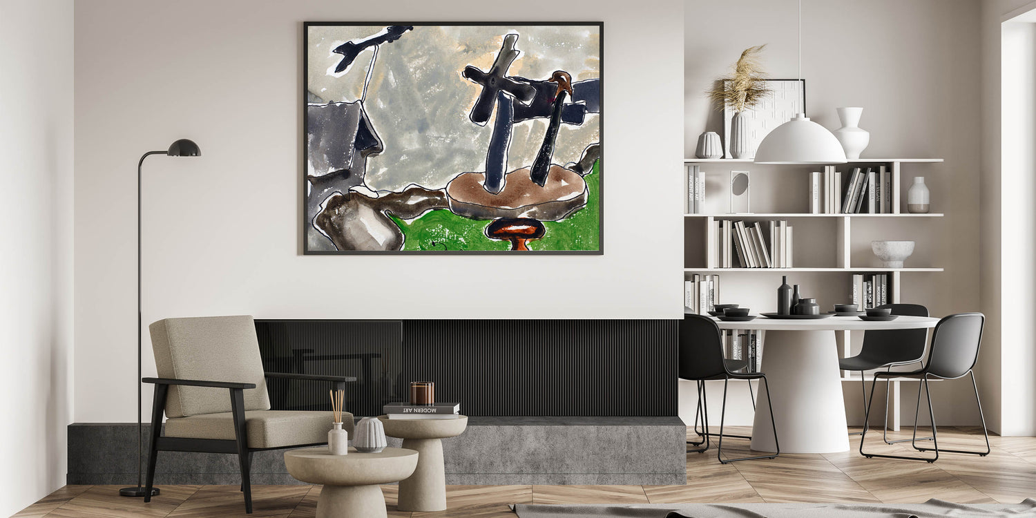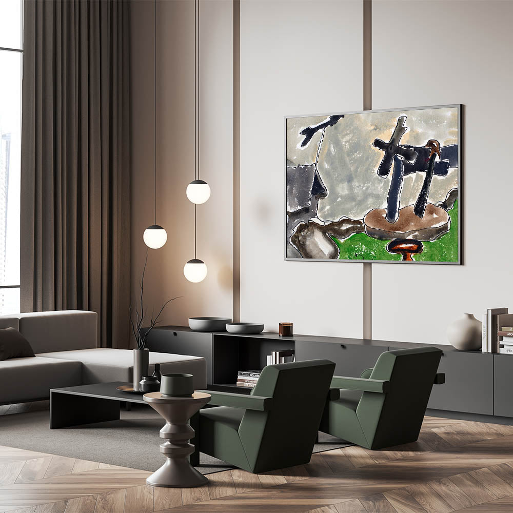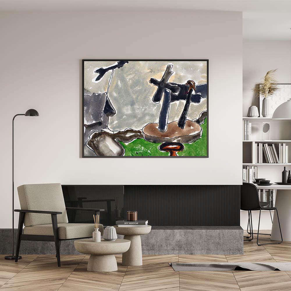 Add a unique perspective to your space with Arthur Dove's "Landscape with Weather Vane." This abstract landscape combines earthy tones with striking black and green accents, centering on a bold weather vane. Dove’s use of simplified shapes and muted colors creates a modern, contemplative mood, perfect for contemporary and eclectic decor styles.