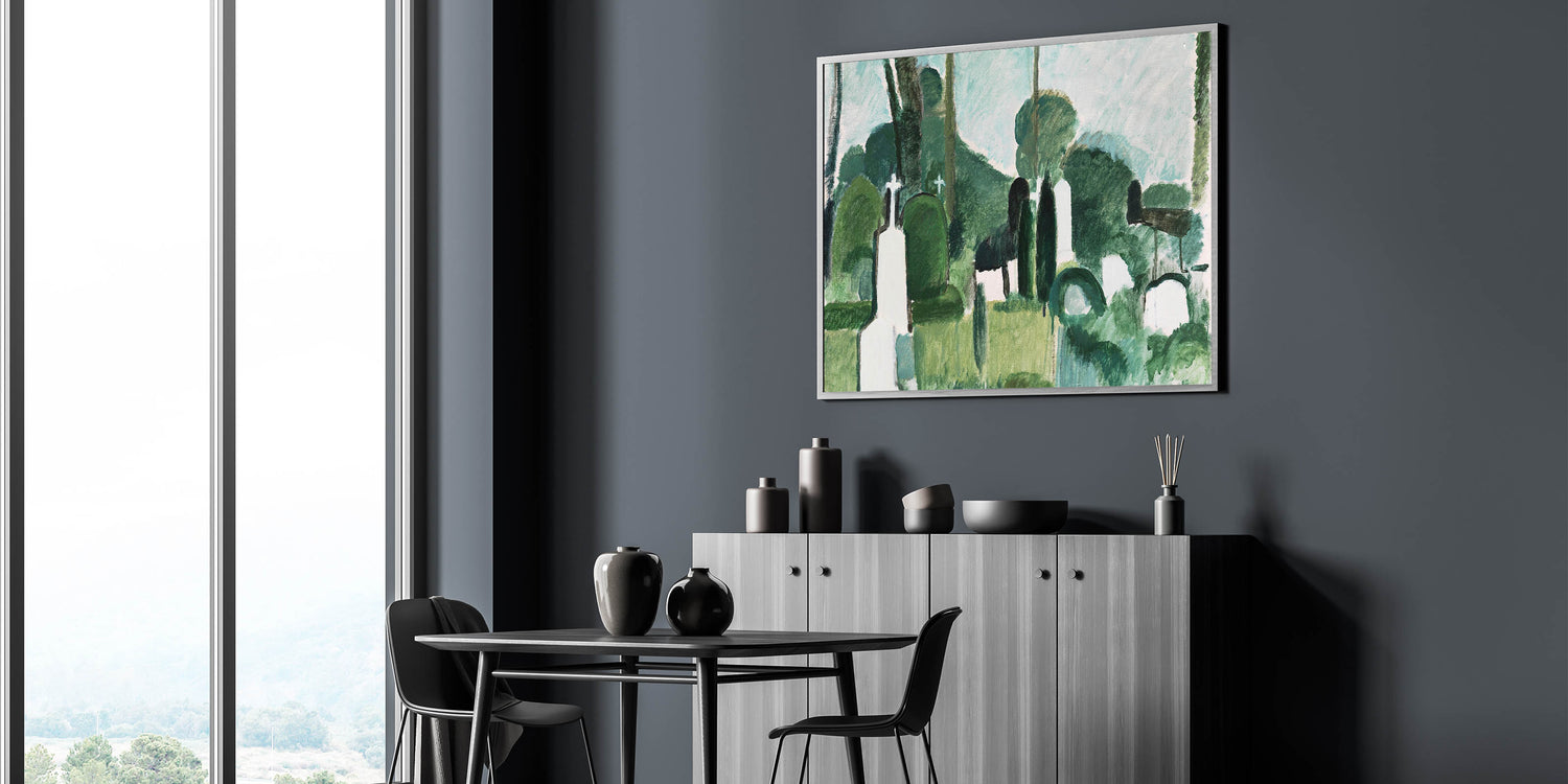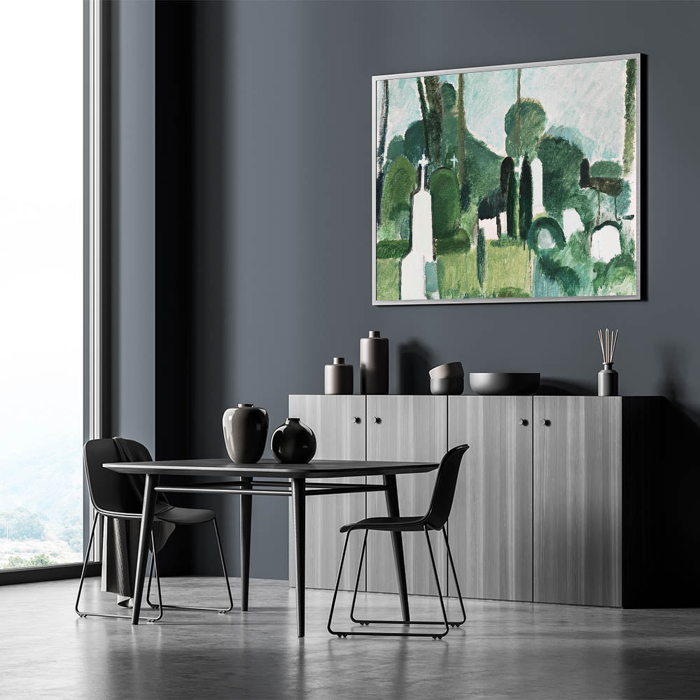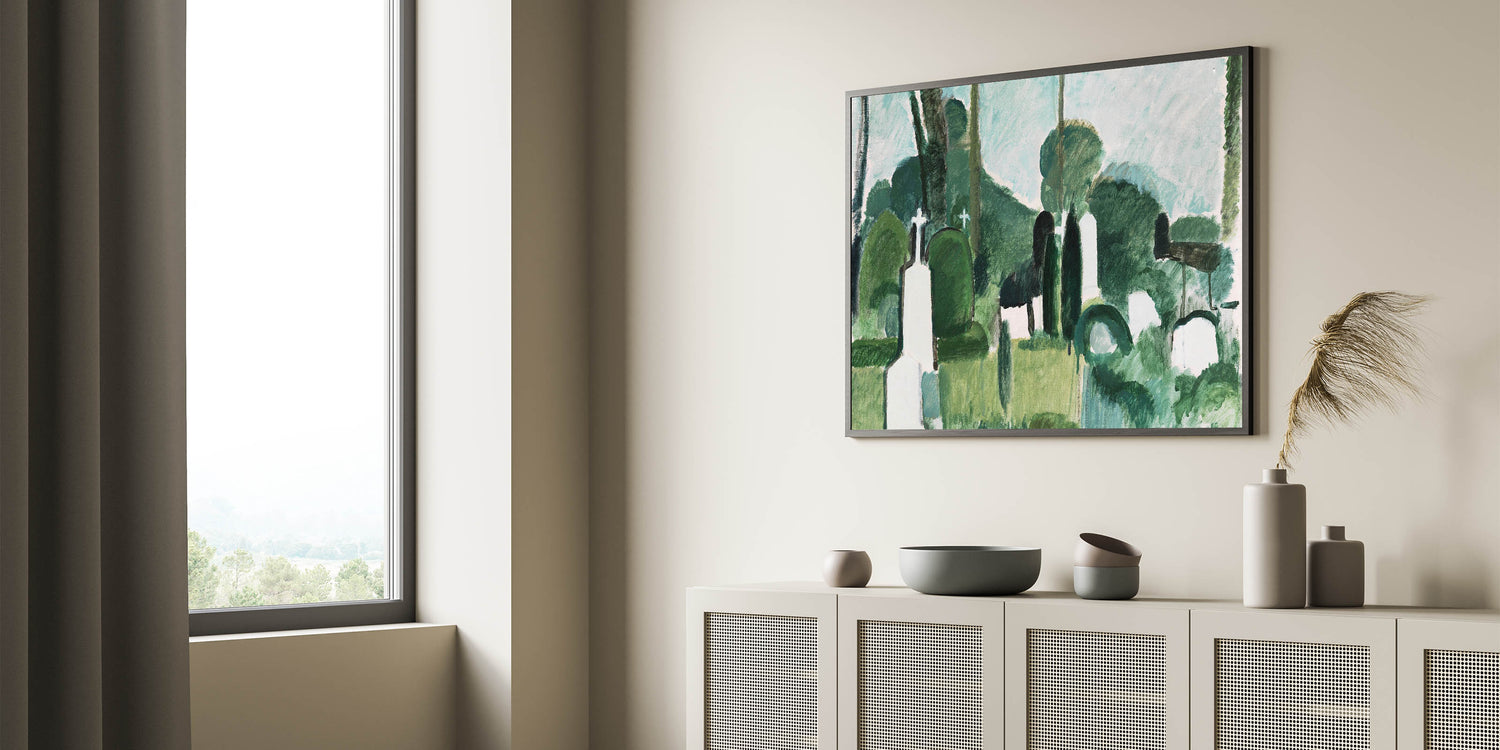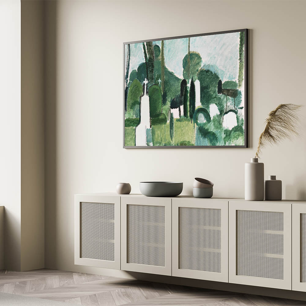 Introduce tranquility and a touch of abstract beauty to your space with this modern wall art inspired by Harald Giersing's "The Cemetery in Svanninge" (1920). This captivating piece features abstract shapes of tombstones and trees in a soft, serene green landscape. The dynamic brushstrokes and minimalist composition create a calming atmosphere, making it an ideal addition to modern or contemplative interiors.