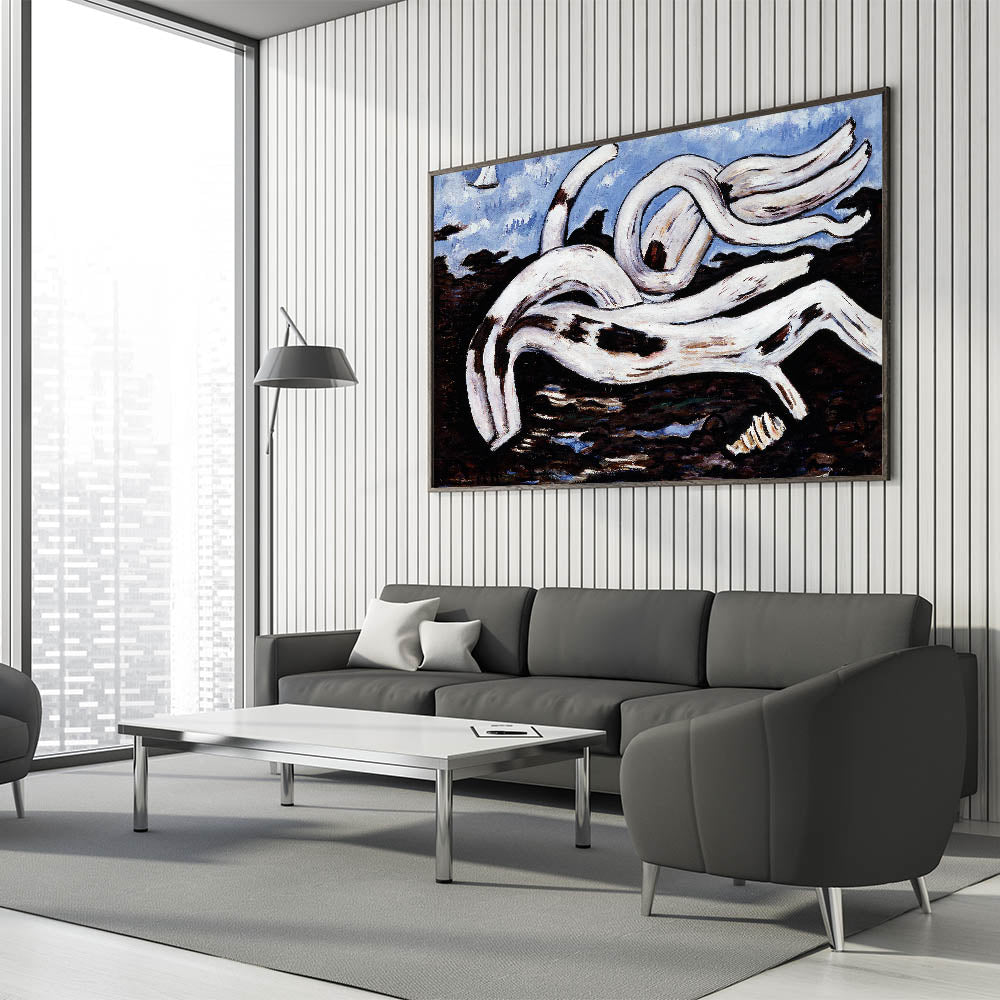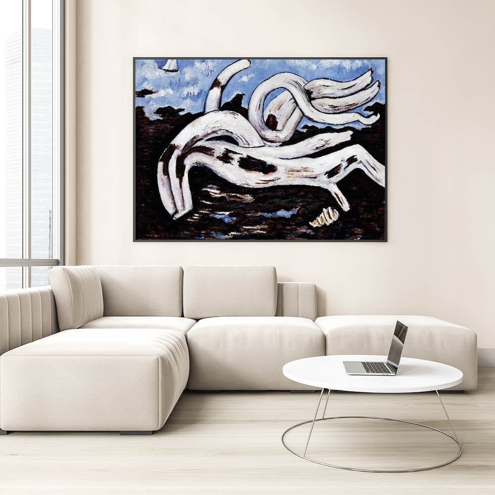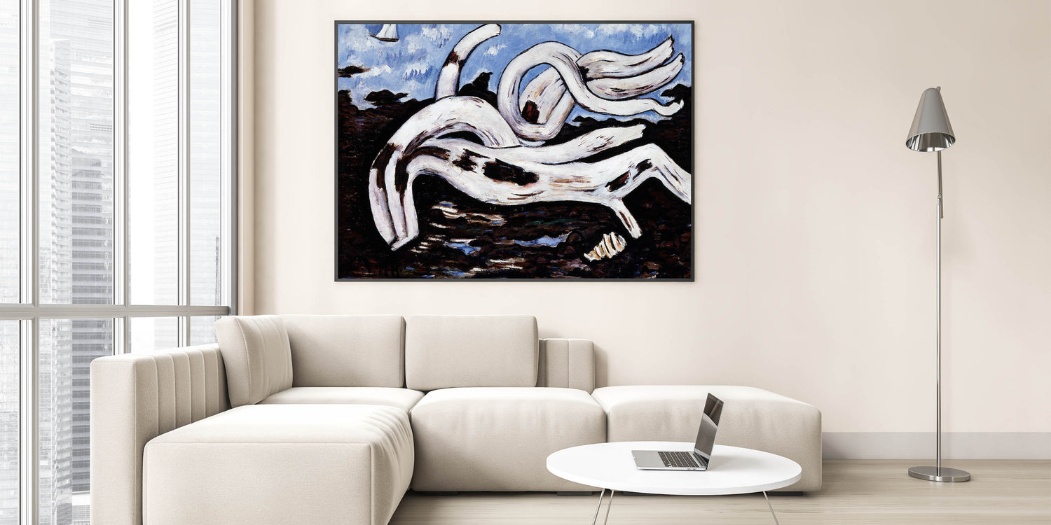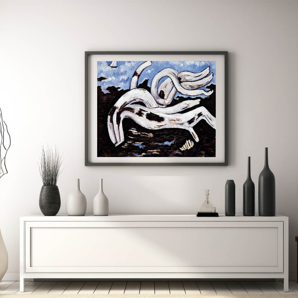 Add a striking focal point to your space with this bold modern wall art inspired by Marsden Hartley’s "Driftwood on the Bagaduce" (1939–1940). This abstract masterpiece depicts fluid, twisting driftwood forms set against a dramatic coastal background of deep earthy tones and a serene blue sky. The expressive brushstrokes and contrasting palette embody a sense of movement and natural beauty, making it an ideal choice for contemporary and artistic interiors.