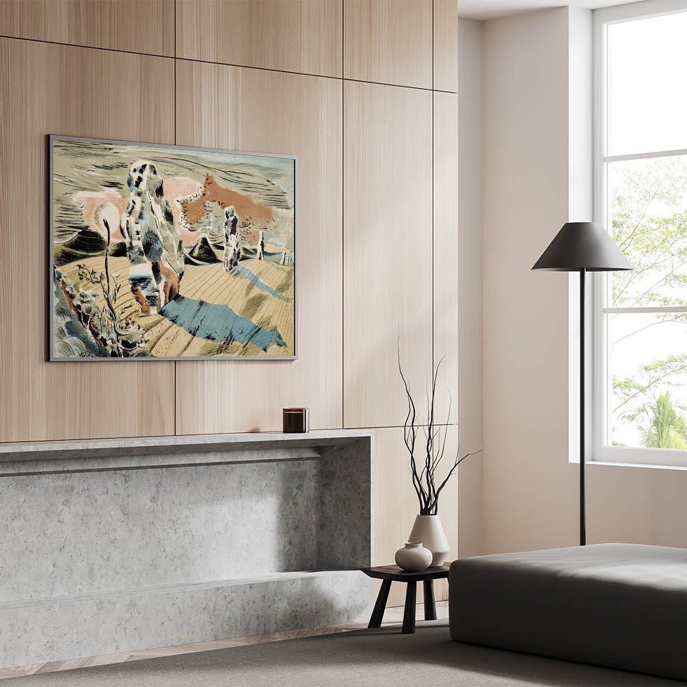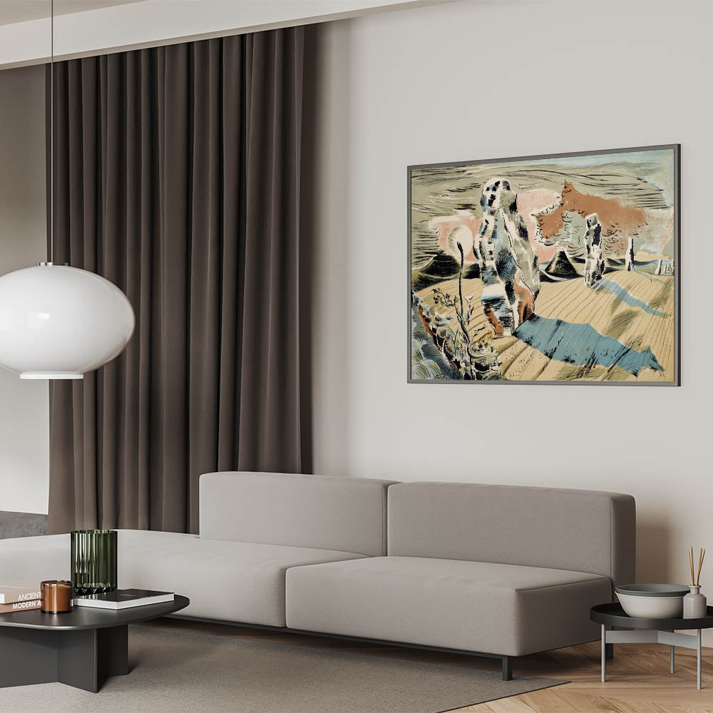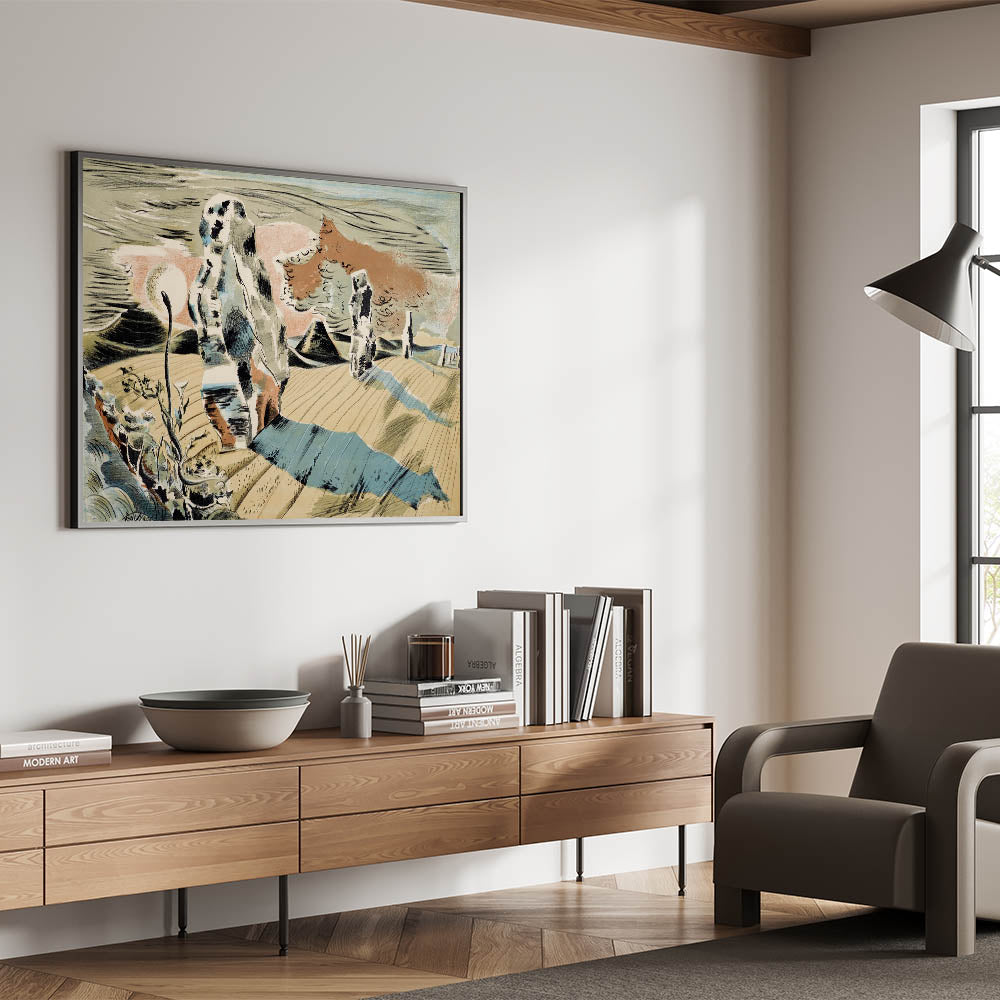 Transform your space with this modern wall art, inspired by Paul Nash's Avebury (1937). This abstract landscape blends muted tones of beige, blue, and green, with organic forms evoking a surreal yet tranquil atmosphere. Perfect for fans of contemporary art, this piece creates a connection between modernity and natural beauty, making it ideal for trendy home decor.