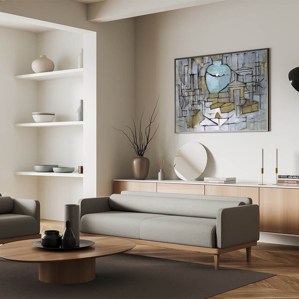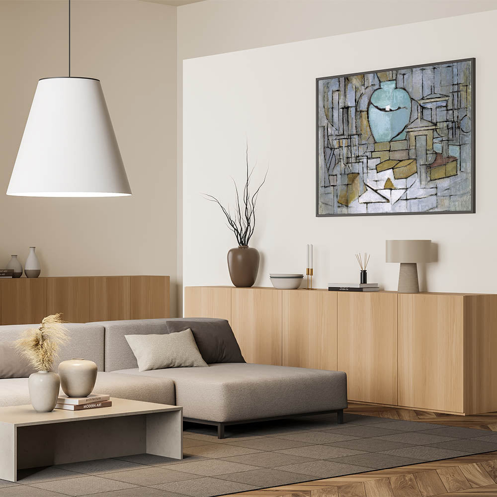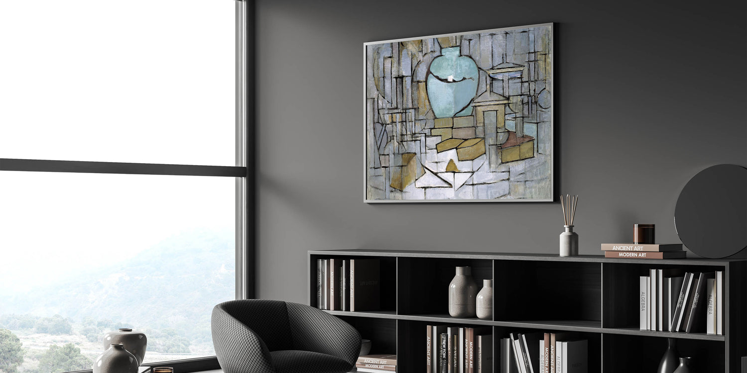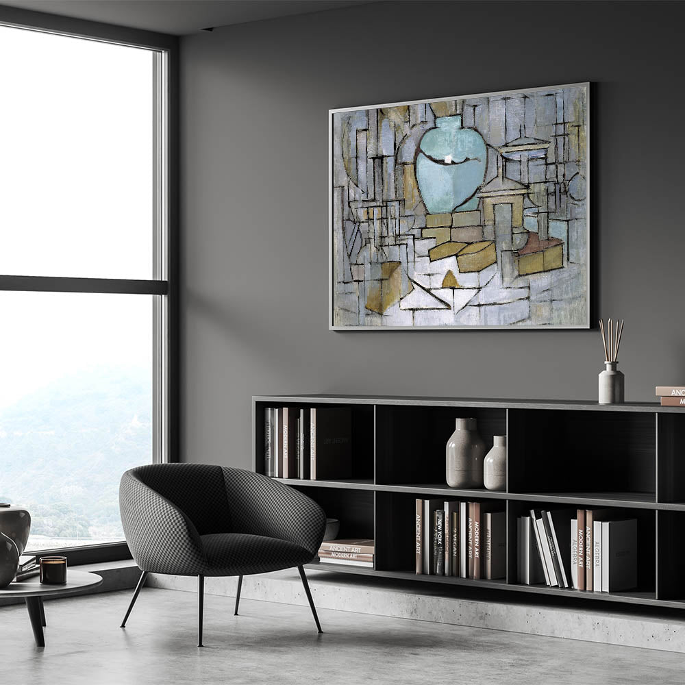 Elevate your interior decor with this abstract still life featuring a gingerpot. With a blend of soft grays, blues, and muted earth tones, this modern wall art brings a serene yet sophisticated vibe to your space. Inspired by cubist influences, this piece captures the elegance of everyday objects through a contemporary lens.
