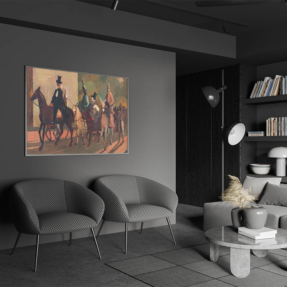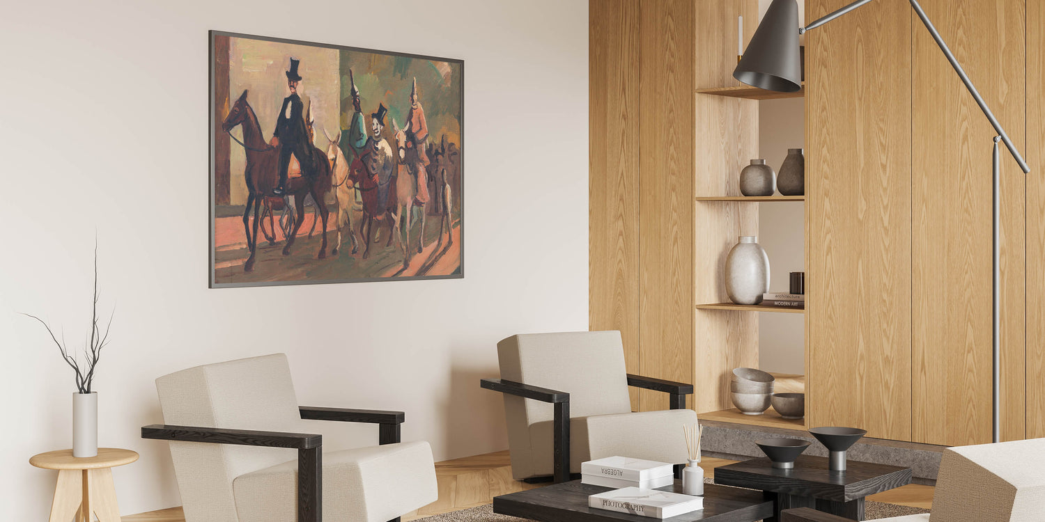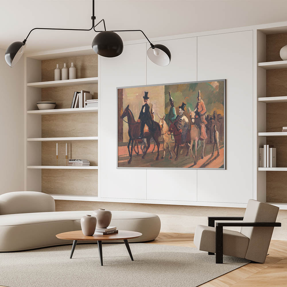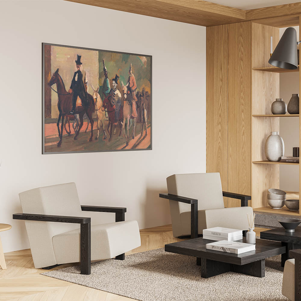 Celebrate the drama and whimsy of performance art with this Modern Wall Art, showcasing a colorful equestrian parade featuring clowns and performers on horseback. Rendered in a bold expressionist style, the painting captures dynamic movement and vibrant emotions through its rich earthy tones and striking contrasts. This piece is perfect for Trendy Home Décor, adding character and a sense of story to your space.