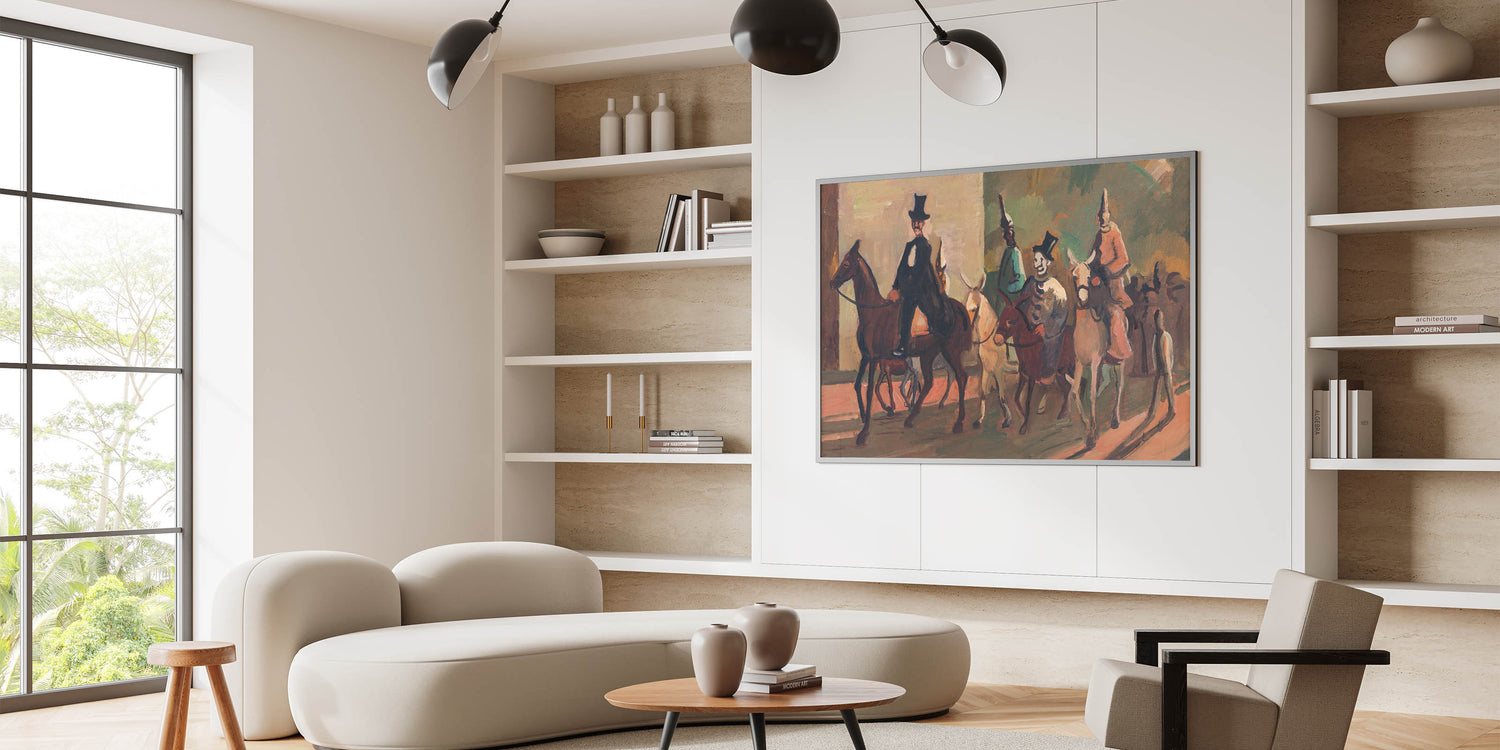 Modern Wall Art: Equestrian Parade with Clowns in Bold Expressionist Style
