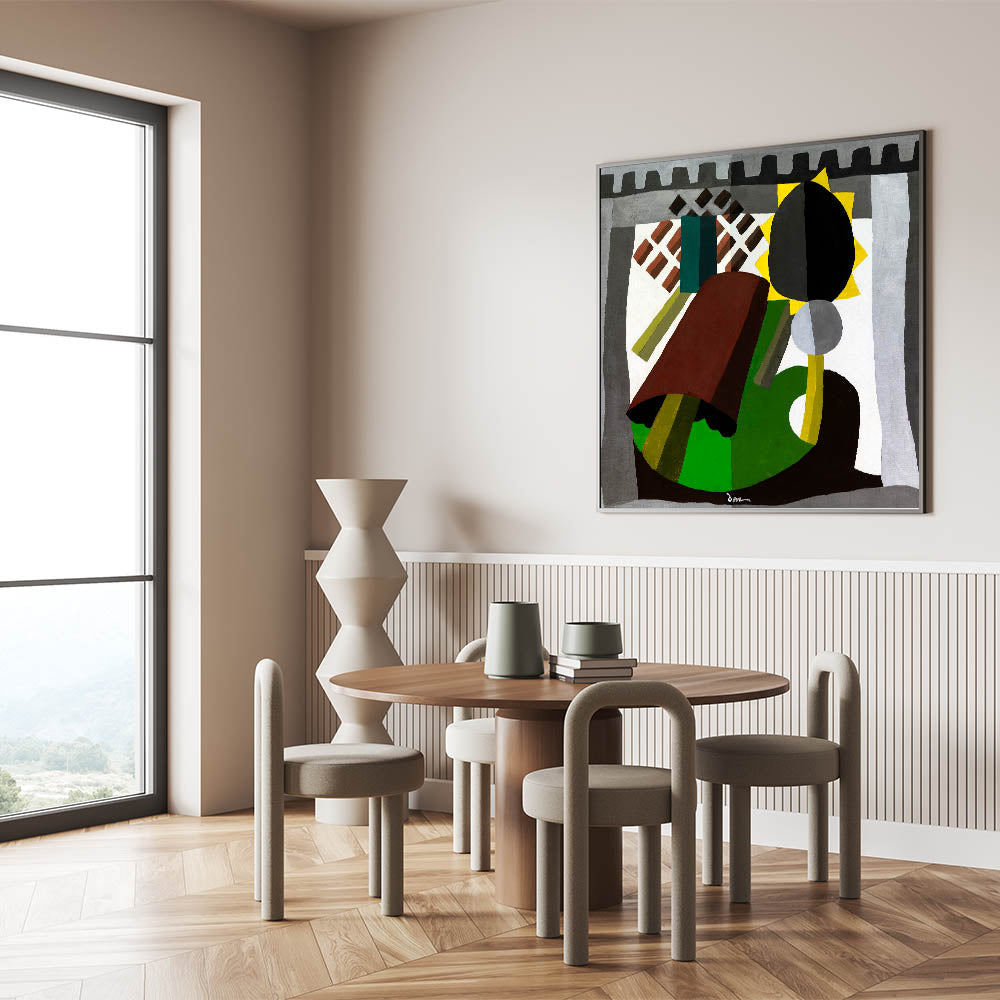 Add a bold, contemporary touch to your space with this abstract representation of an inn. With geometric shapes and rich earthy tones, this artwork invites a sense of modern sophistication into any room. Ideal for those who appreciate minimalist designs, this print combines classic and contemporary elements, making it a versatile addition to your decor.