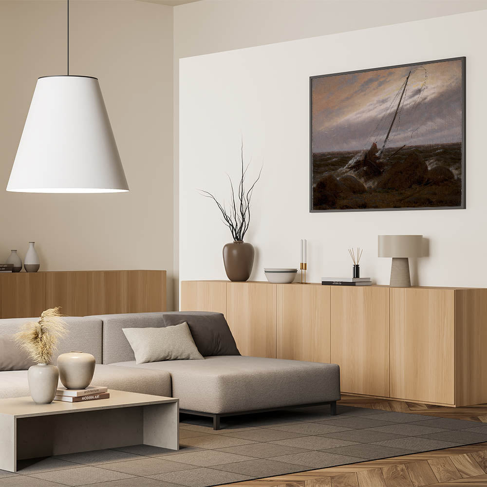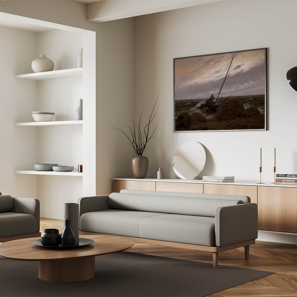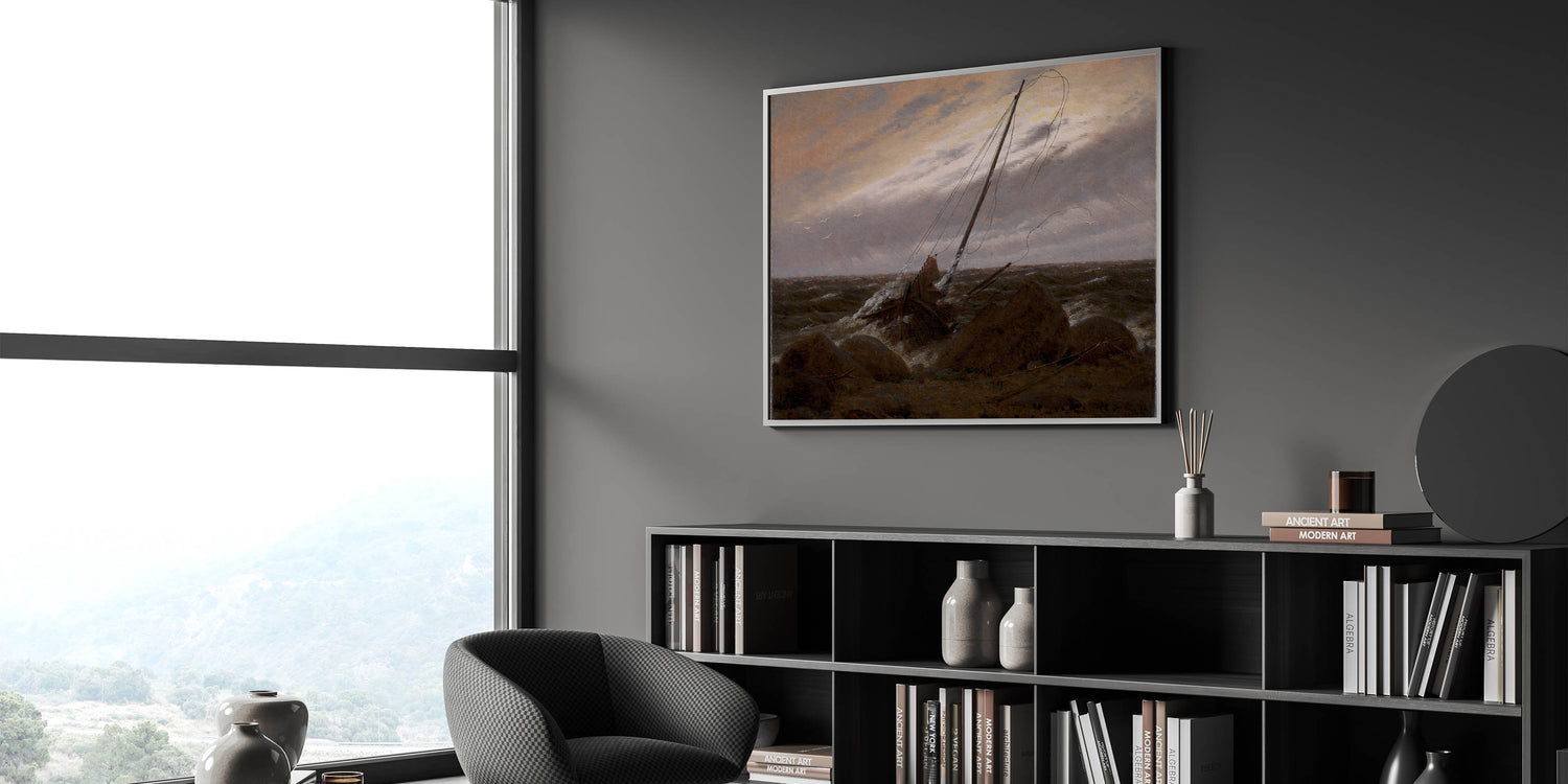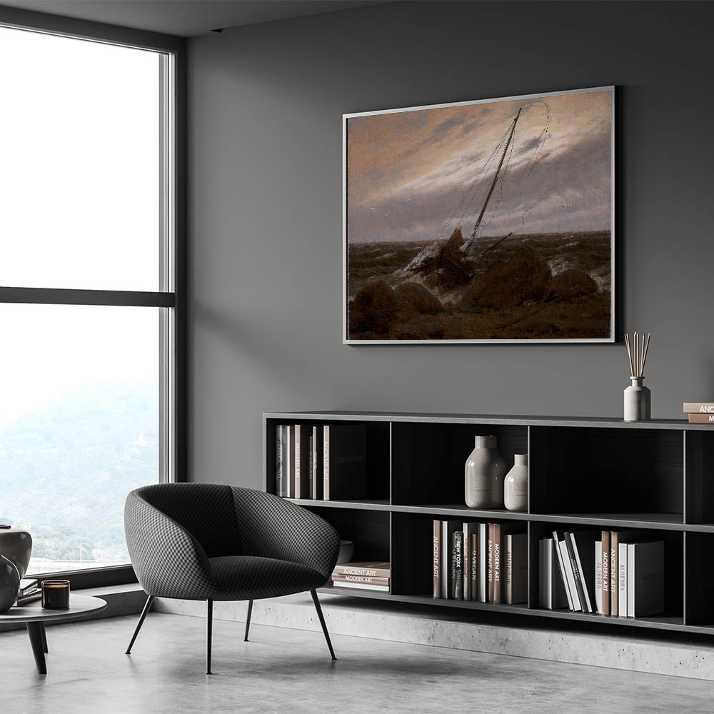 Experience the somber beauty of After the Storm by Caspar David Friedrich, a masterpiece that encapsulates the Romantic era’s focus on nature’s power and human vulnerability. This evocative seascape portrays the aftermath of a fierce storm, with a wrecked ship resting on a rocky shoreline under a moody, turbulent sky. Friedrich’s masterful use of light and shadow creates a haunting yet beautiful depiction of nature’s sublime force.