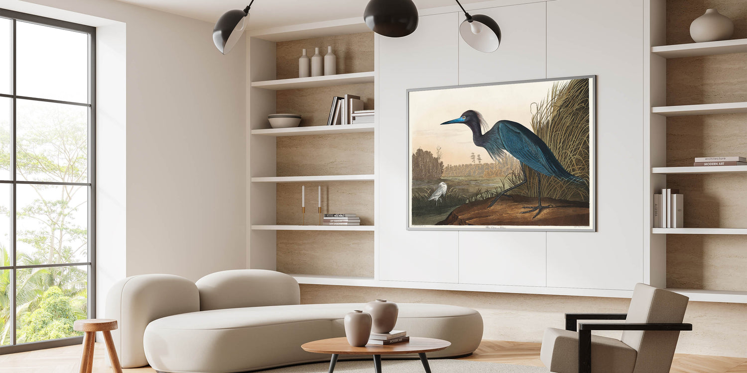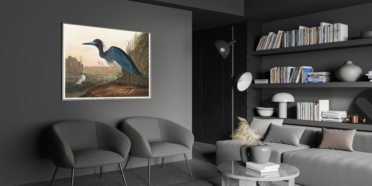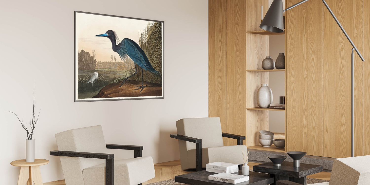 Bring the elegance of Romanticism to your home with this stunning wall art featuring the "Blue Crane or Heron," inspired by John James Audubon's Birds of America (1827). This masterpiece captures the Romantic era’s love for nature and emotional expression through intricate details and soft yet vibrant hues. Perfect for creating a serene atmosphere in any space, this artwork reflects the beauty of historical Romanticism.