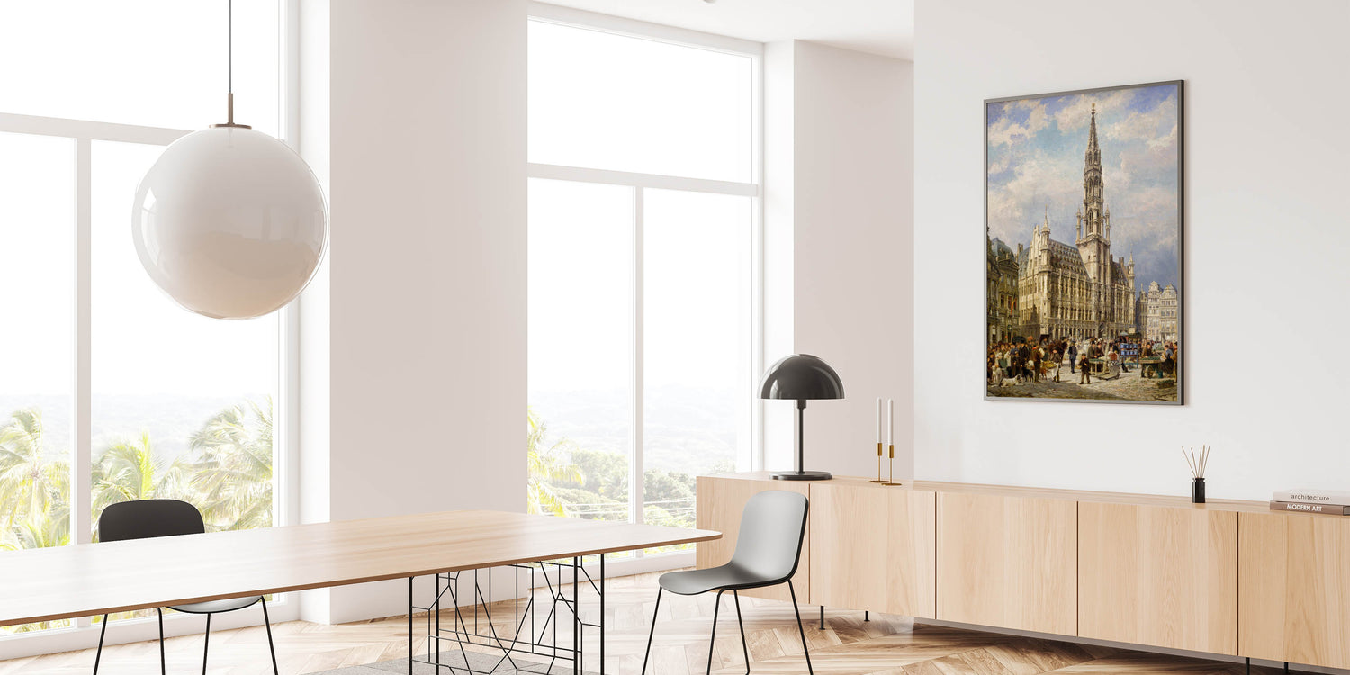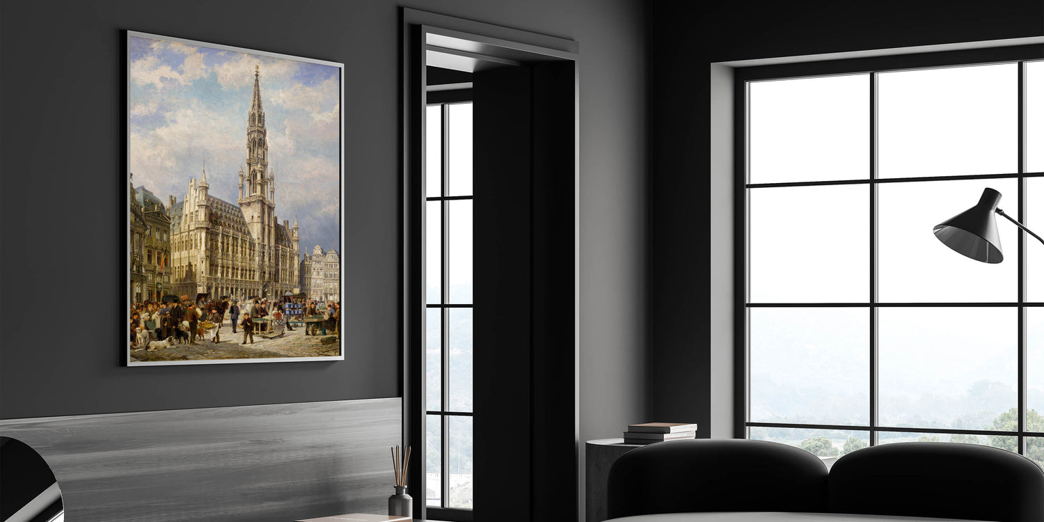 Immerse yourself in the lively charm of Brussels: Grand Place in 1887 by Christiaan Dommershuijzen, a captivating depiction of one of Europe’s most iconic city squares. This Romantic-era painting brings the bustling marketplace to life with meticulous attention to detail, showcasing the stunning architecture of the Grand Place and the vibrant activity of the people below. The artist’s mastery of light and color creates a dynamic, yet harmonious scene that reflects the spirit of the time.