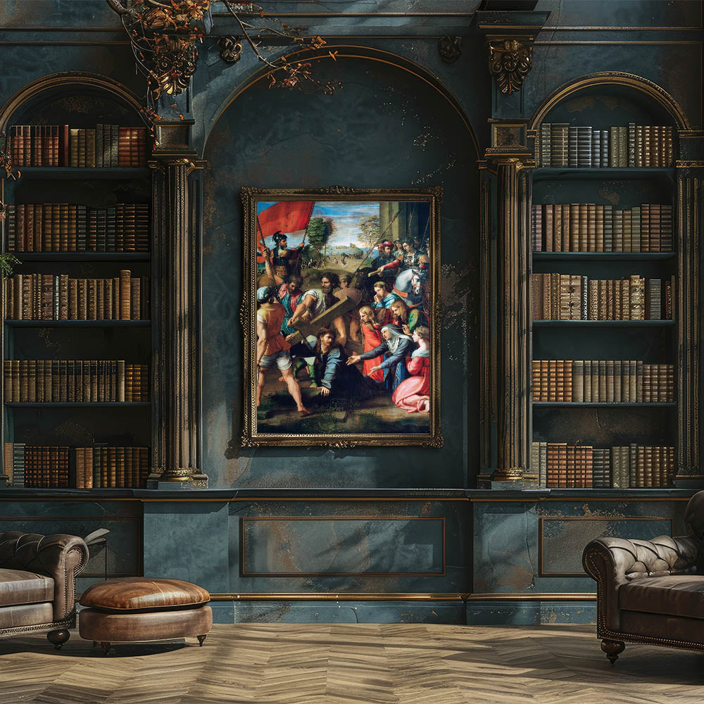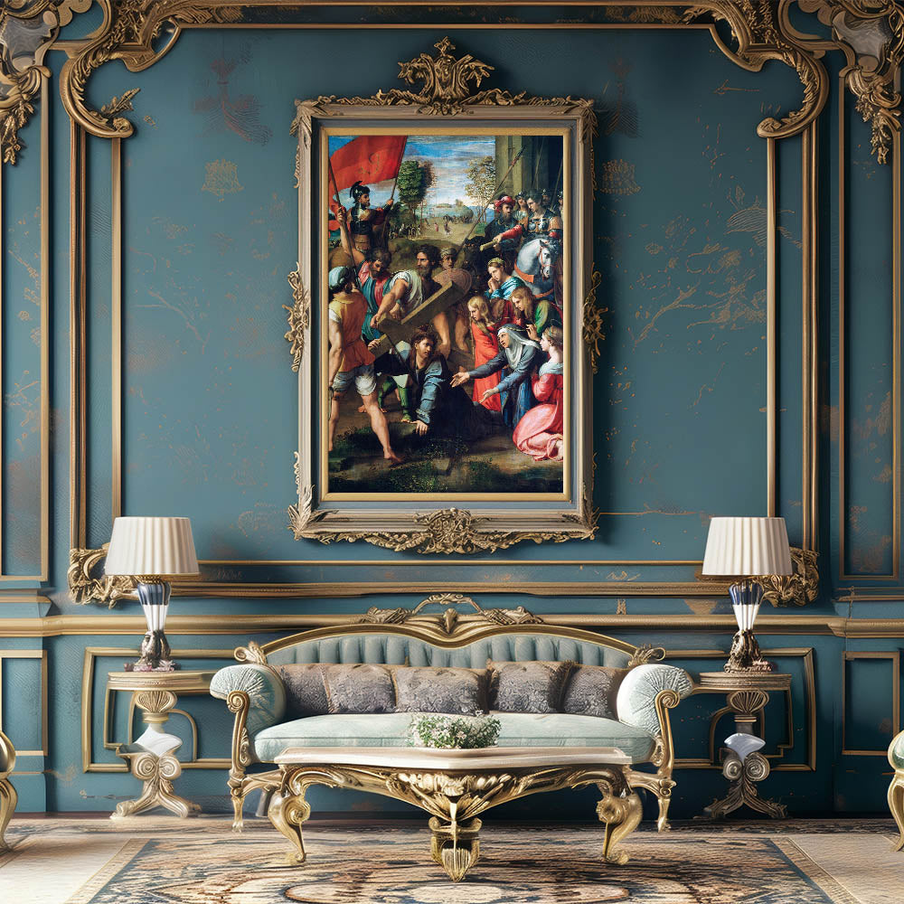 Experience the emotional depth of the Renaissance with Raphael’s Christ Falling on the Way to Calvary. This masterful depiction portrays the poignant moment of Christ’s journey to crucifixion, surrounded by soldiers, followers, and grieving figures. Raphael’s skillful use of color, composition, and detail brings this dramatic scene to life, evoking both sorrow and reverence. The vivid hues and intricate expressions make this artwork a timeless treasure for art lovers and collectors alike.